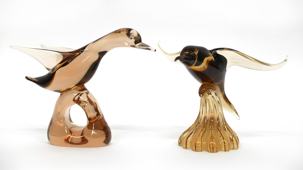 Nason Lotto di due sculture in vetro massello ambrato raffiguranti uccelli....