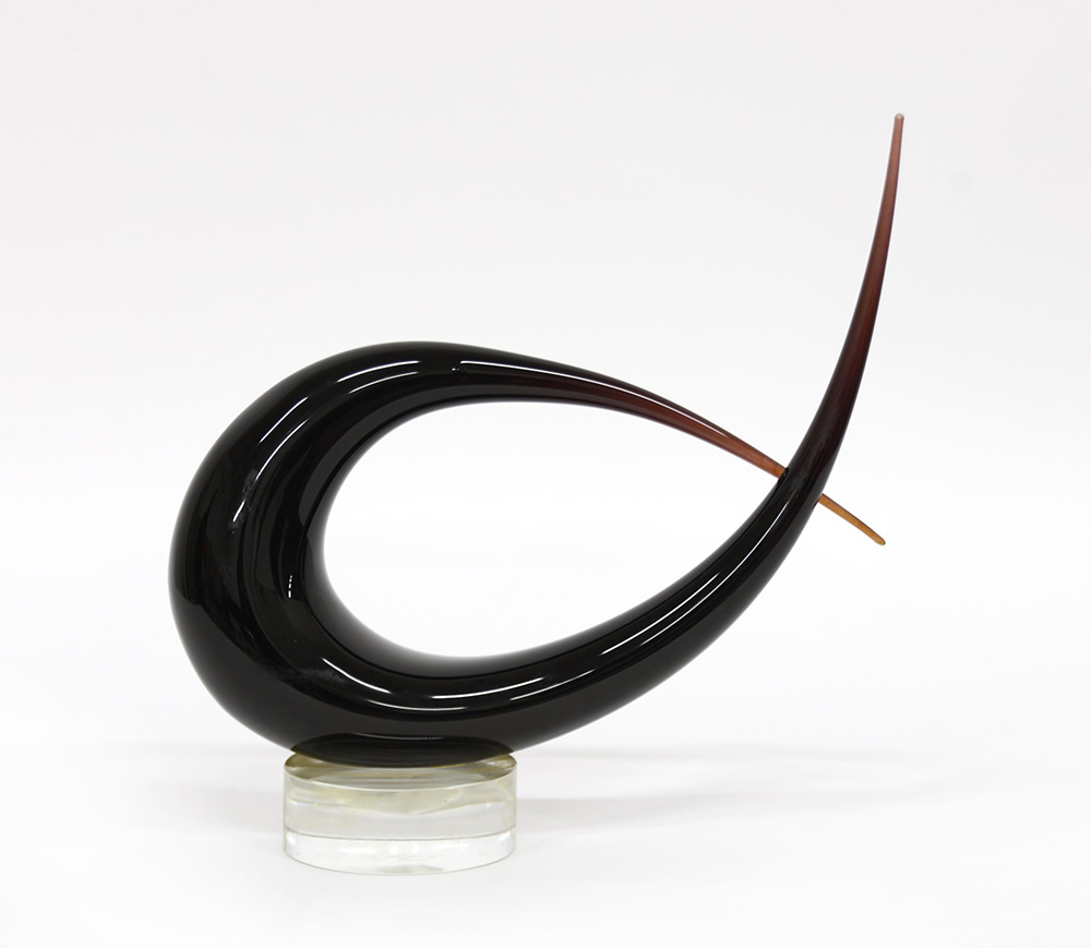 Formia Scultura astratta in vetro massello ametista con base incollata in vetro incolore. Murano, anni 70. Firmata all’acido e a punta sotto la base e recante etichetta della manifattura (l cm 33, h cm 33)