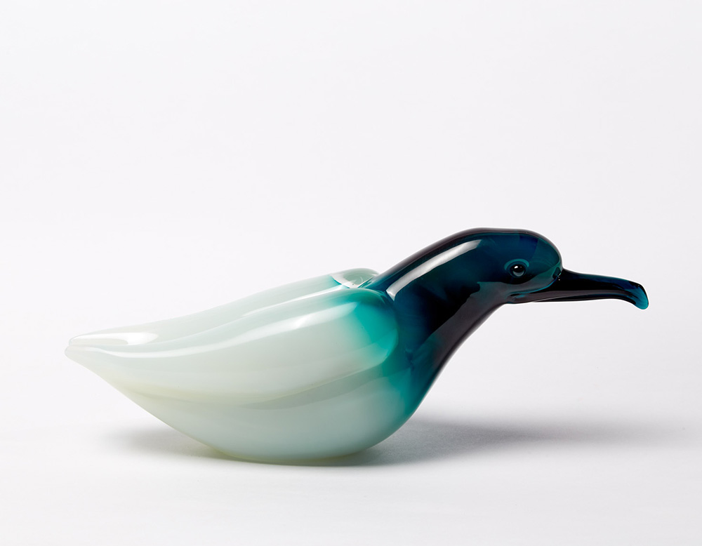 Manifattura di Murano. "Gabbiano". Scultura in vetro sommerso incolore, lattimo e blu oltremare. Anni 50 (l cm 30, h cm 12)