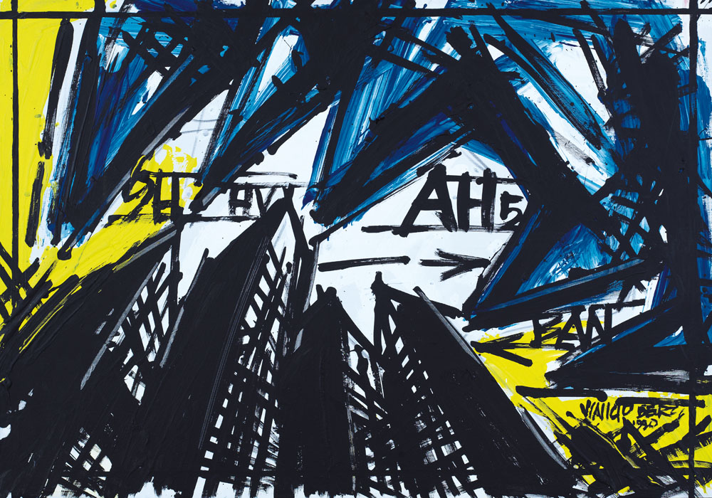 VINICIO BERTI Scandicci (Fi) 11/06/1921 - Firenze 1991 - Grande incontro scontro, 1990, tempera sintetica su tela cm. 70x100, firma e anno in basso a destra, titolo, firma e anno al retro, dichiarazione d'autenticità dell'artista su foto.