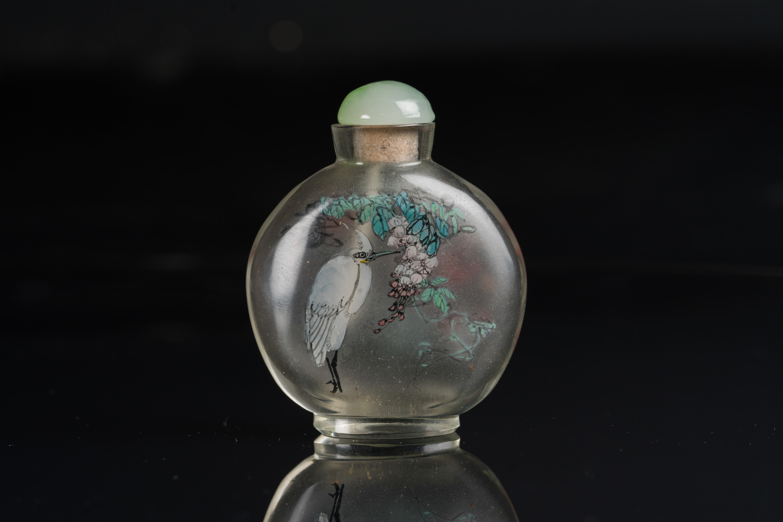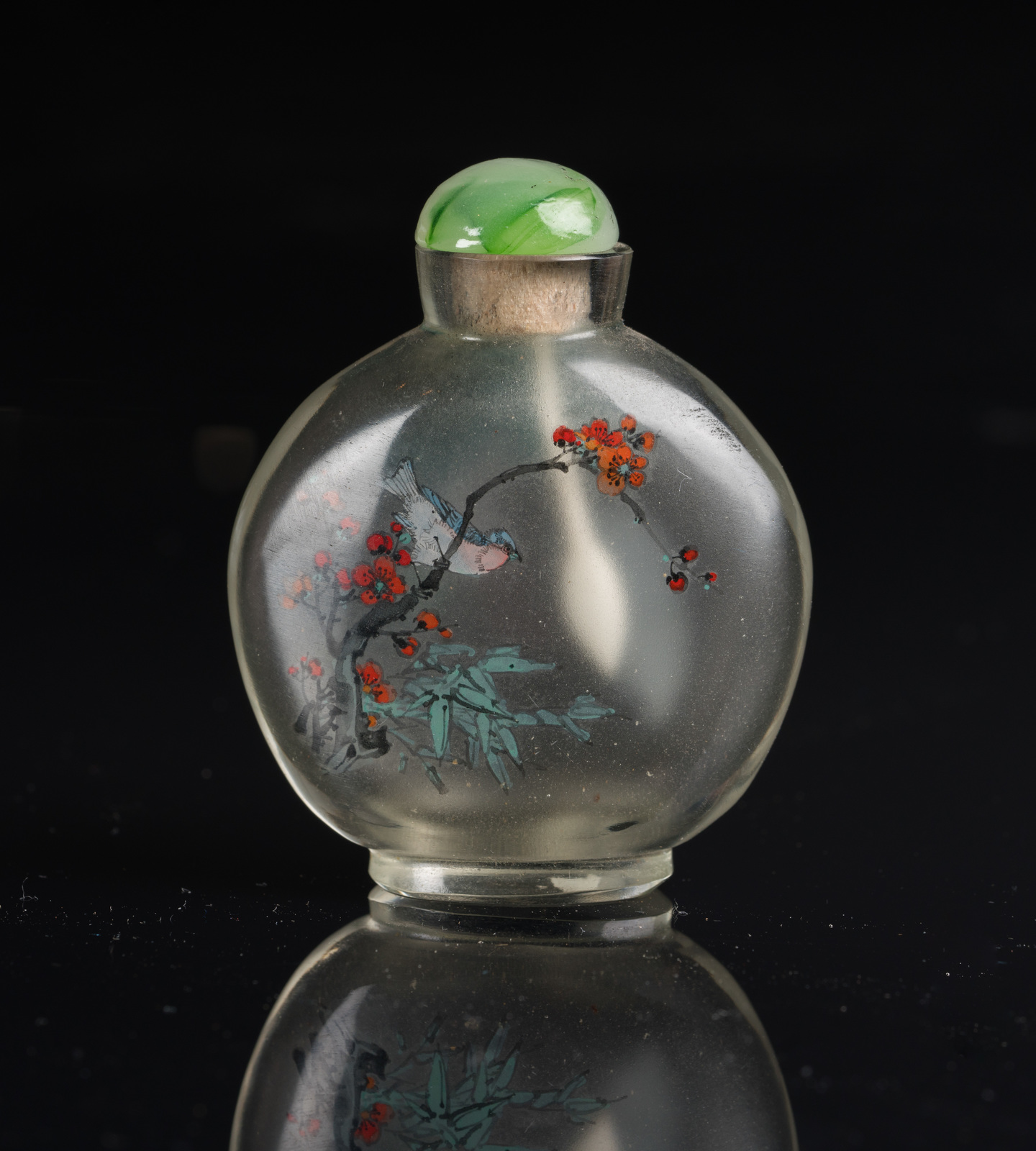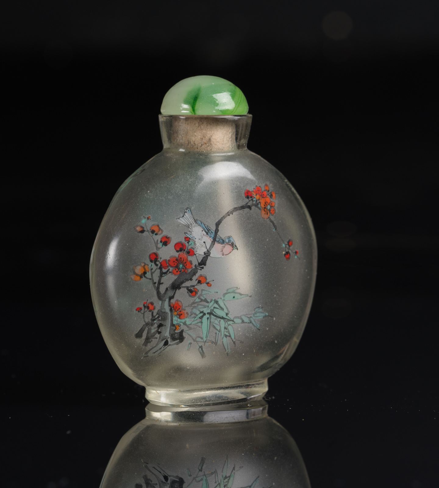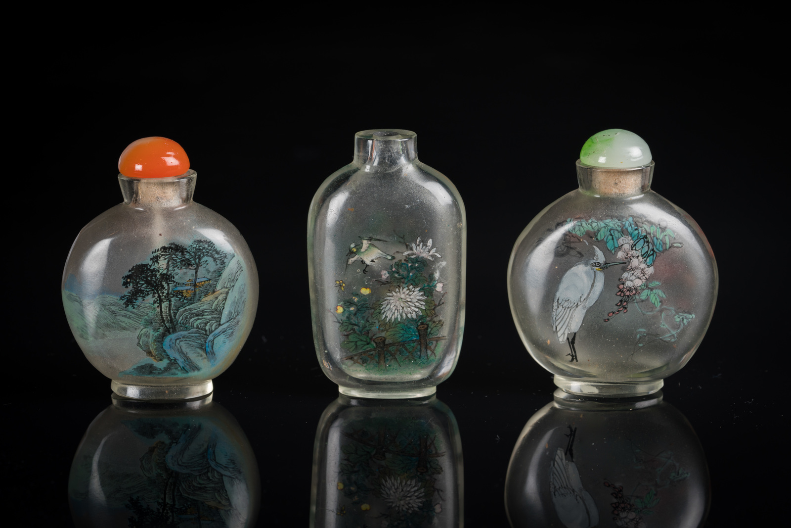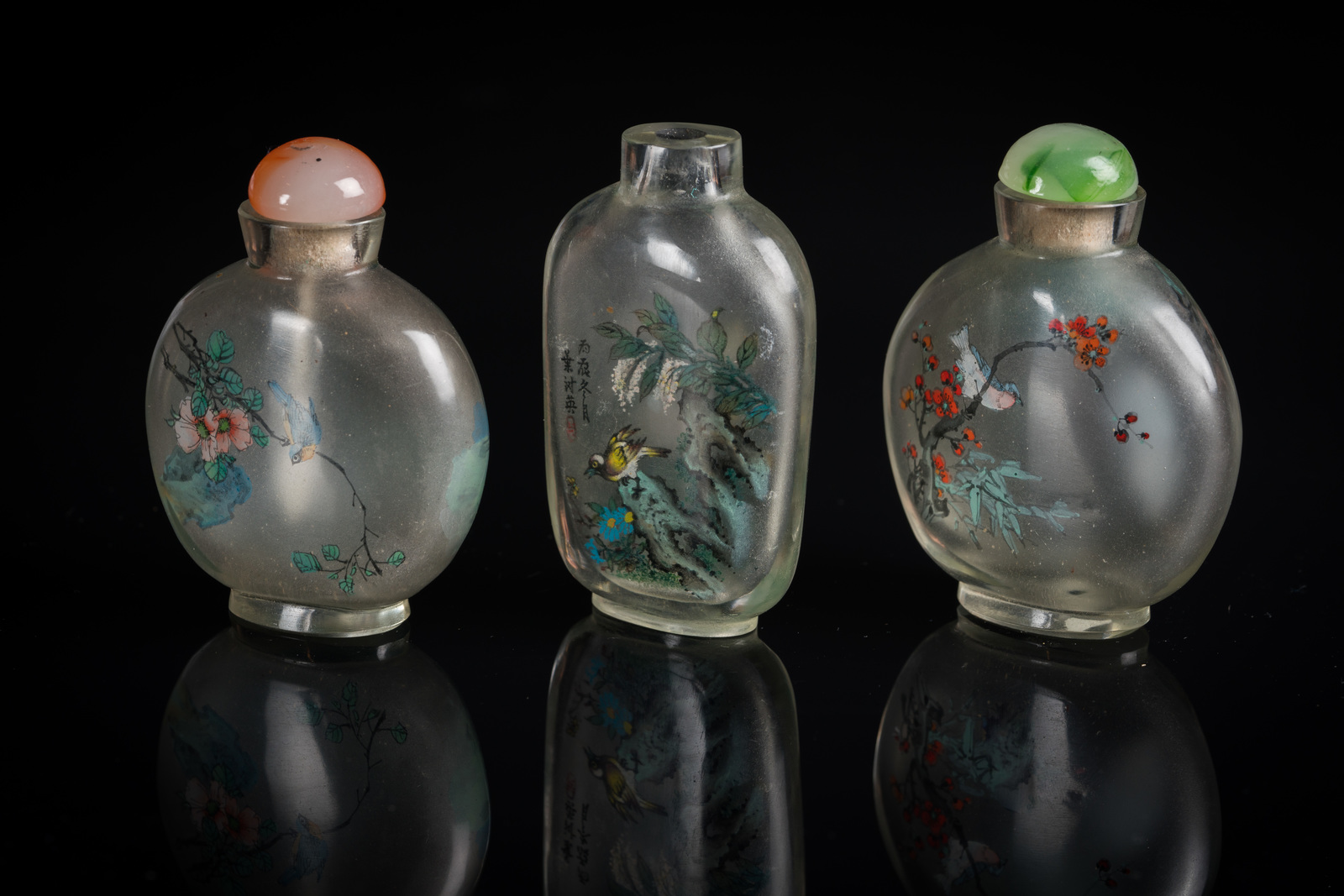 China, 19th century . . Cm 6,50. One (stopper missing) decorated with birds among flowers, inscriptions and seal; one, with jadeite stopper, decorated with birds on blossoming branches (h. 7 cm),; the last one, complete with stopper, painted with lake landscape and bird on a branch.