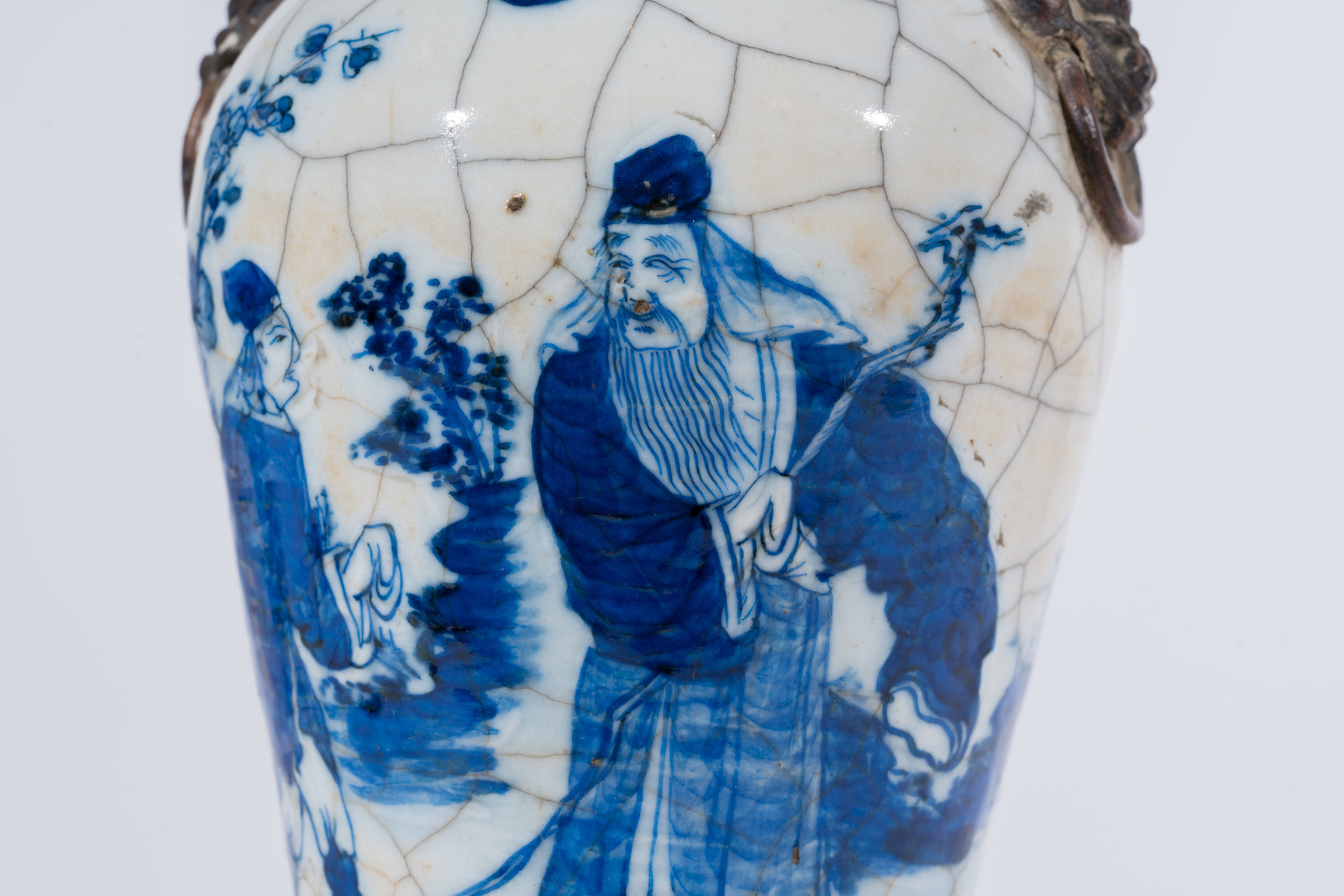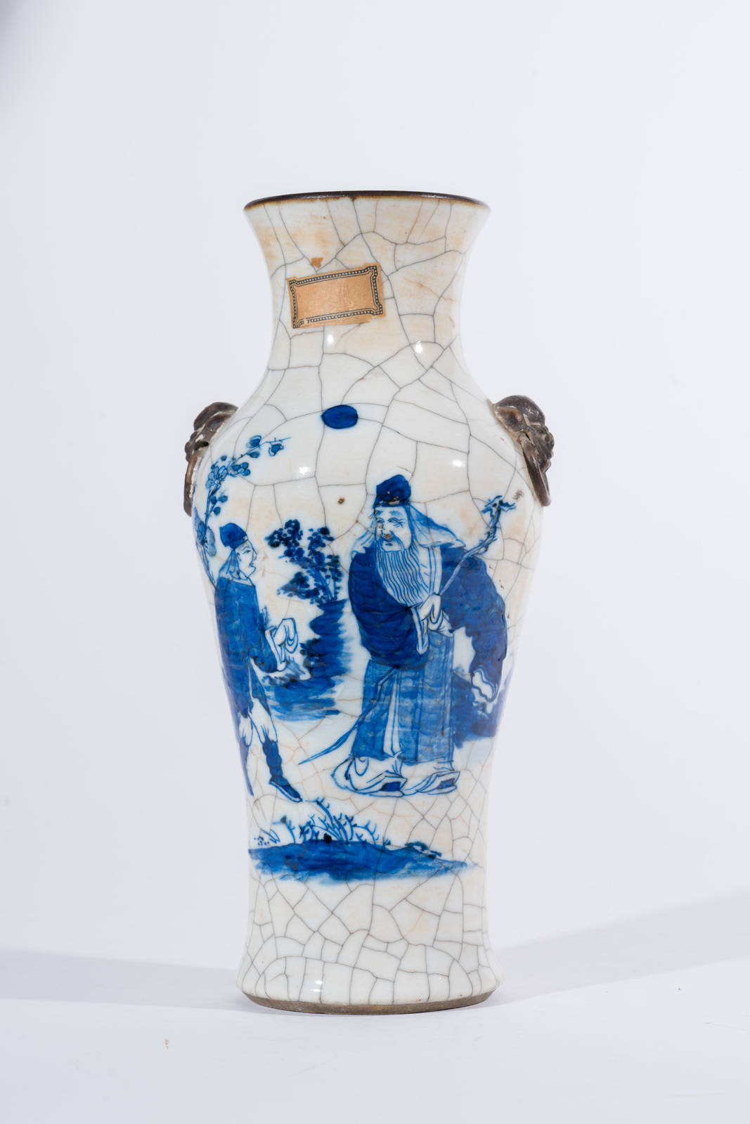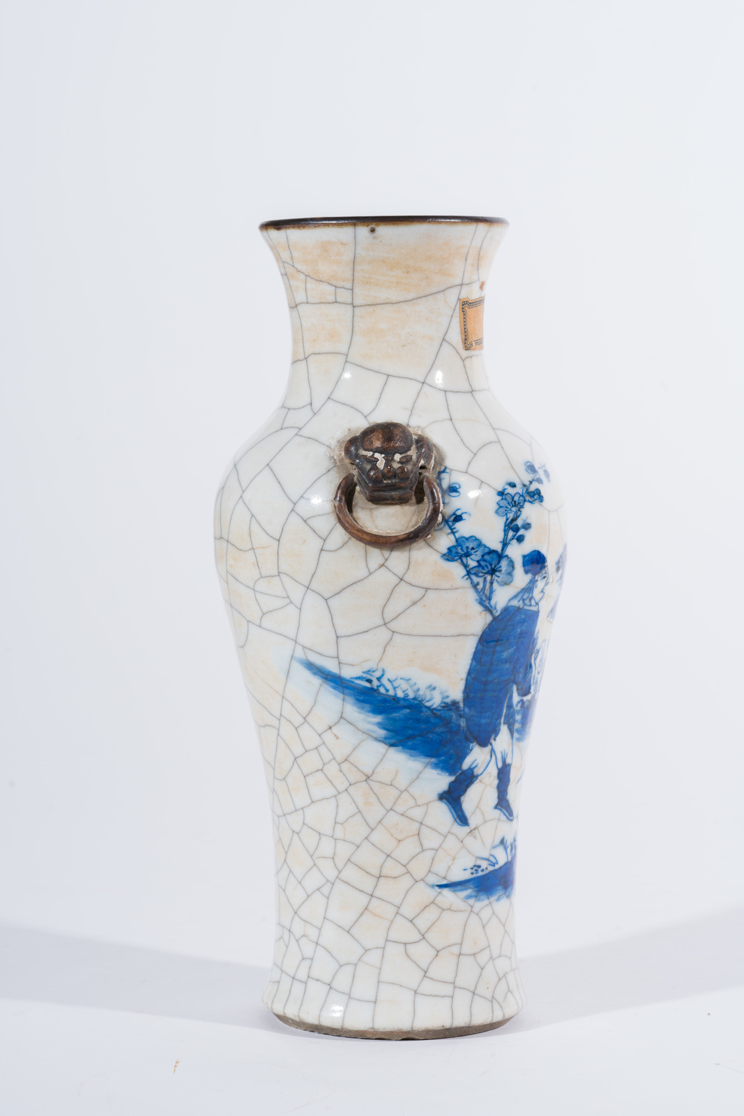 Arte Cinese Vaso in porcellana craquelé decorato con coppia di personaggi dipinti in blu sottocoperta