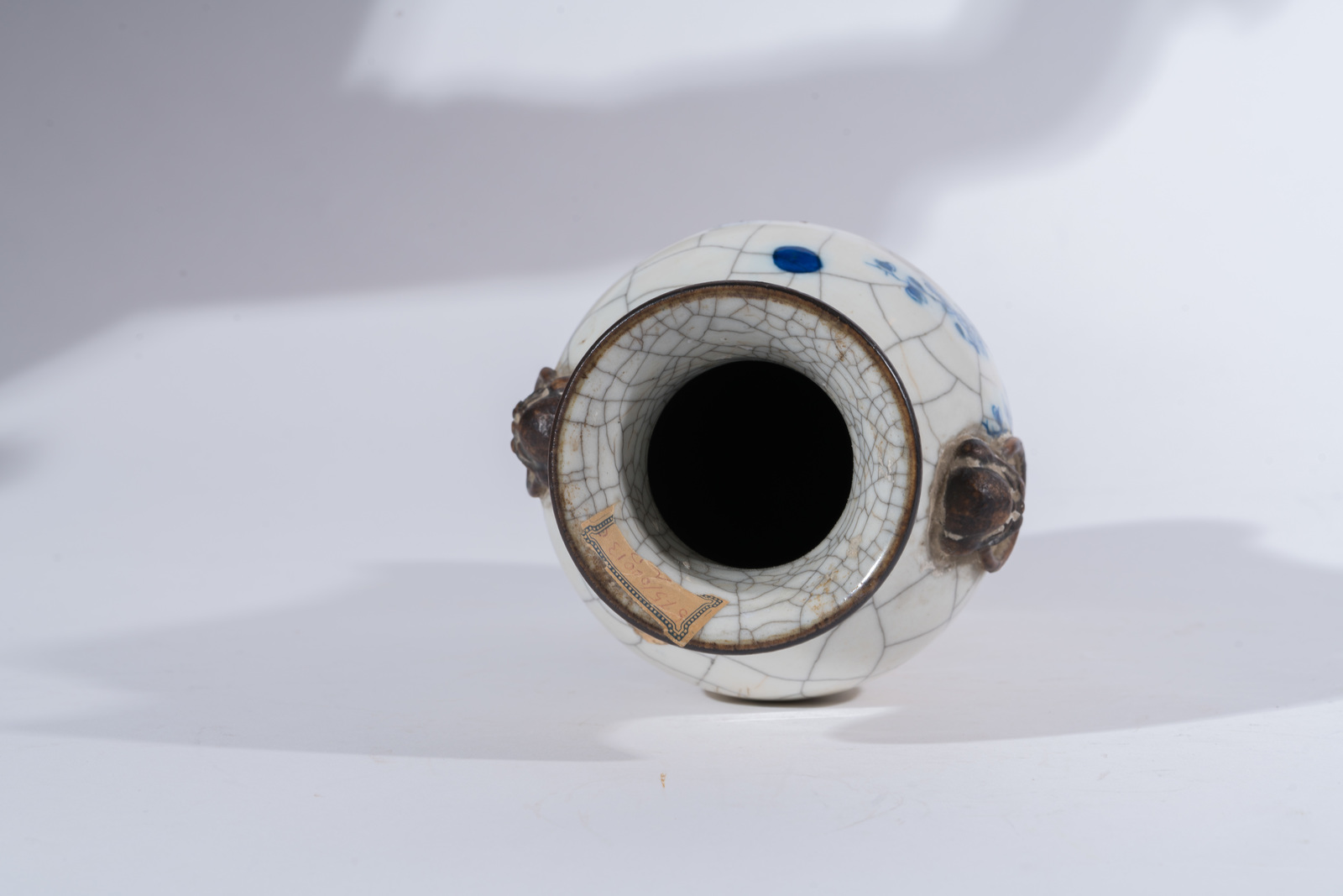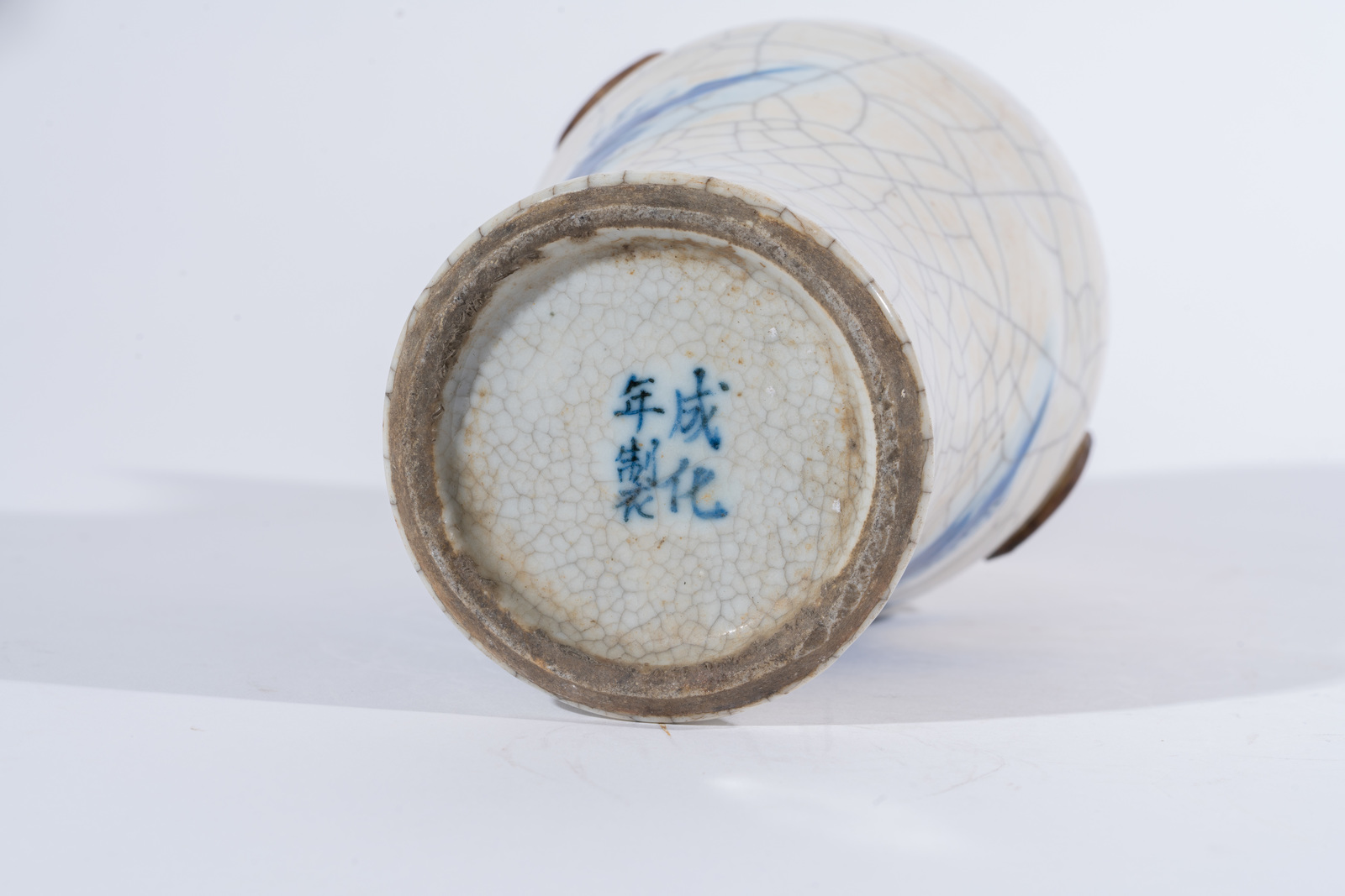 Chinese Art A craquelé porcelain vase decorated with characters painted in underglaze blue and two zoomorphic handles. Bearing a Chenghua four characters mark at the base.