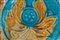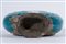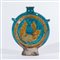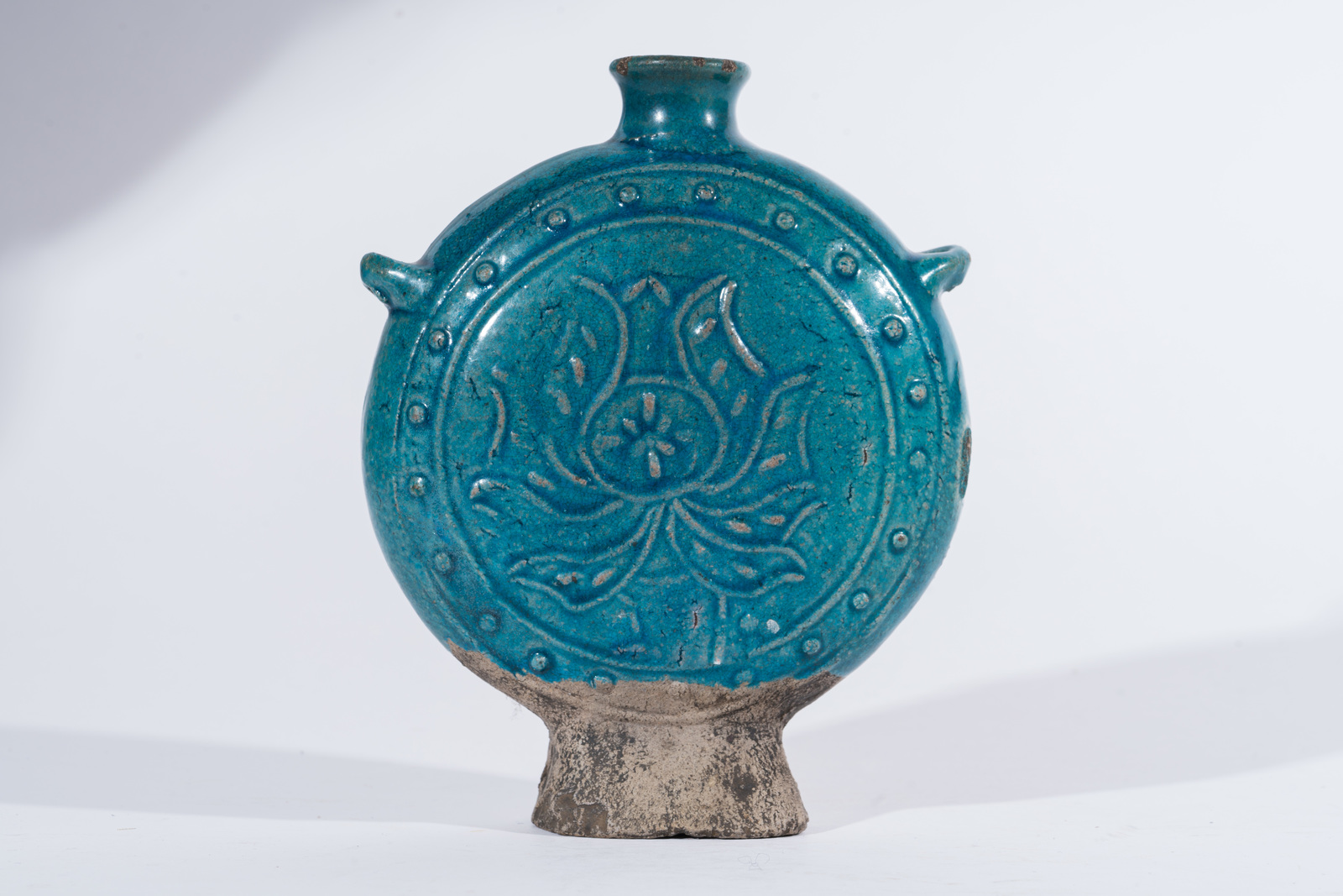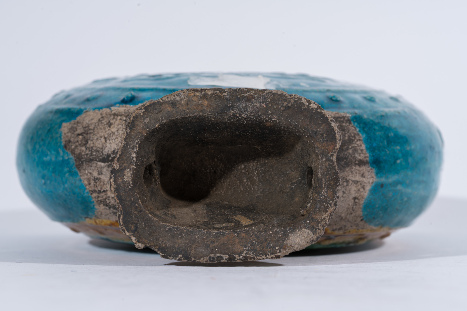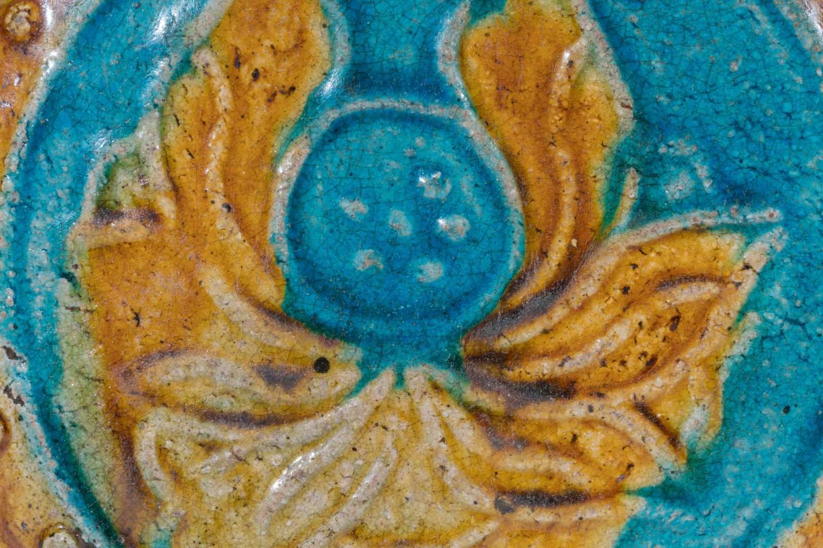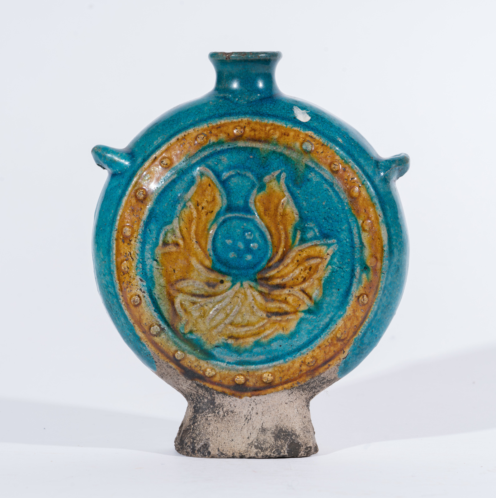 Cina, dinastia Ming. -. Cm 13,50 x 17,00. Poggiante su ovale, le due facce stampate con una peonia ed invetriate di color ocra su sfondo turchese.