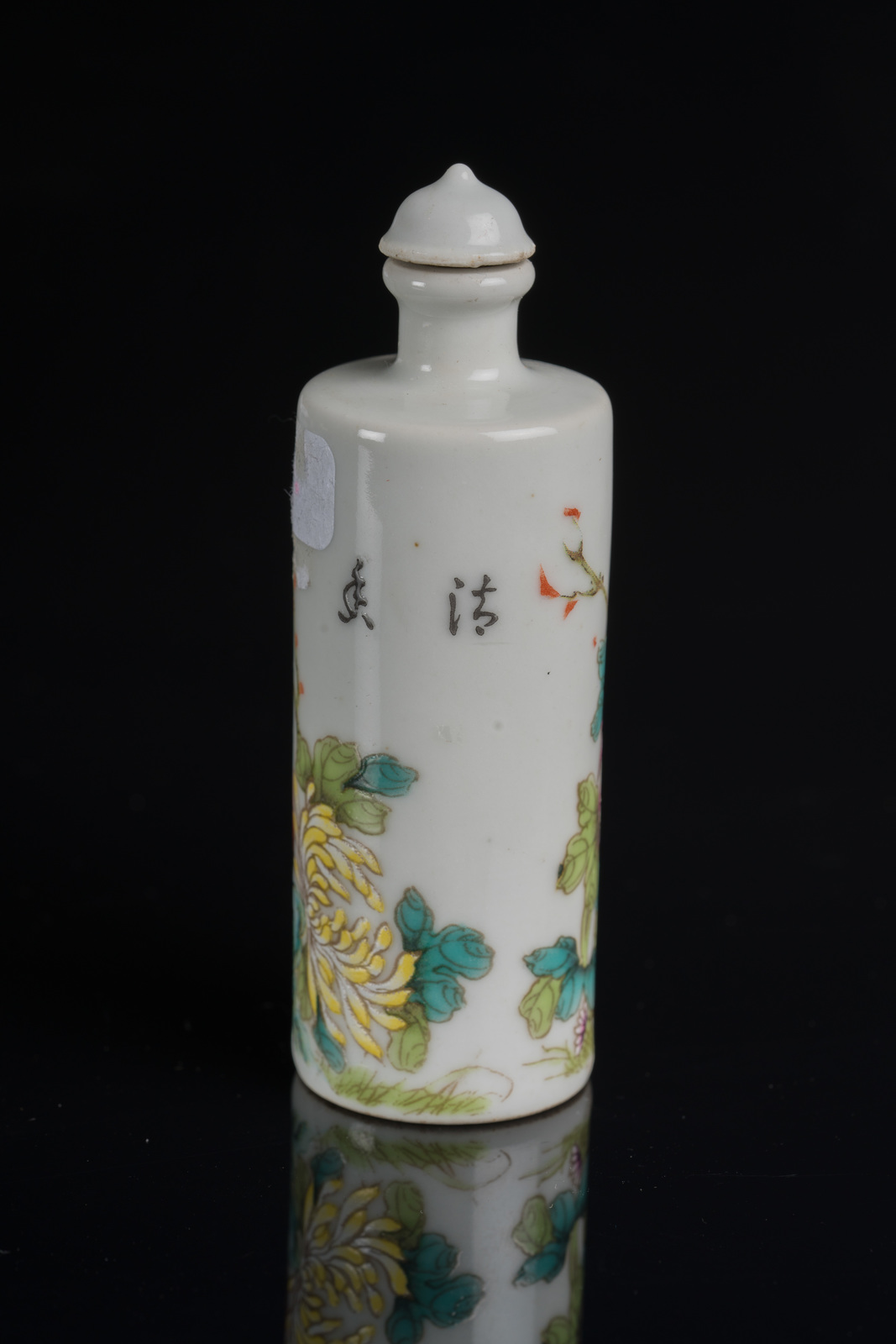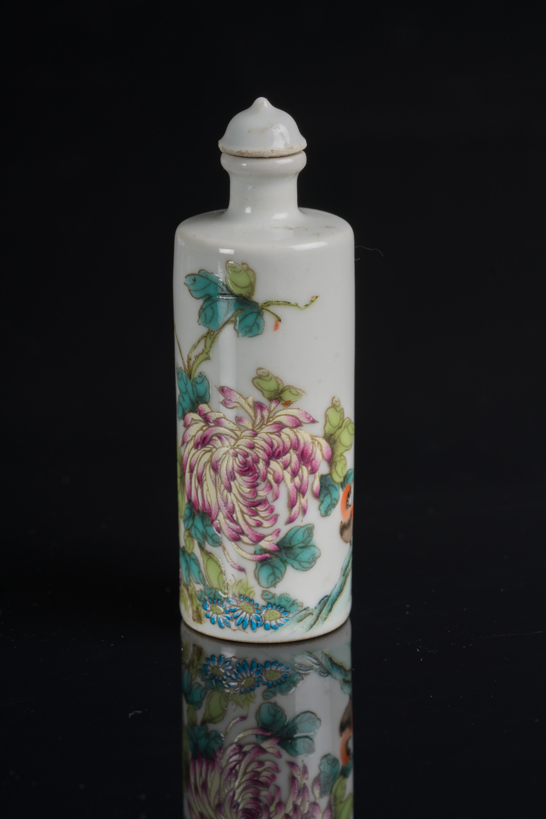 Arte Cinese Tabacchiera a rullo in porcellana dipinta con uccello tra fiori ed iscrizioni