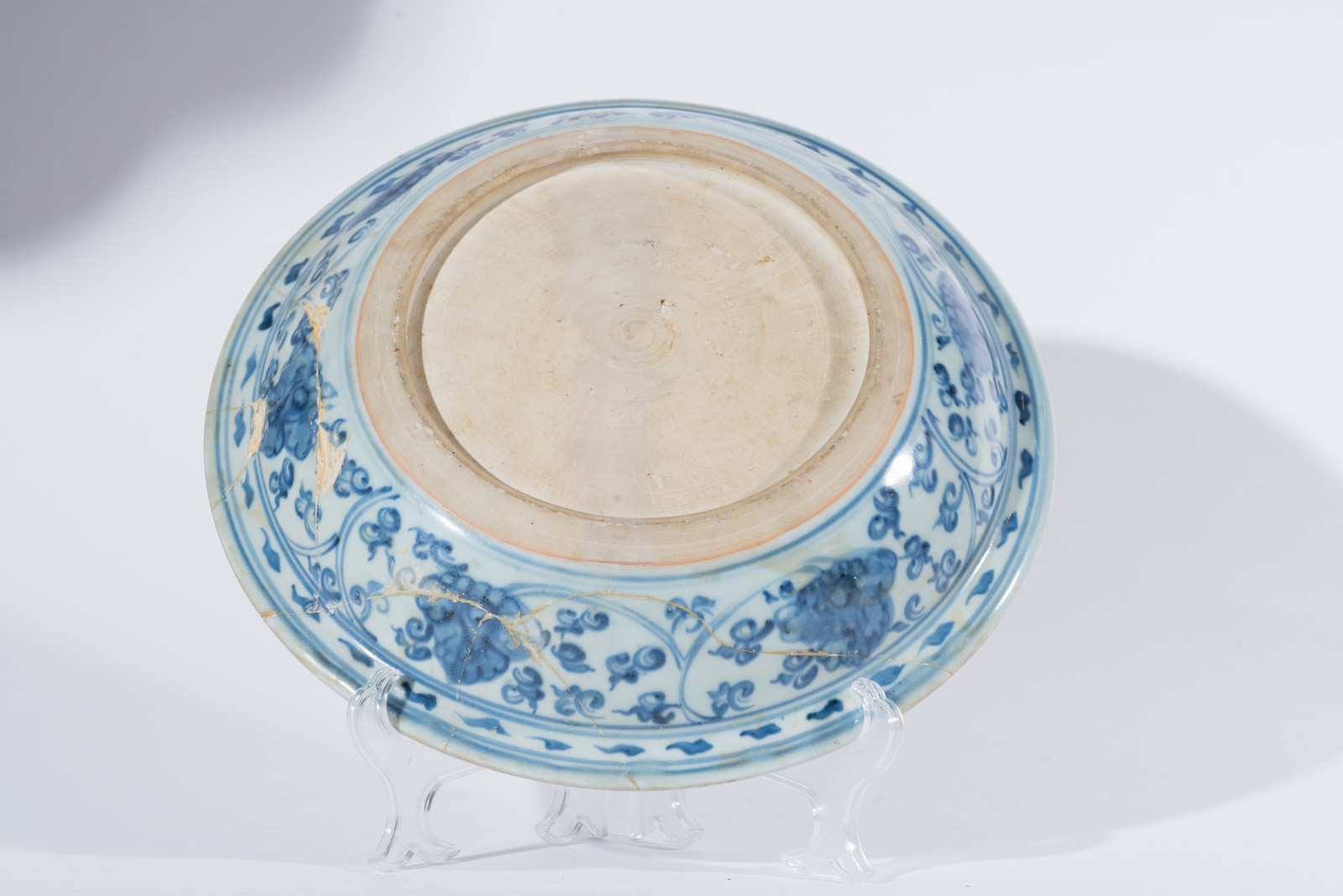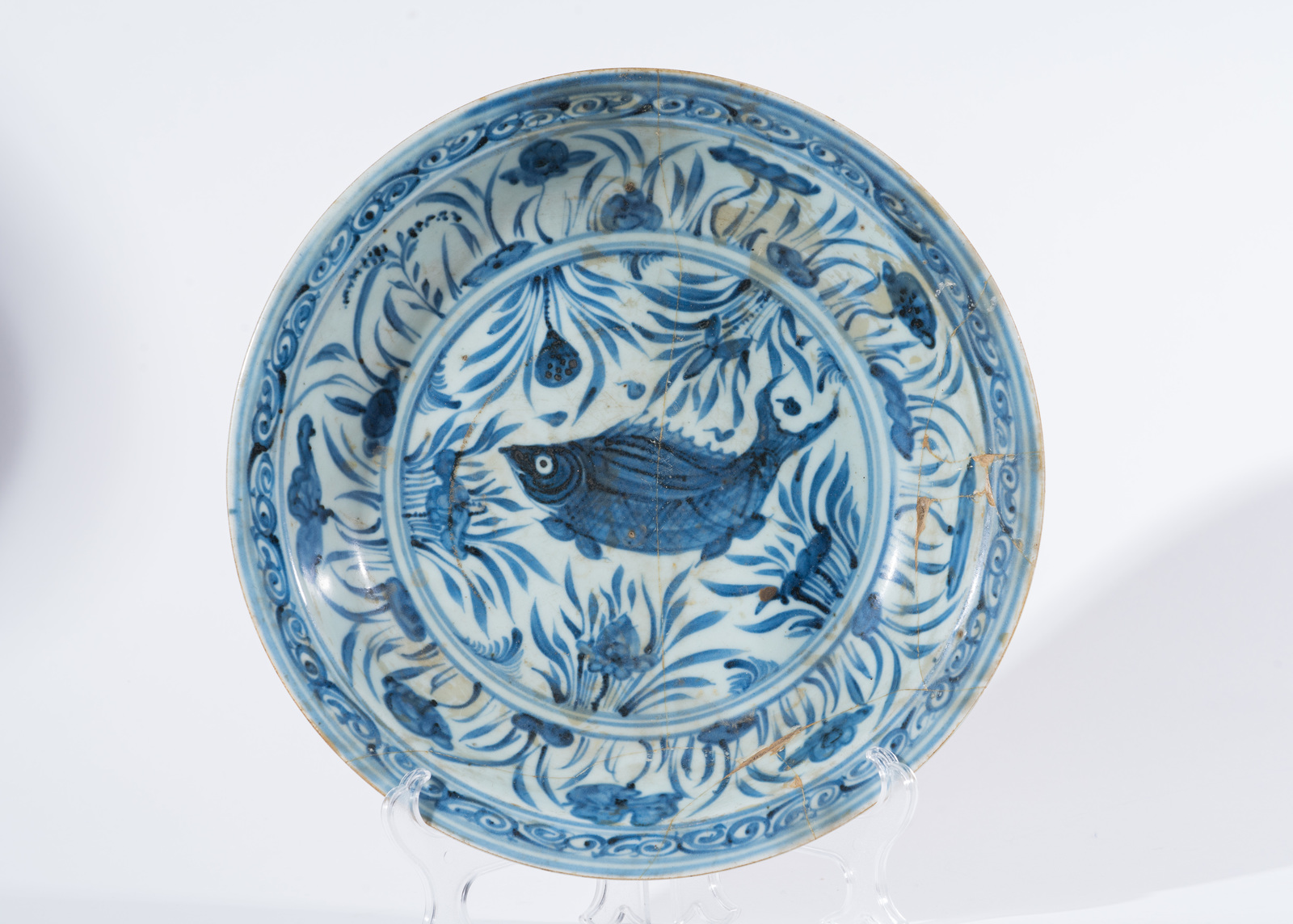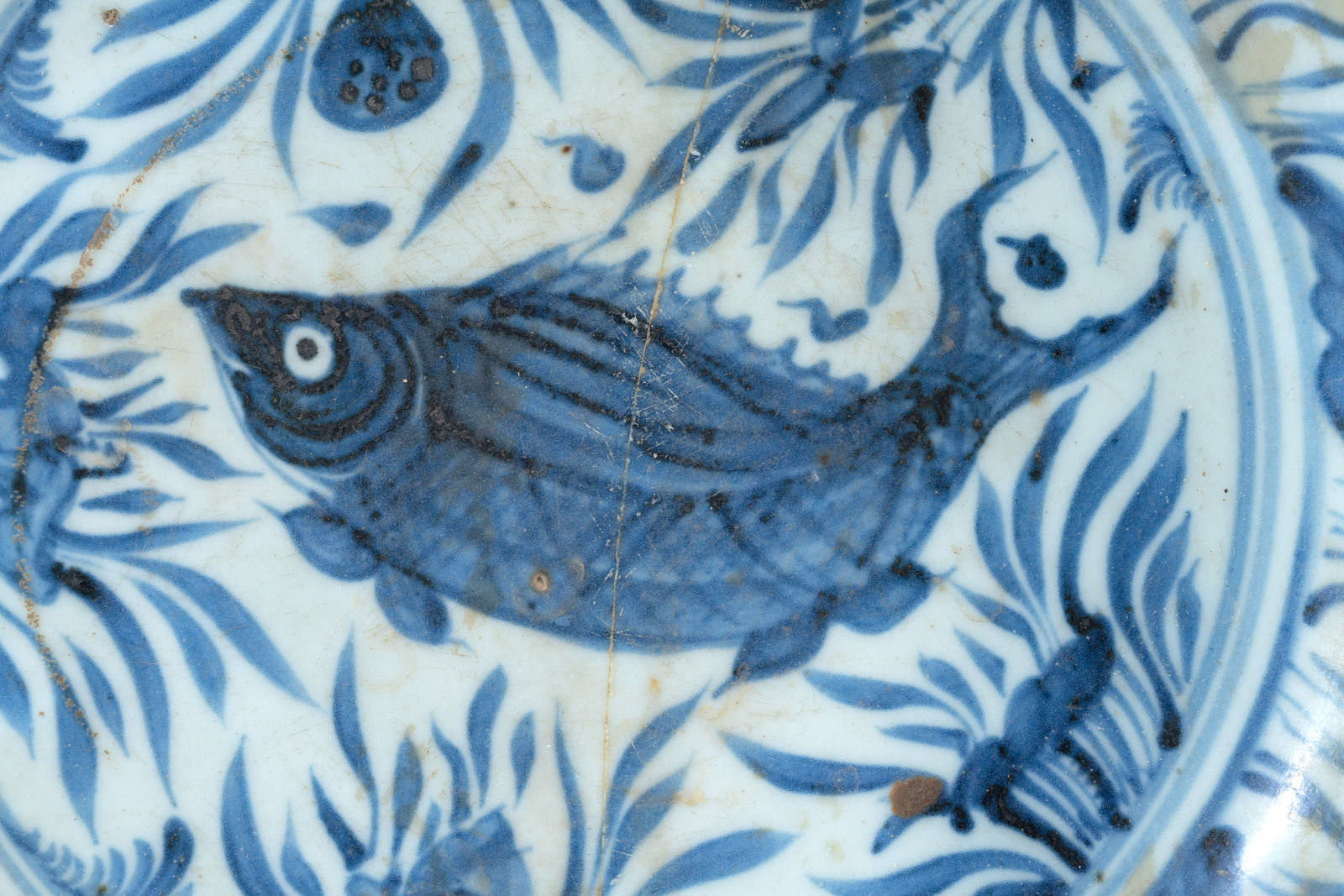 Chinese Art A pottery blue and white pottery dish painted with fish in pond