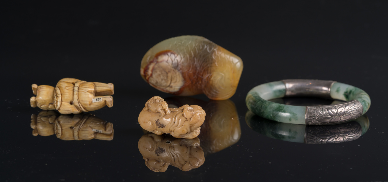 China, Qing dynasty, 18th - 19th century . . Cm 6,50. Including a toggle figure of a man (5 X 2,5 cm); a pale green jade carving of a fish (l. 6,5 cm); a jade bracelet with silver fittings incised with vegetal motifs (diam. 8 cm) and a small soapstone carving of a Pho dog (l.4 cm).