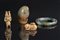 Chinese Art Lot composed of a Chinese toggle, a jade carving, a soapstone carving and a jade and silver bangle