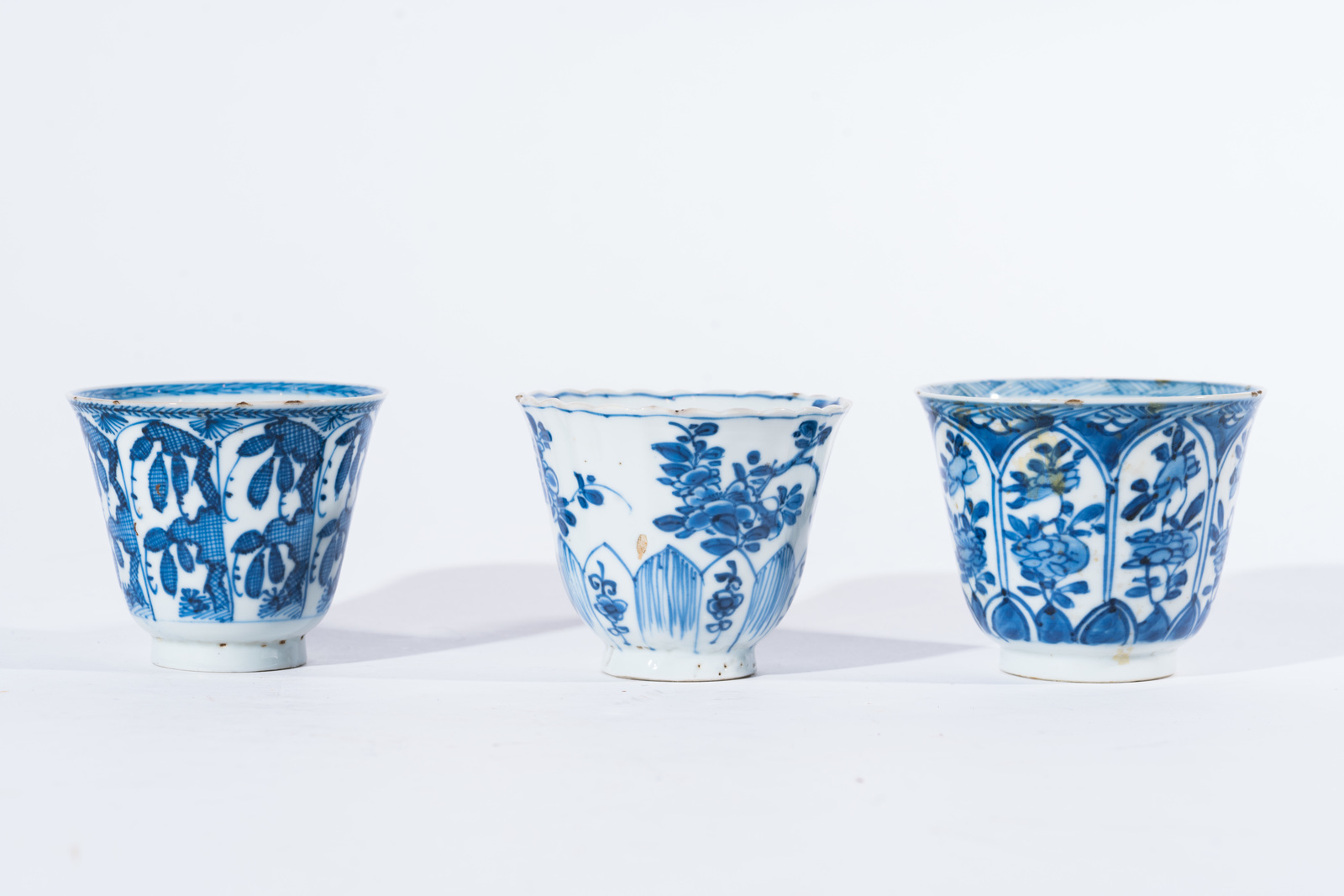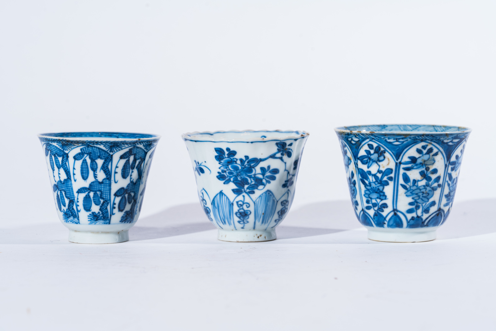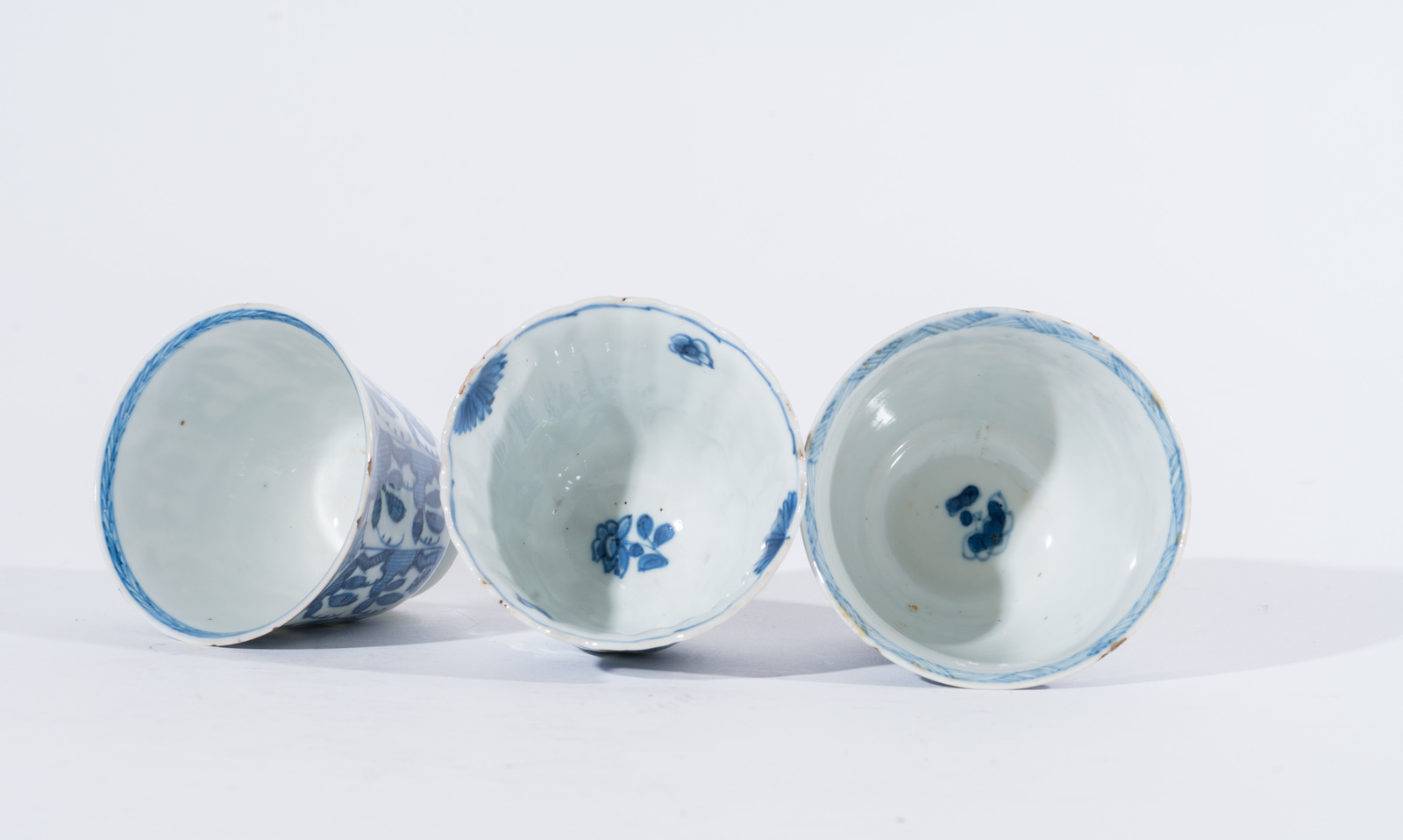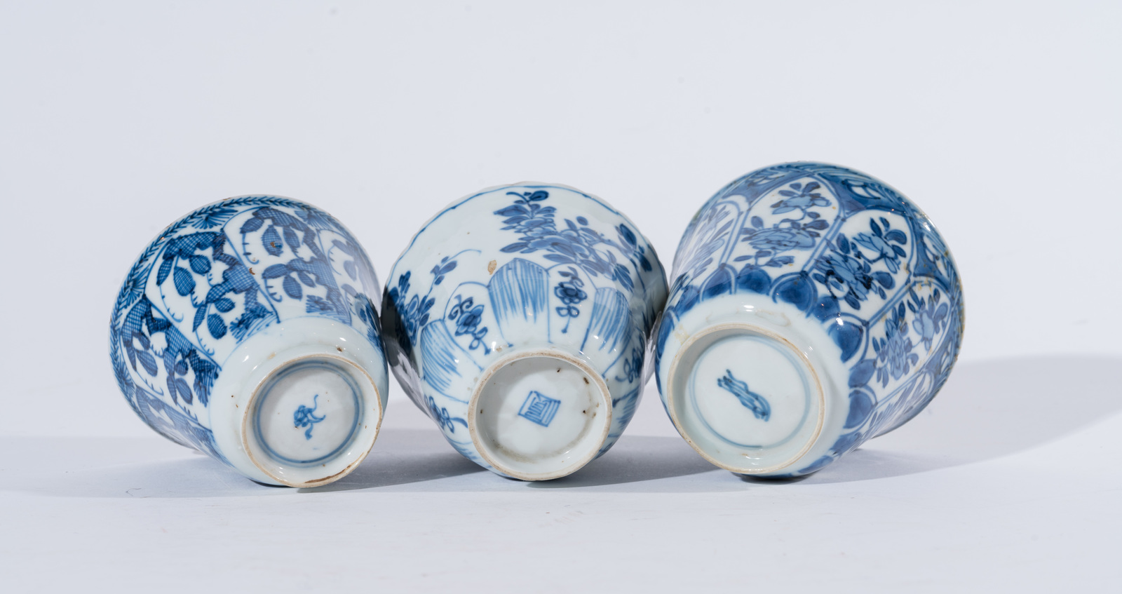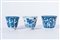 Chinese Art Three blue and white porcelain cups painted with floral elements and bearing figural marks at the base