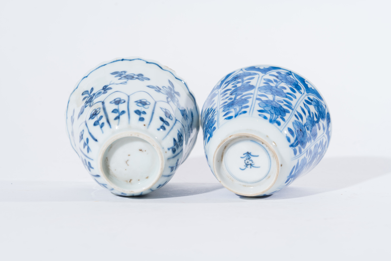 Cina, inizi dinastia Qing, XVII secolo . -. Cm 7,00. Una delle due presenta corpo baccellato e bordo sagomato, L'altra presenta decoro a riserve floreali e marchio sul fondo. Altezza rispettivamente cm 7 e cm 6,5-diam cm 8,3 e cm 8.