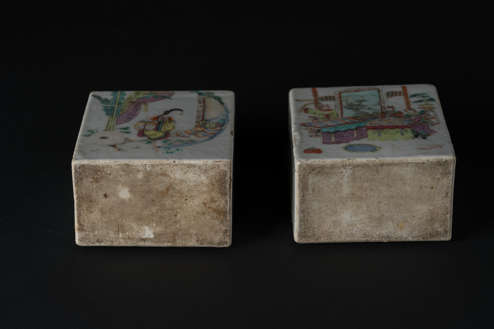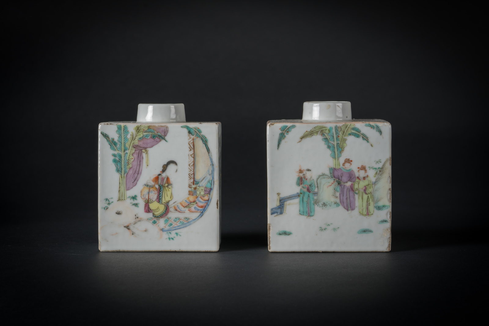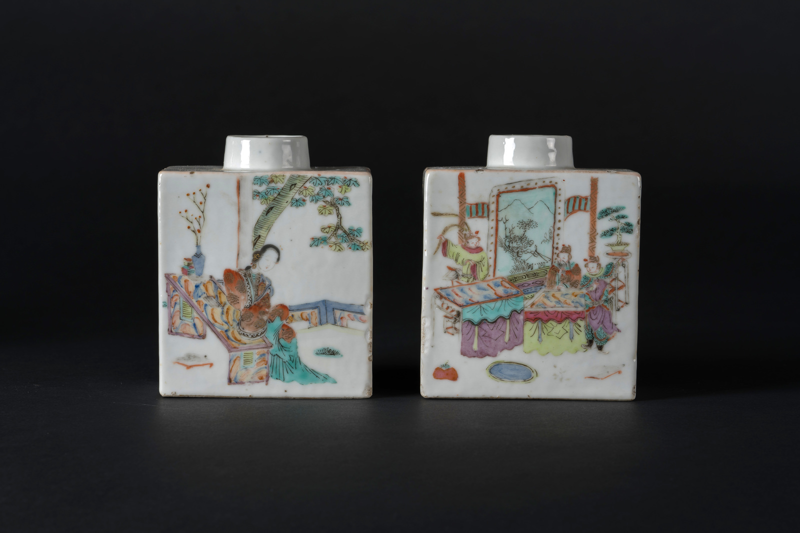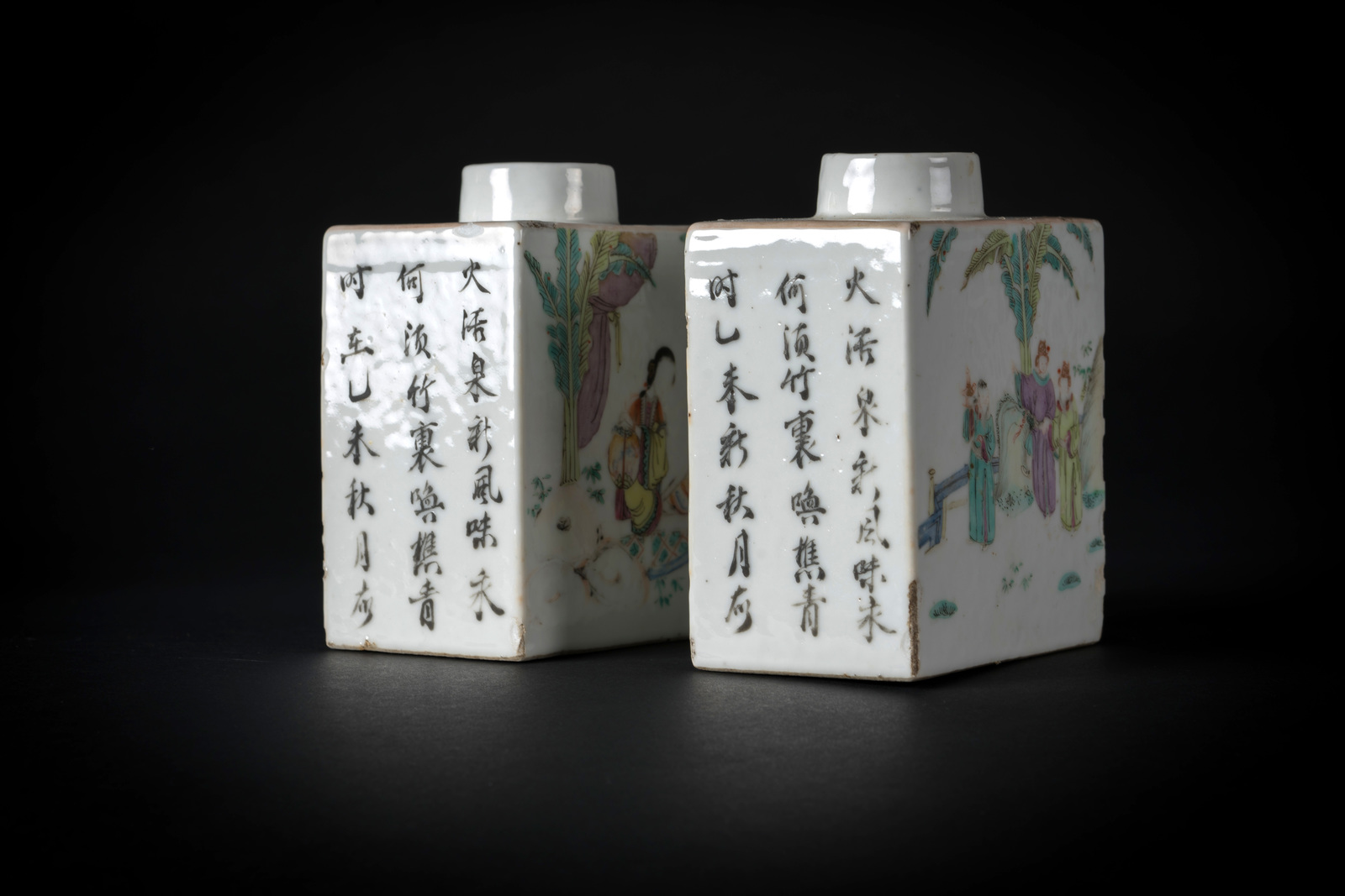 Arte Cinese Coppia di vasi squadrati in porcellana dipinti con personaggi in esterno ed iscrizioni Cina, periodo Repubblica. -. Cm 9,60 x 12,00.
