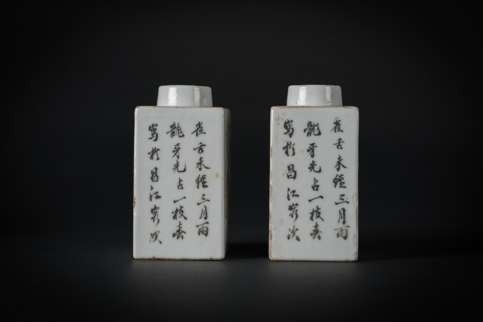 Chinese Art A pair of square porcelain vases painted with characters and inscriptions