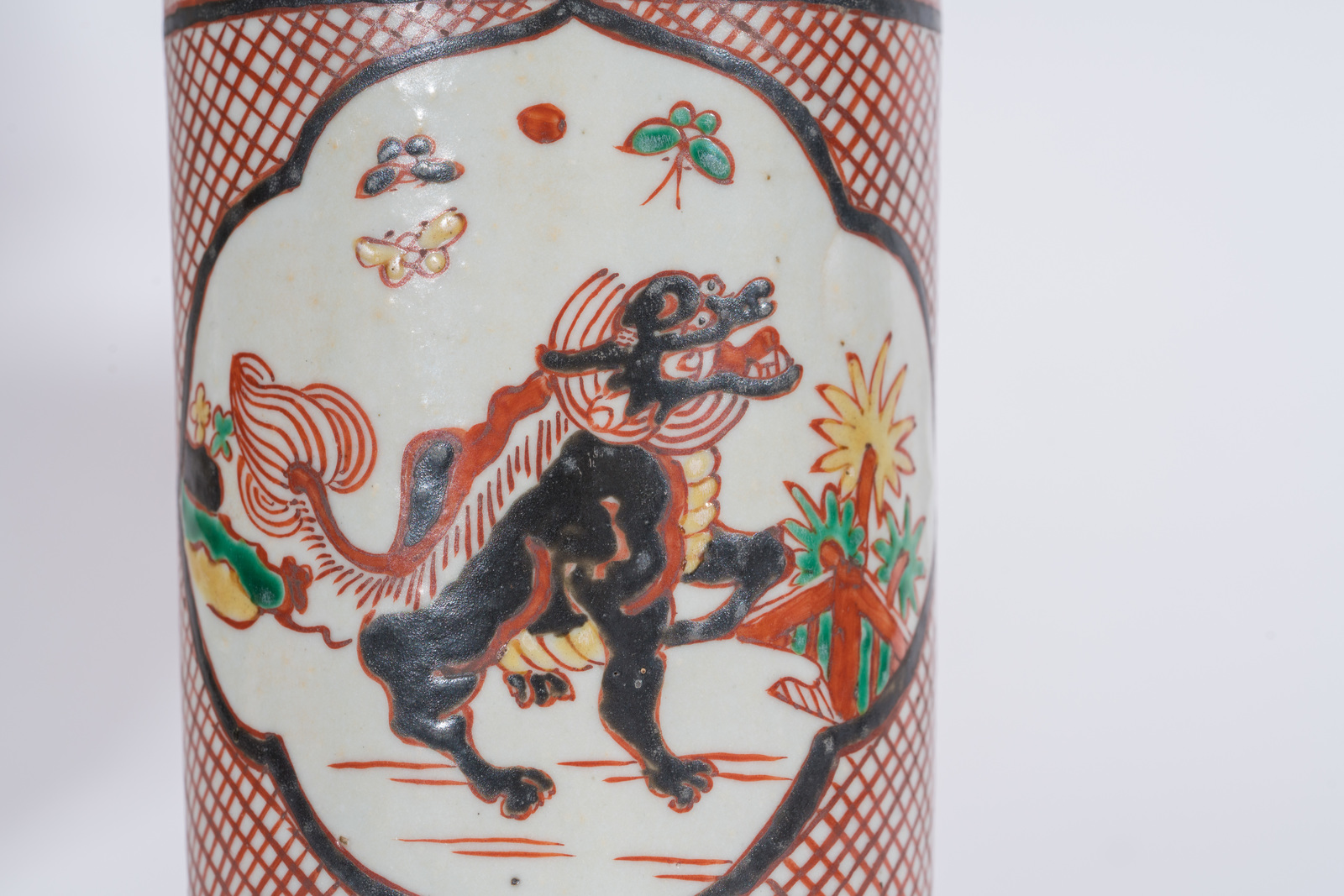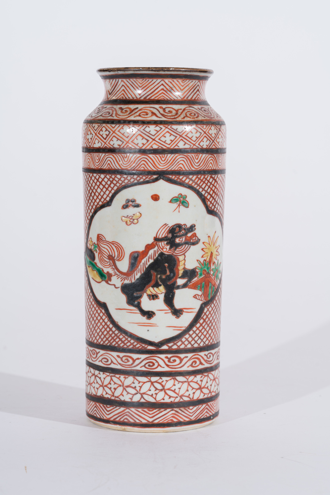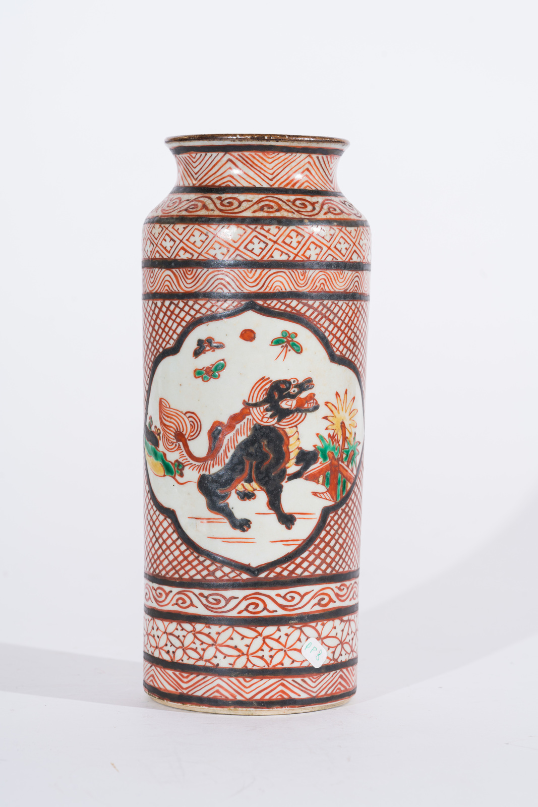 Cina, dinastia Qing, XVIII - XIX secolo . -. Cm 9,00 x 24,00. Vaso a rullo decorato con due grandi riserve contenenti cani di Pho su sfondo geometrico dipinto in rosso.