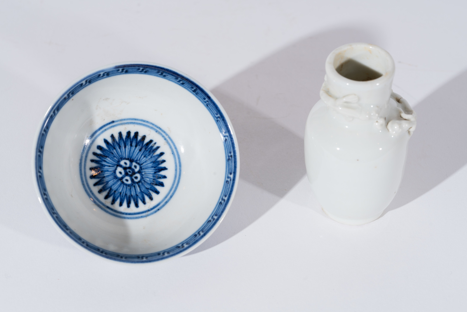 Chinese Art A small white porcelain vase decorated with moulded chilong and small blue and white porcelain cup painted with underglaze blue flowers
