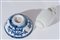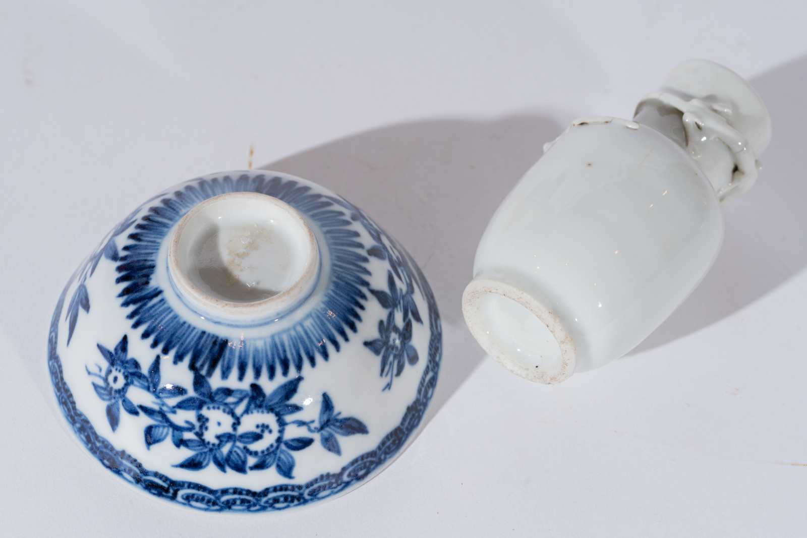 Cina, XVI- XVII secolo . -. Cm 9,00. Vasetto in porcellana bianca stampato con chilong sulla spalla (h.9 cm), coppetta dipinta a motivo floreale in blu cobalto sottocoperta (diam. 9,5 X h. 4)