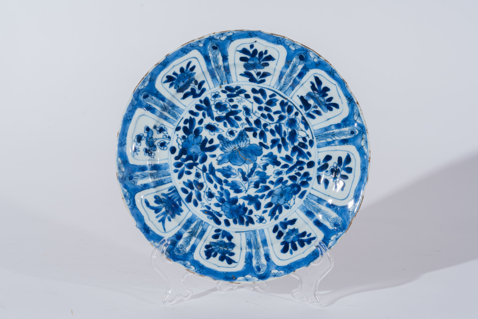 Arte Cinese Piatto in porcellana bianco blu della tipologia Kraak Cina, periodo Kangxi, XVII secolo . . Cm 22,50. Il fondo decorato con motivi floreali, la tesa presenta riserve vegetali a forma di petalo. L'esterno è dipinto con emblemi buddisti. Marchio a foglia di artemisia sulla base.