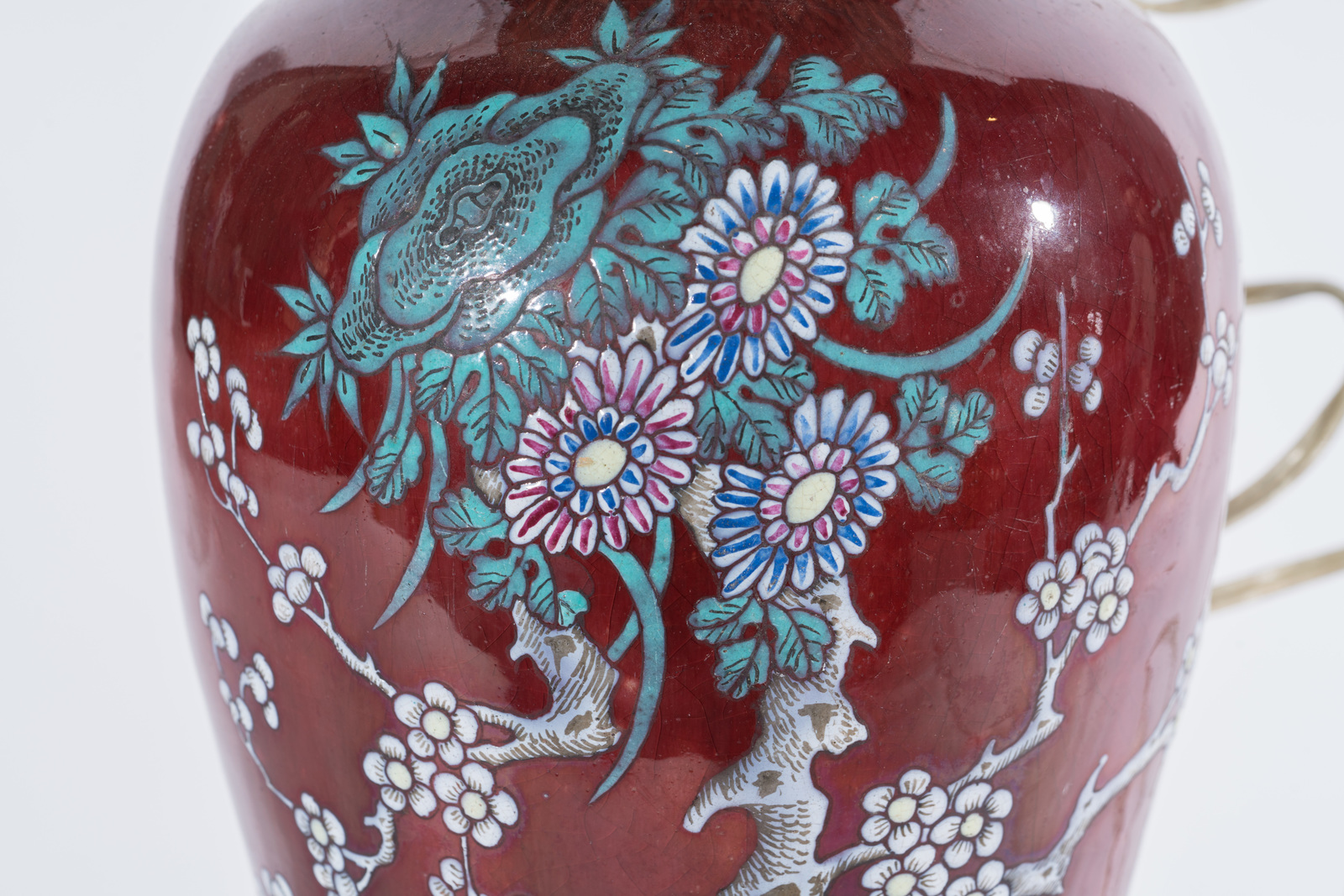 Chinese Art A sang de boeuf pottery vase floral painted with famille rose enamels and mounted as a lamp