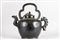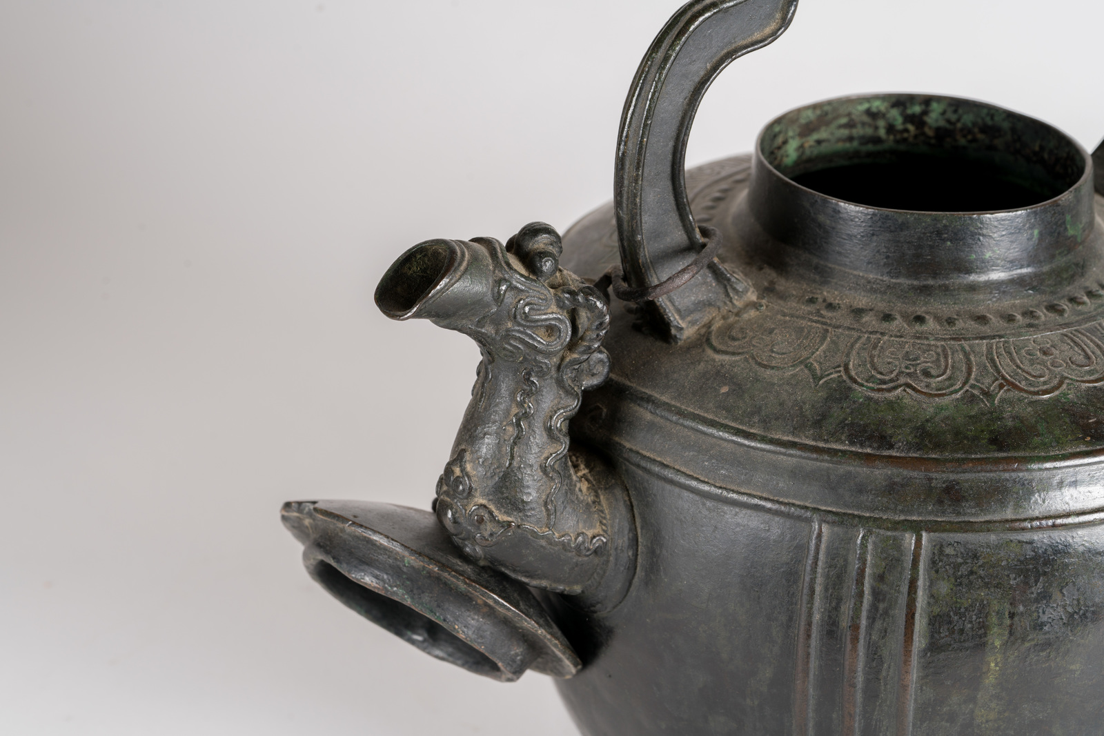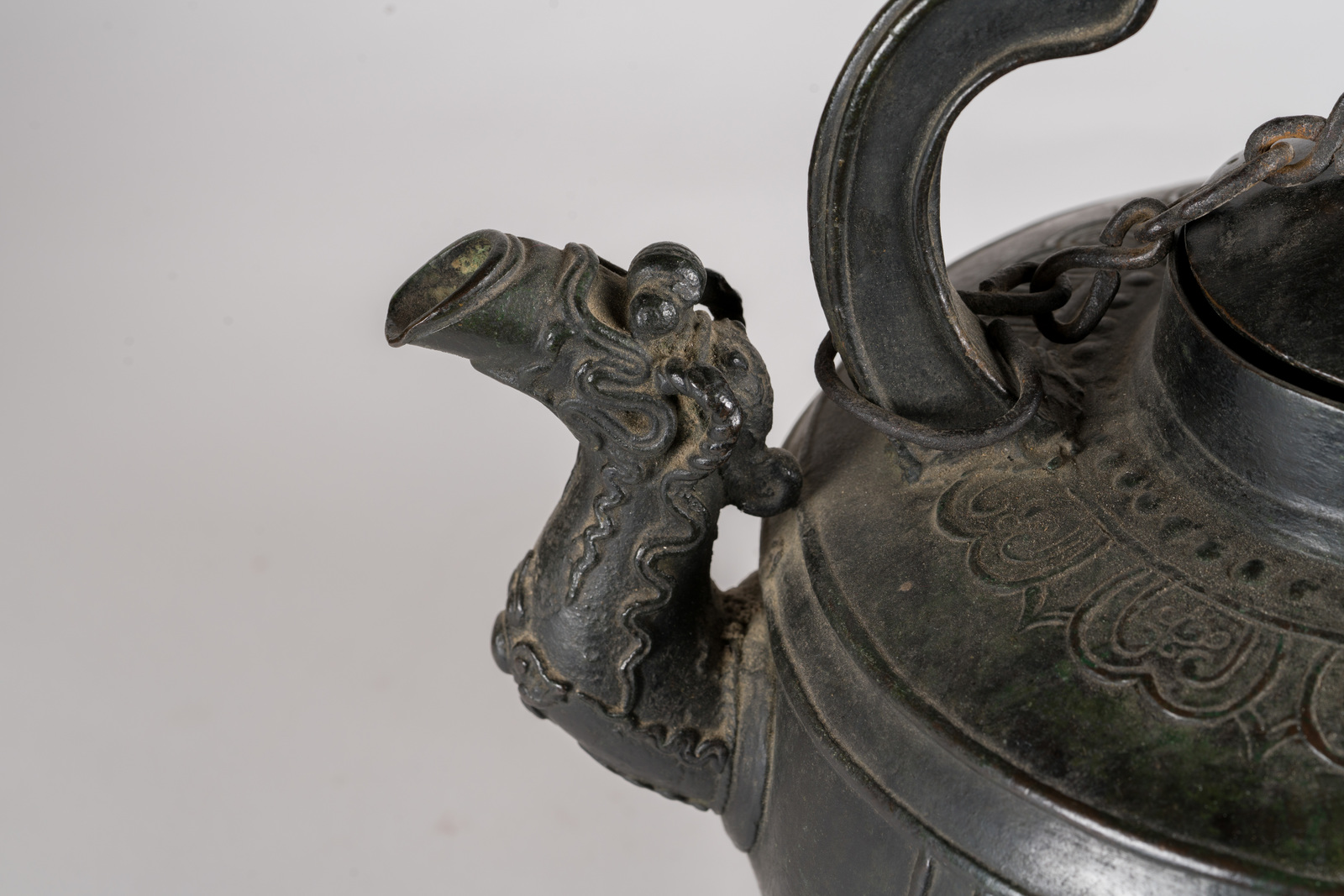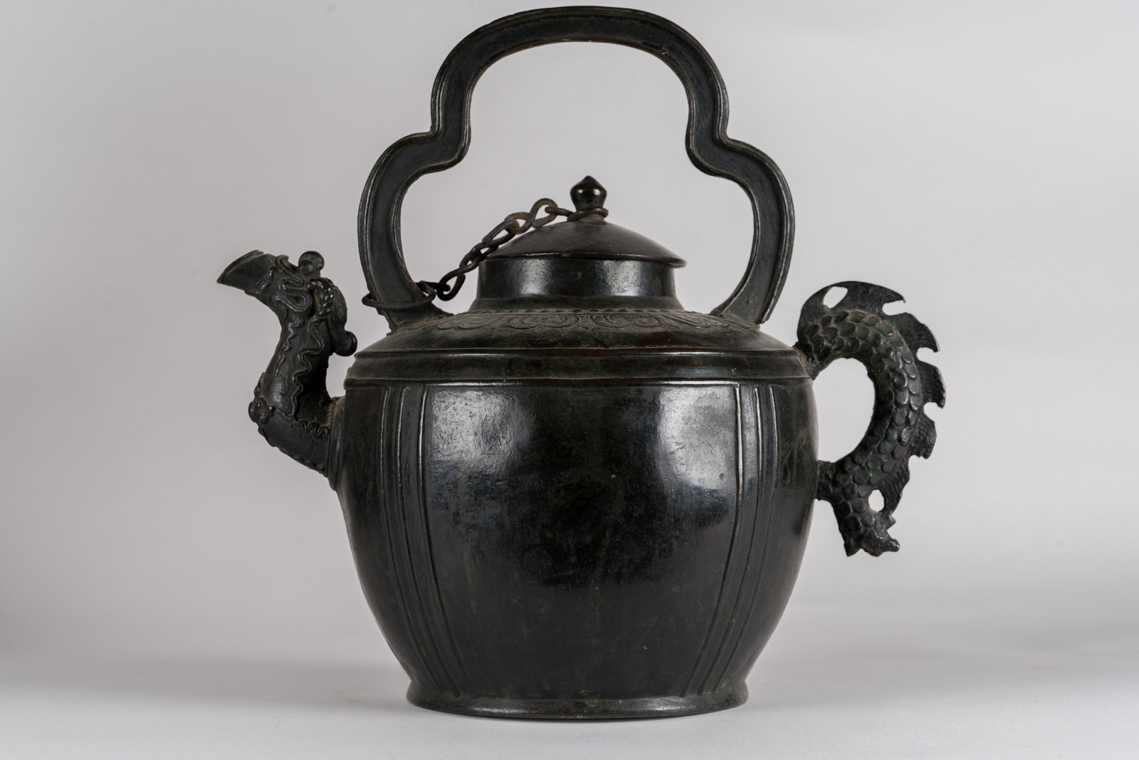 Cina, probabilmente dinastia Ming, XVI secolo . . Cm 31,00 x 31,00. Poggiante su disco, la spalla decorata con motivo puntinato e di nuvole stilizzate; versatoio e manico rispettivamente in forma di testa e coda di dragone. Tappo amovibile con catena di sicurezza.