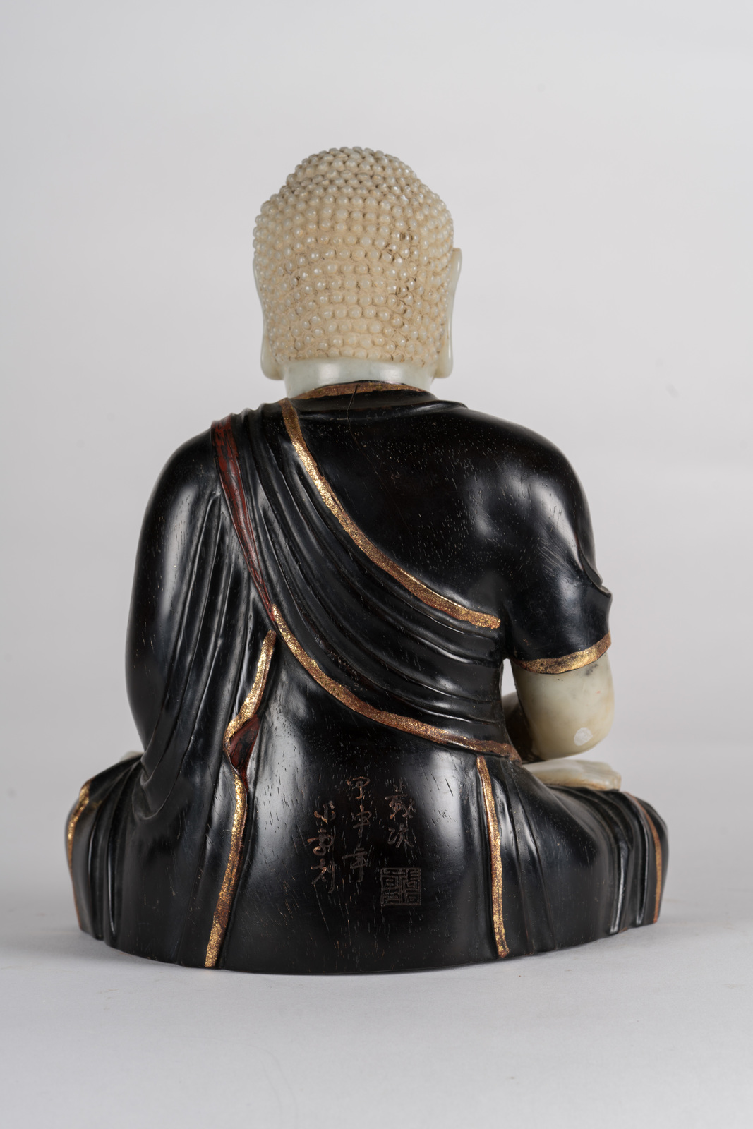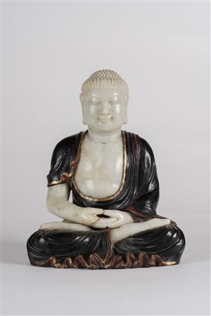 Arte Cinese Buddha in legno con inserti in pietra saponaria Cina, dinastia Qing, XIX secolo . -. Cm 20,00 x 26,00. Seduto in padmasana, l'ampia veste con i profili dorati, le mani unite in grembo in dhyanamudra: Iscrizione e sigillo incisi dietro la schiena.