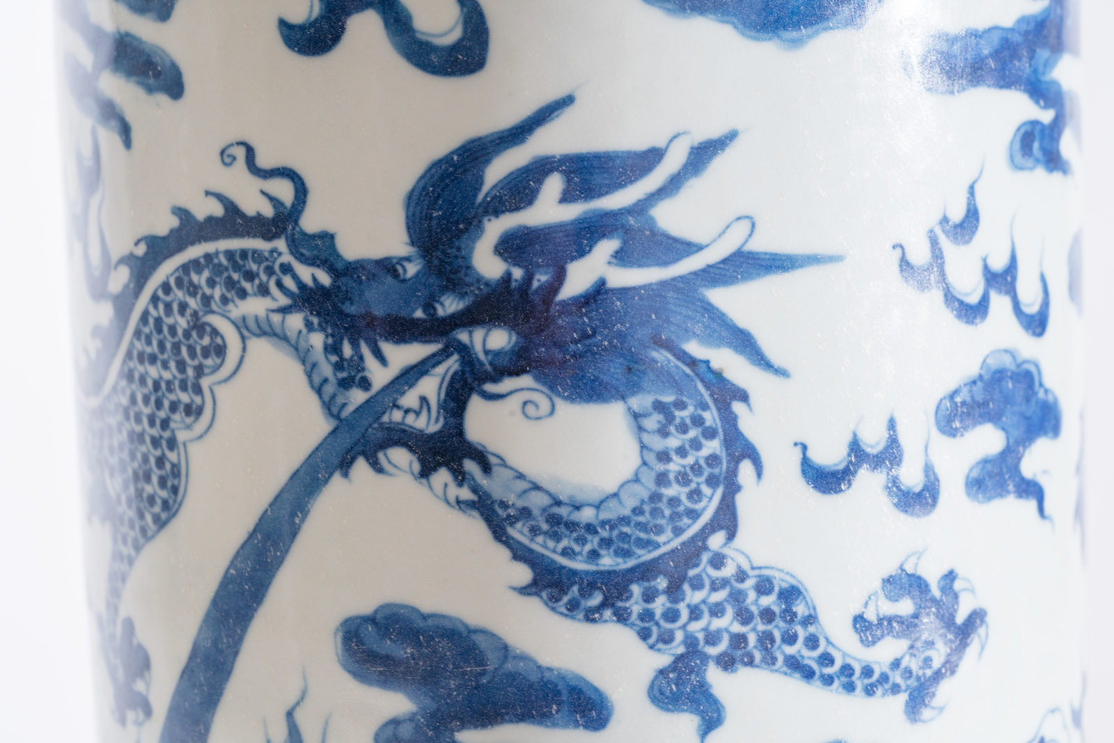 Cina, XIX-XX secolo . -. Cm 15,00 x 46,50. Dipinto in blu sottocoperta con un dragone alla ricerca della perla fiammeggiante tra nuvole ed onde.