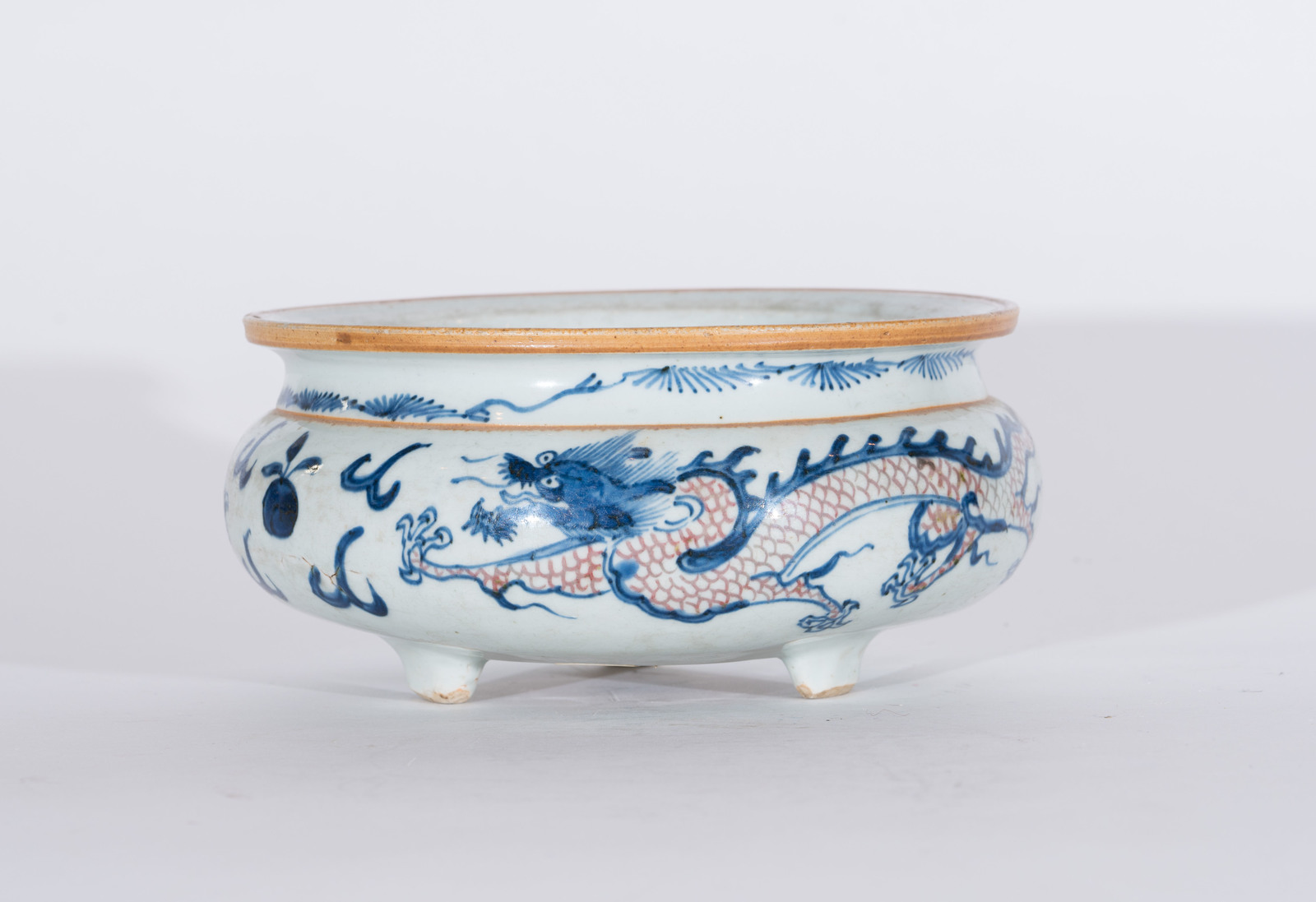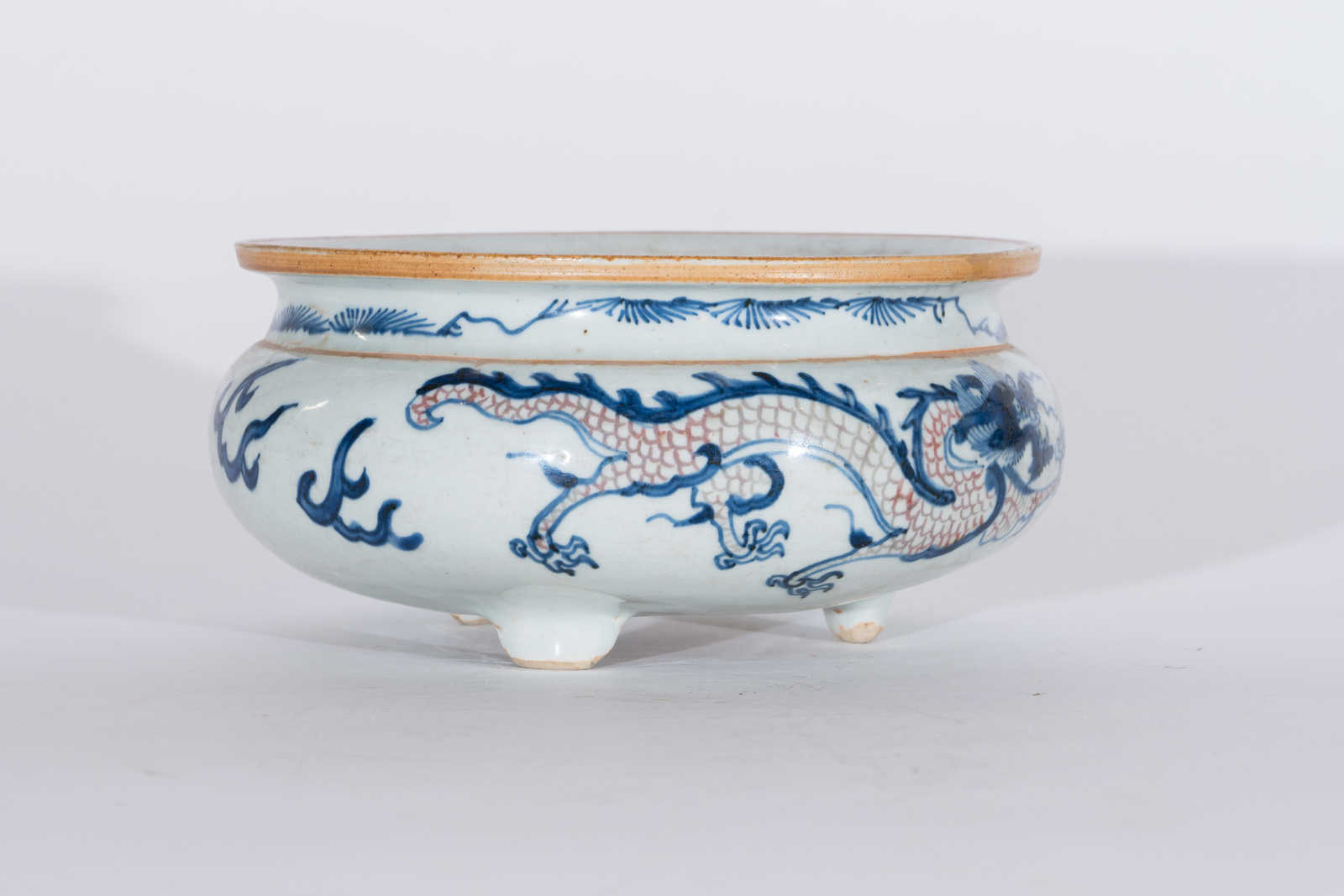 Cina, dinastia Qing, XVIII secolo . -. Cm 19,50 x 10,00. Poggiante su tre piedi, l'esterno dipinto con dragoni alla ricerca della perla fiammeggiante. la base reca marchio squadrato "felicità" dipinto in blu sottocoperta.