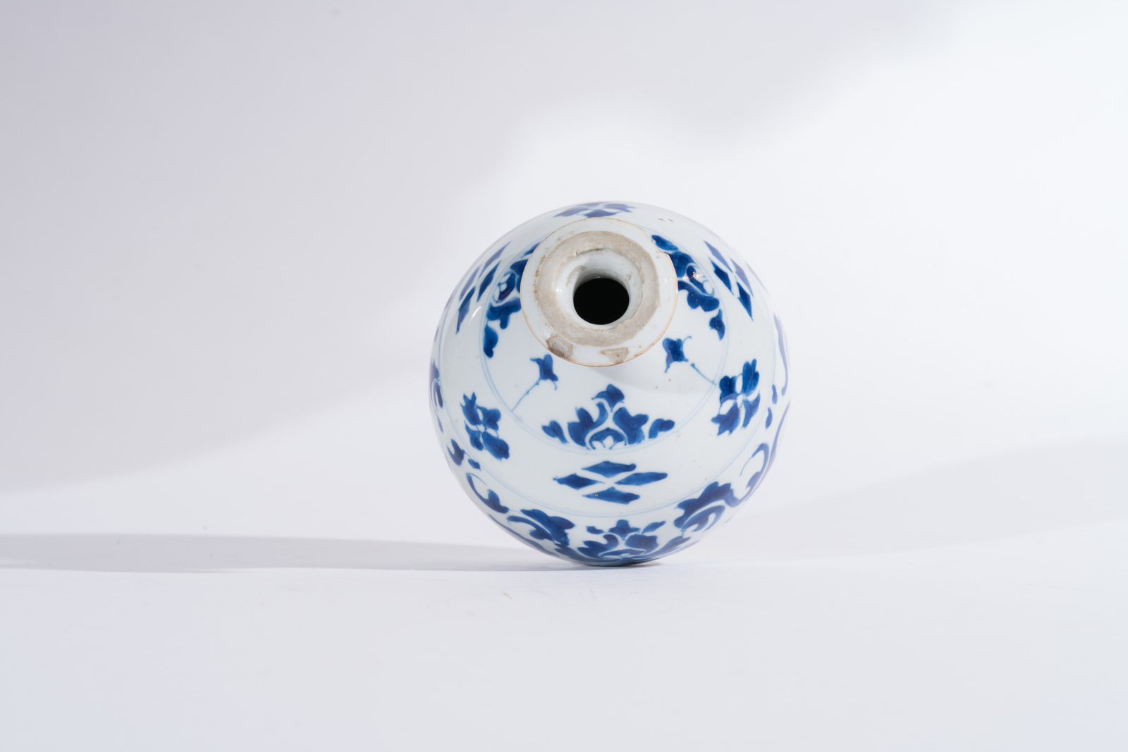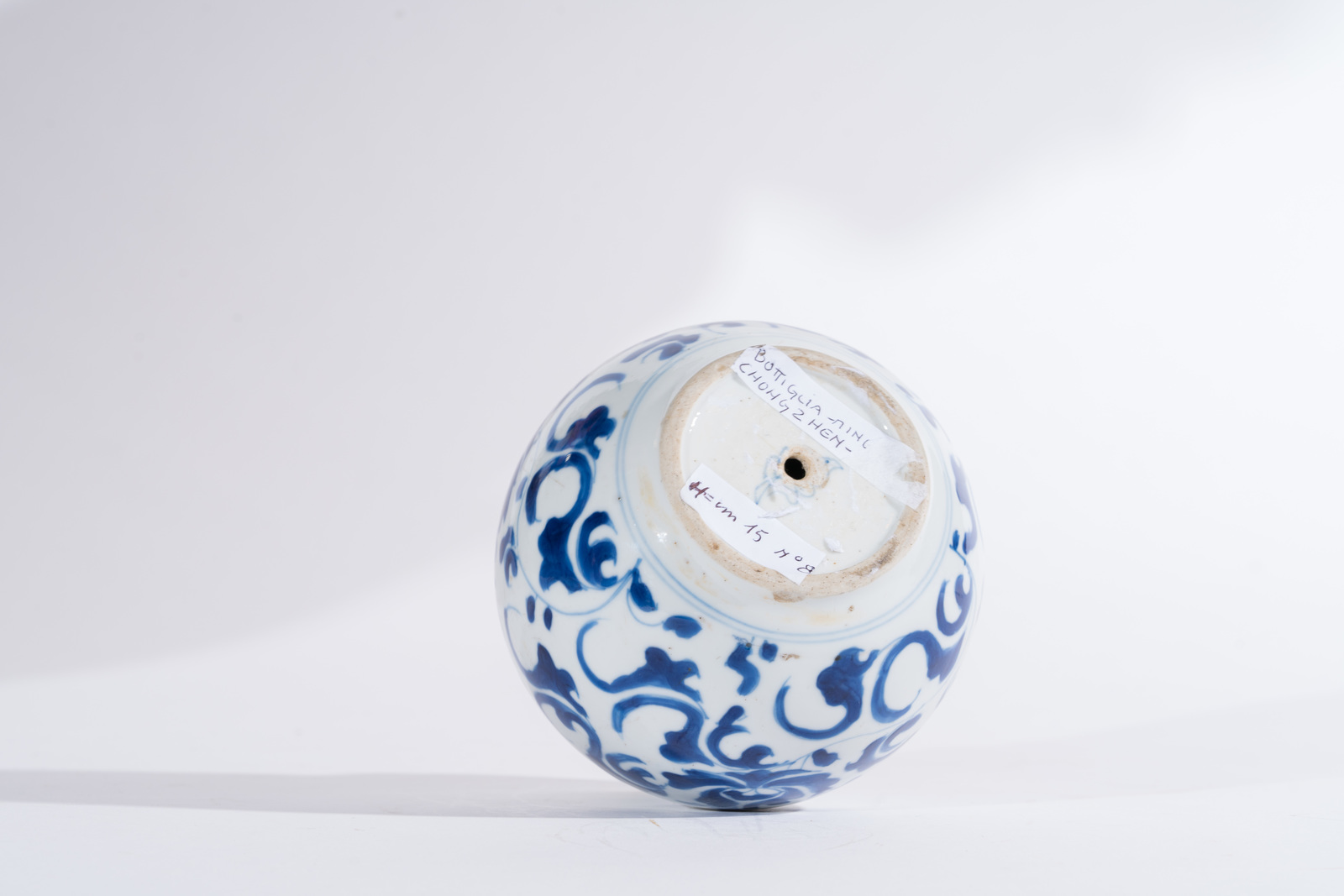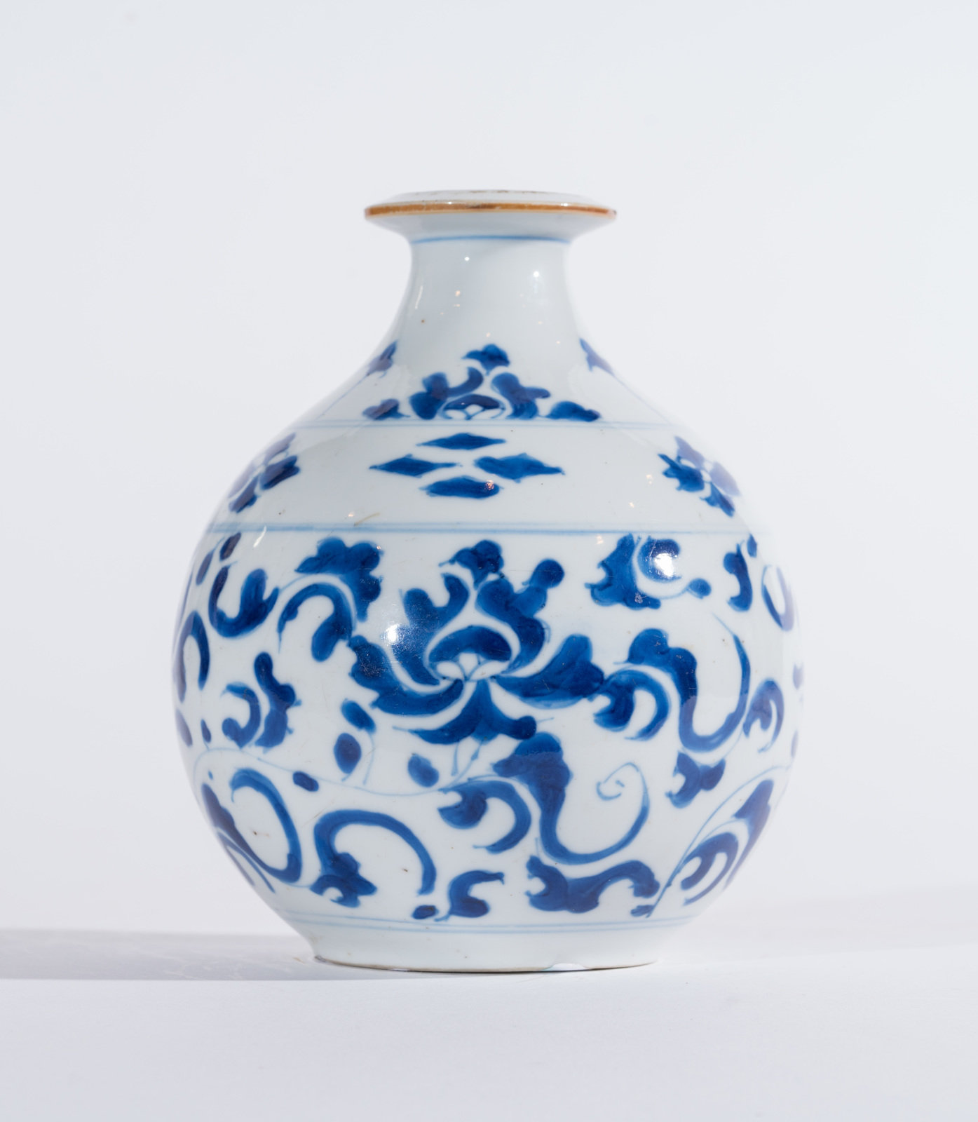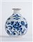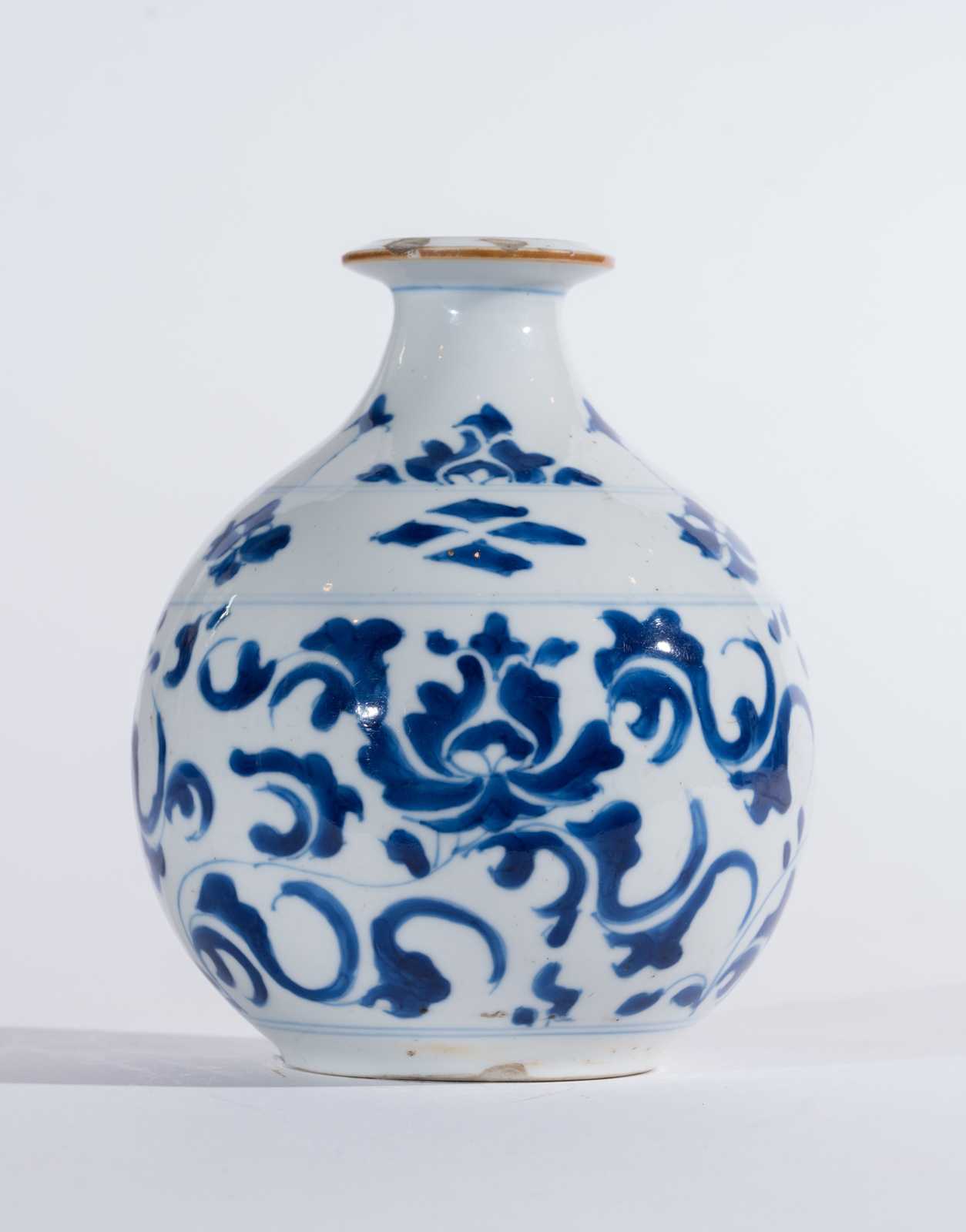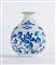 Cina, Epoca Transizione, XVII secolo . -. Cm 10,00 x 14,50. dalla caratteristica forma a bulbo, dipinta con motivi floreali in blu sottocoperta. Reca marchio a foglia di ametista dipinto in blu sulla base.