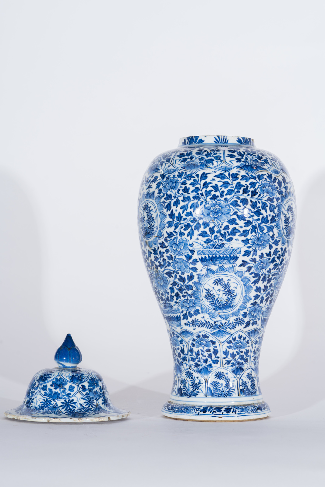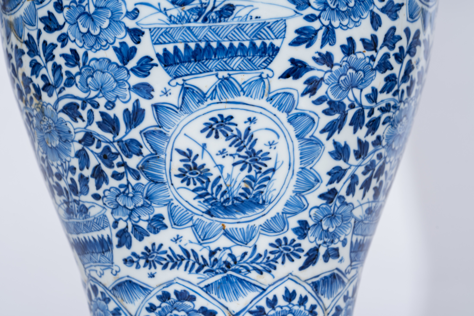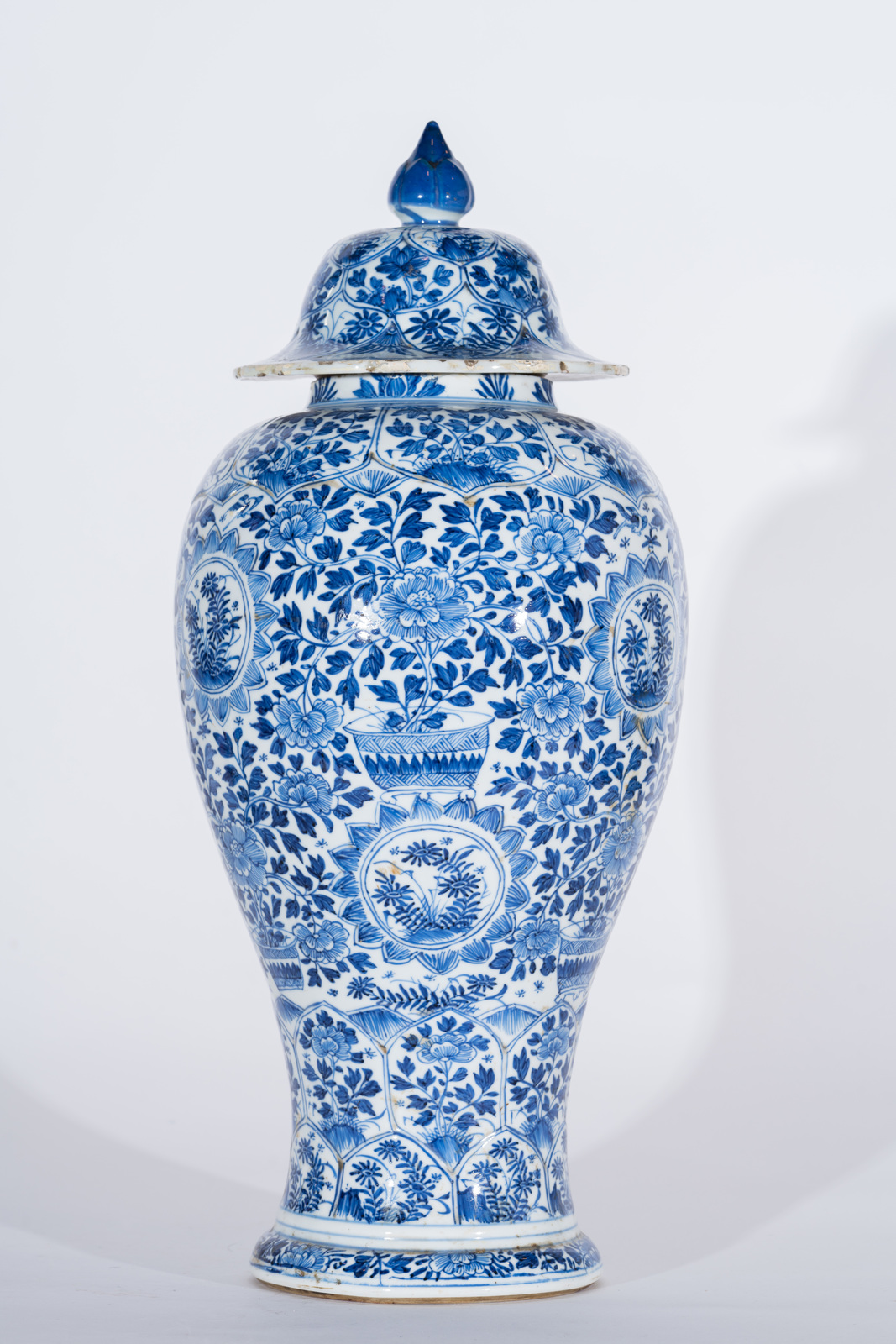 Chinese Art A blue and white baluster vase painted with floral motifs and bearing a Kangxi flower mark at the base