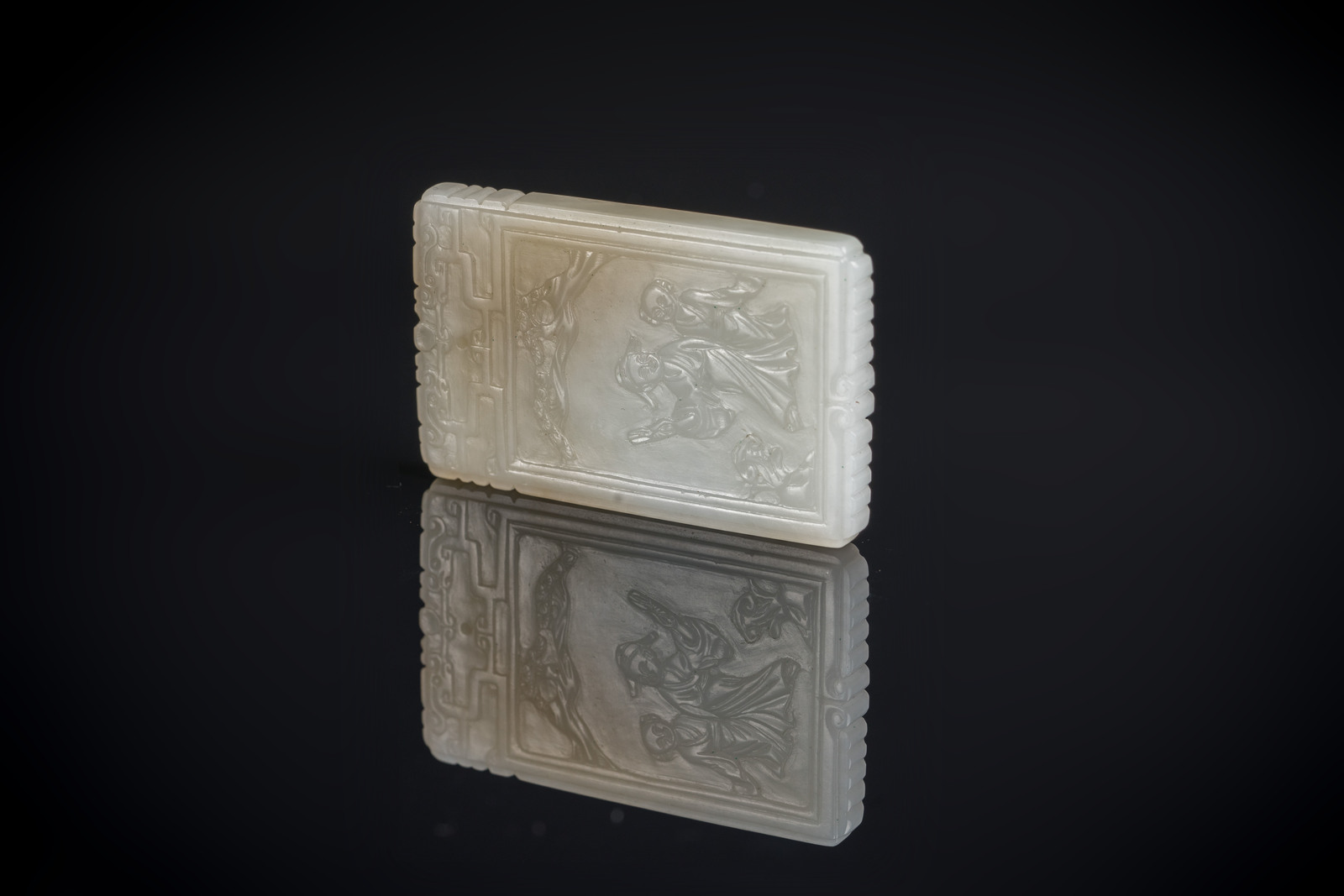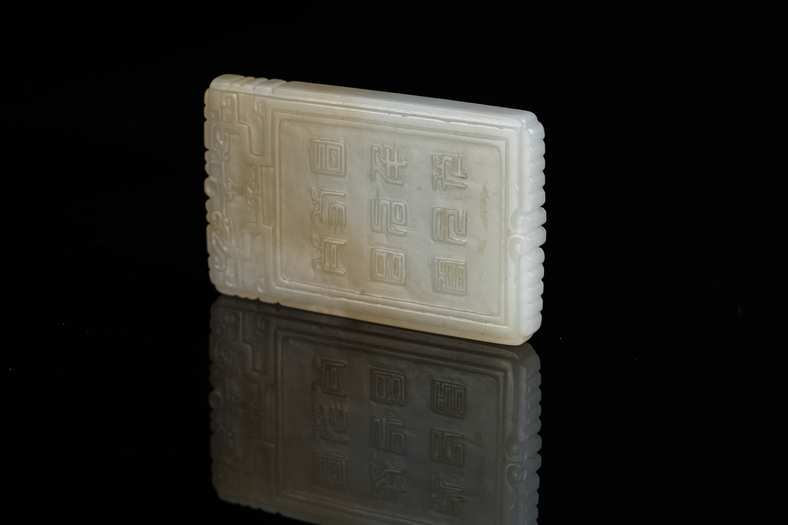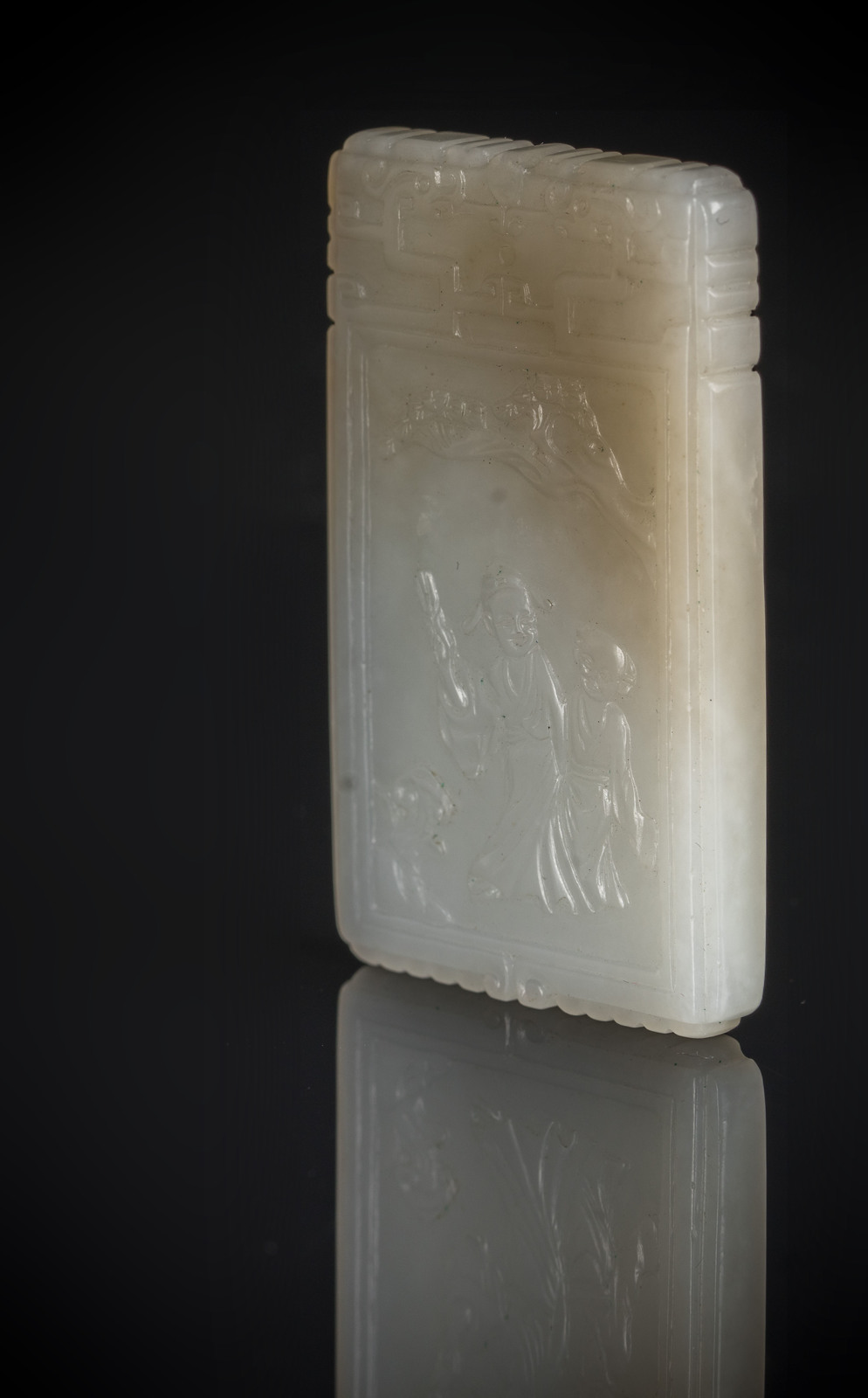 Chinese Art A white jade plaque engraved with inscriptions and characters China, Qing dynasty, 19th century . . Cm 4,00 x 6,00.
