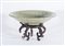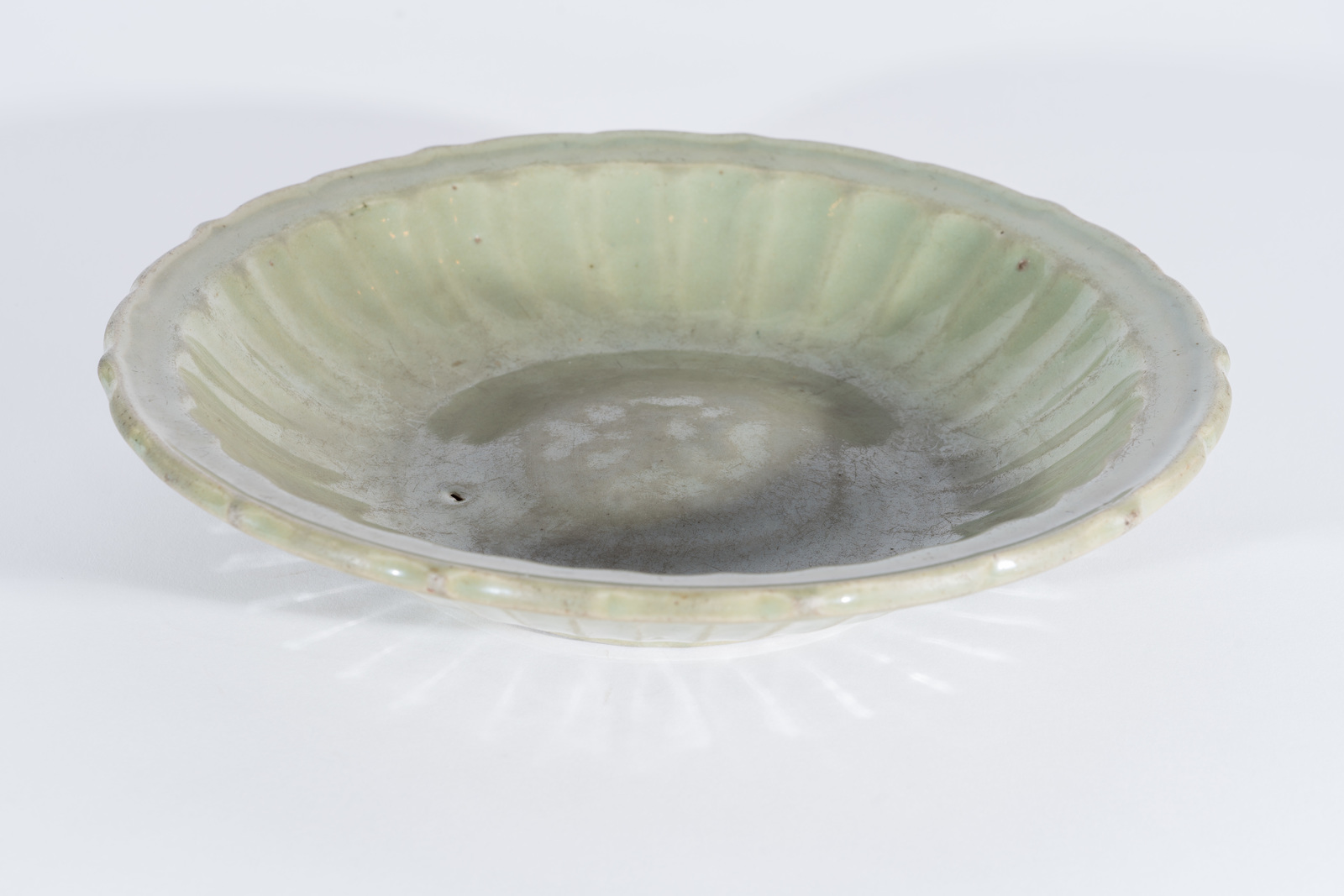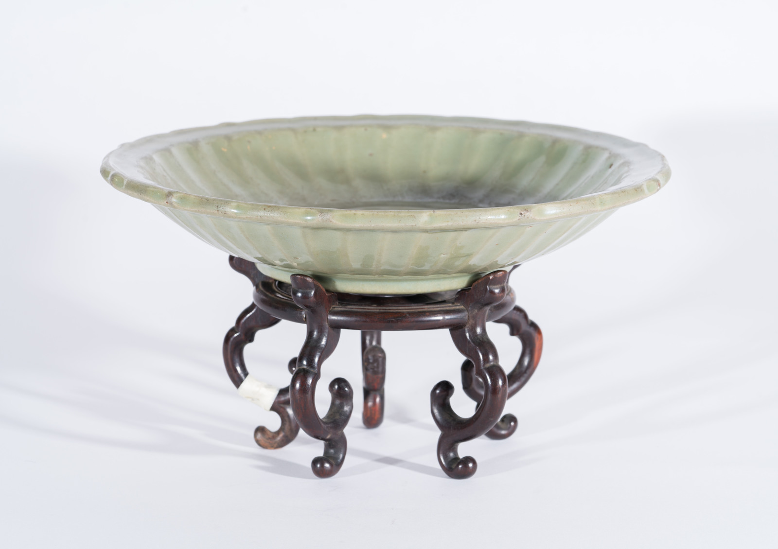Cina, tarda dinastia Yuan/inizio Ming . . Cm 6,00 x 30,50. poggiante su disco, il cavetto con pareti scanalate, la tesa con bordo foliato ed il tondo centrale decorato con peonia. L'oggetto è ricoperto di spessa vetrina verde oliva pallido.