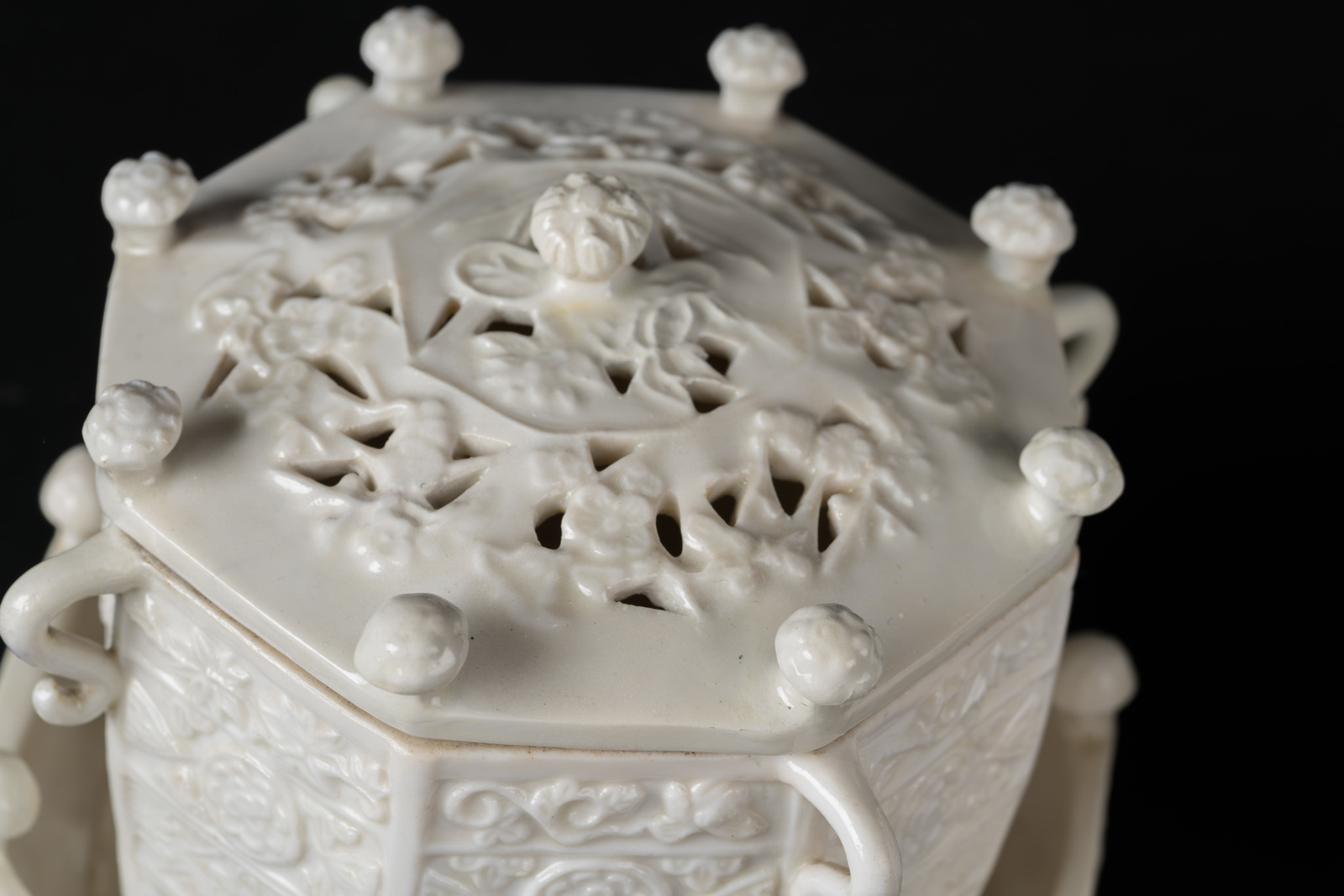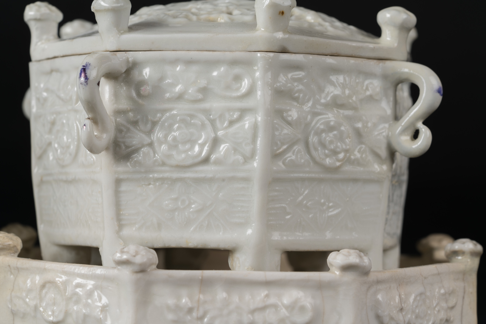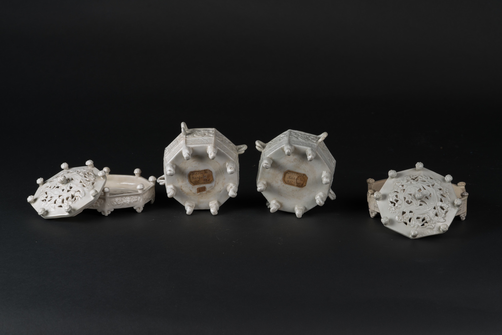 Cina, dinastia Qing, periodo Kangxi, XVII secolo . . Cm 14,50 x 12,50. Composti da incensiere, vassoio e coperchio, tutti di forma ottagonale, stampati con bande floreali. Quattro manici a forma di serpente stilizzato sui lati dell'incensiere, mentre vassoi e coperchi sono abbelliti da bulbi floreali sporgenti. I due coperchi sono ulteriormente lavorati a trafori geometrici.