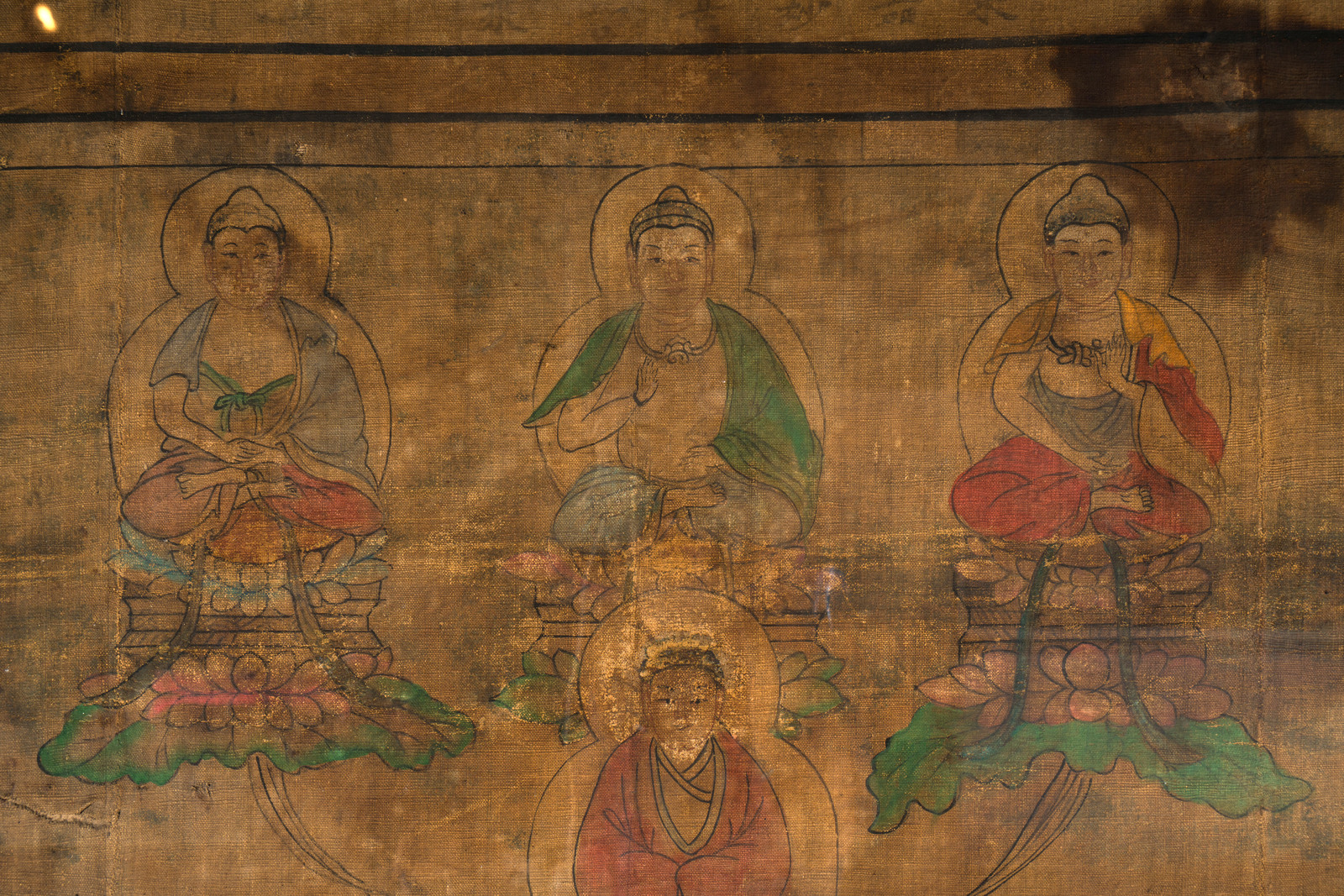 Cina, dinastia Qing, inizio XIX secolo . -. Cm 158,00 x 215,00. di notevoli dimensioni, ritraente un alto ufficiale civile, a giudicare dalla veste blu e dall'emblema con una gru sul petto che lo identifica come appartenente al primo o secondo rango , affiancato da due mogli. Ai lati delle due figure femminili si possono notare delle lunghe iscrizioni, mentre nella porzione superiore del dipinto un paesaggio ed il cielo interrotto da quattro figure buddiste.