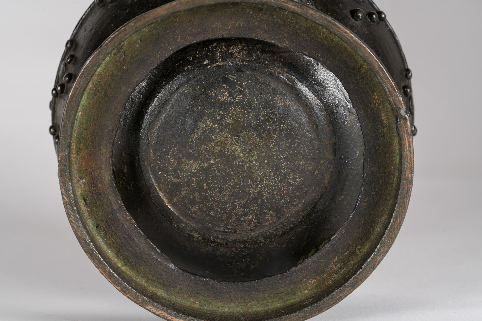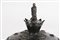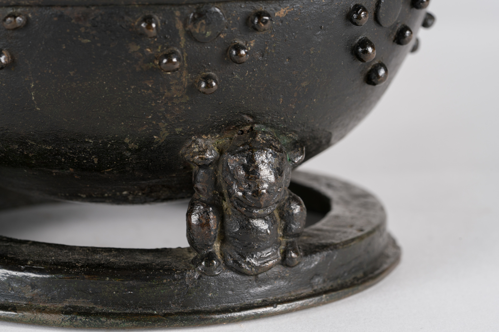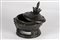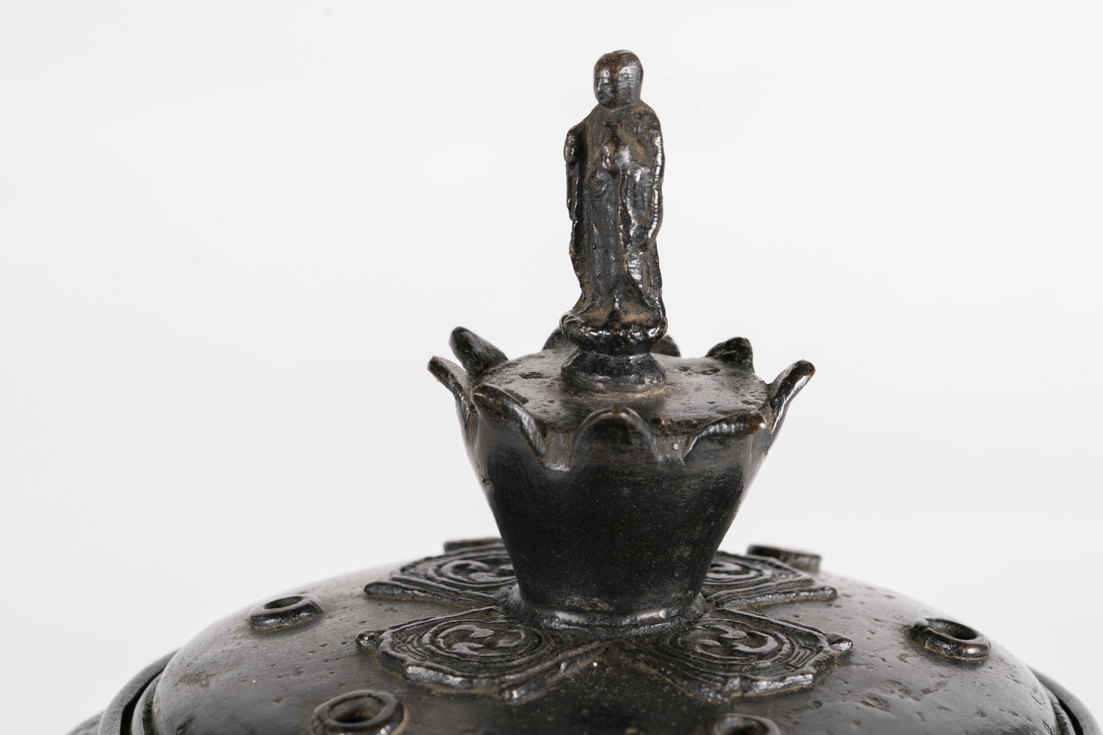 Giappone, periodo Kamakura, 1185–1333 . -. Cm 20,50. poggiante su disco e su tre piedi sagomati a animali mitologici; il corpo stampato con rilievi puntinati in prossimità del bordo superiore. Il tappo terminante con impugnatura in forma di fiore sovrastato da una piccola figura di religioso, stante su una base a doppio fiore di loto.