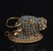 . . Cm 5,20. Pendente in metallo a forma di testa di bue con turchesi incastonate, scatola di forma lenticolare in porcellana bianco/blu, dipinta con dragone e recante marchio a quattro caratteri dipinto sulla base.
