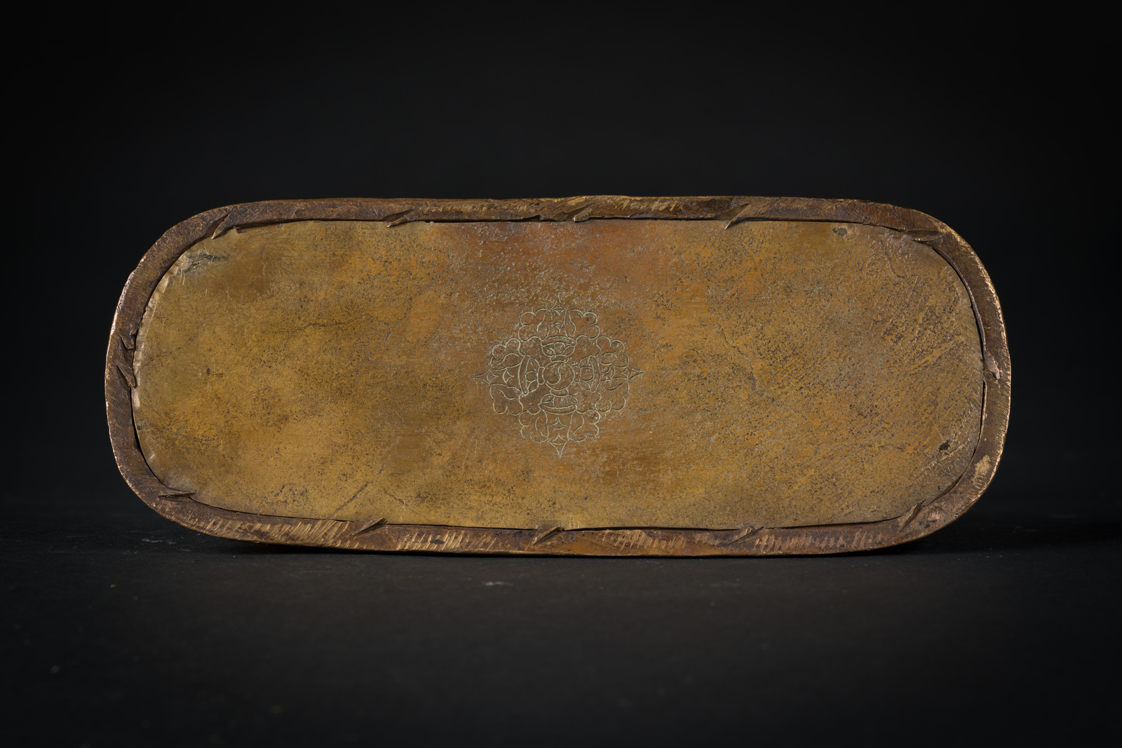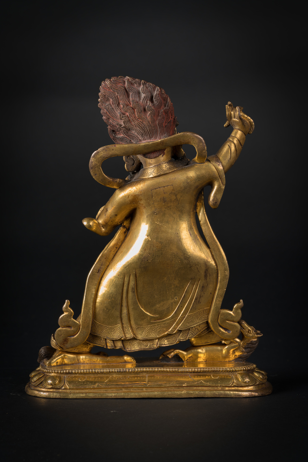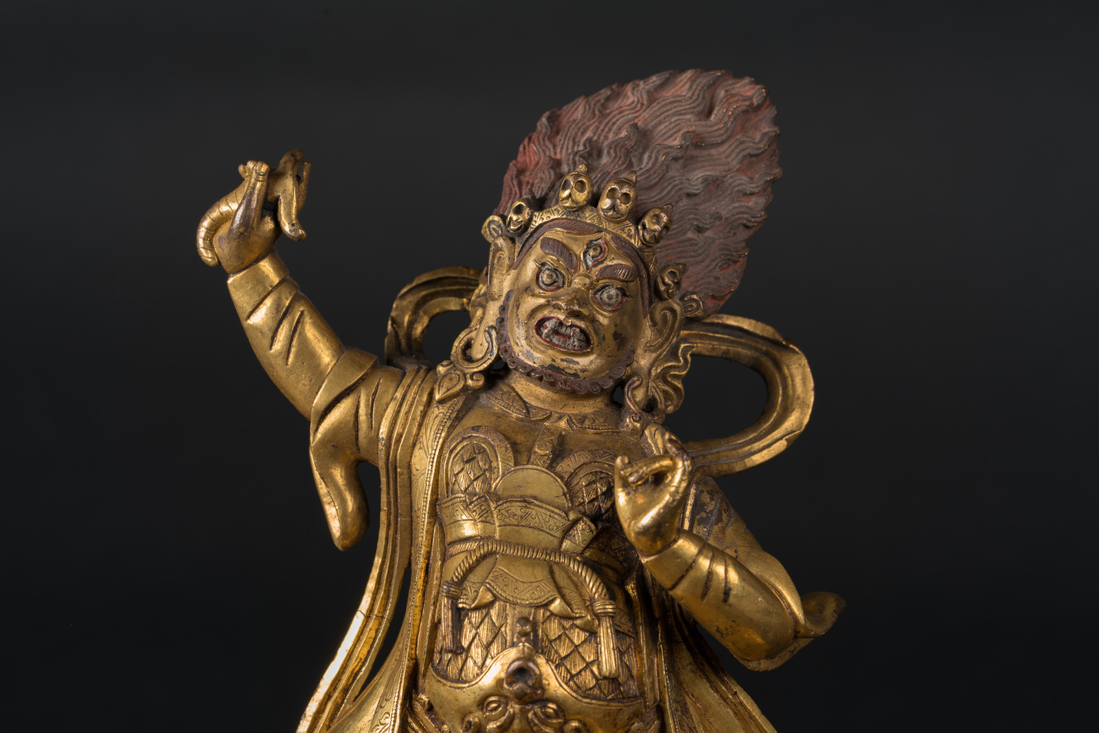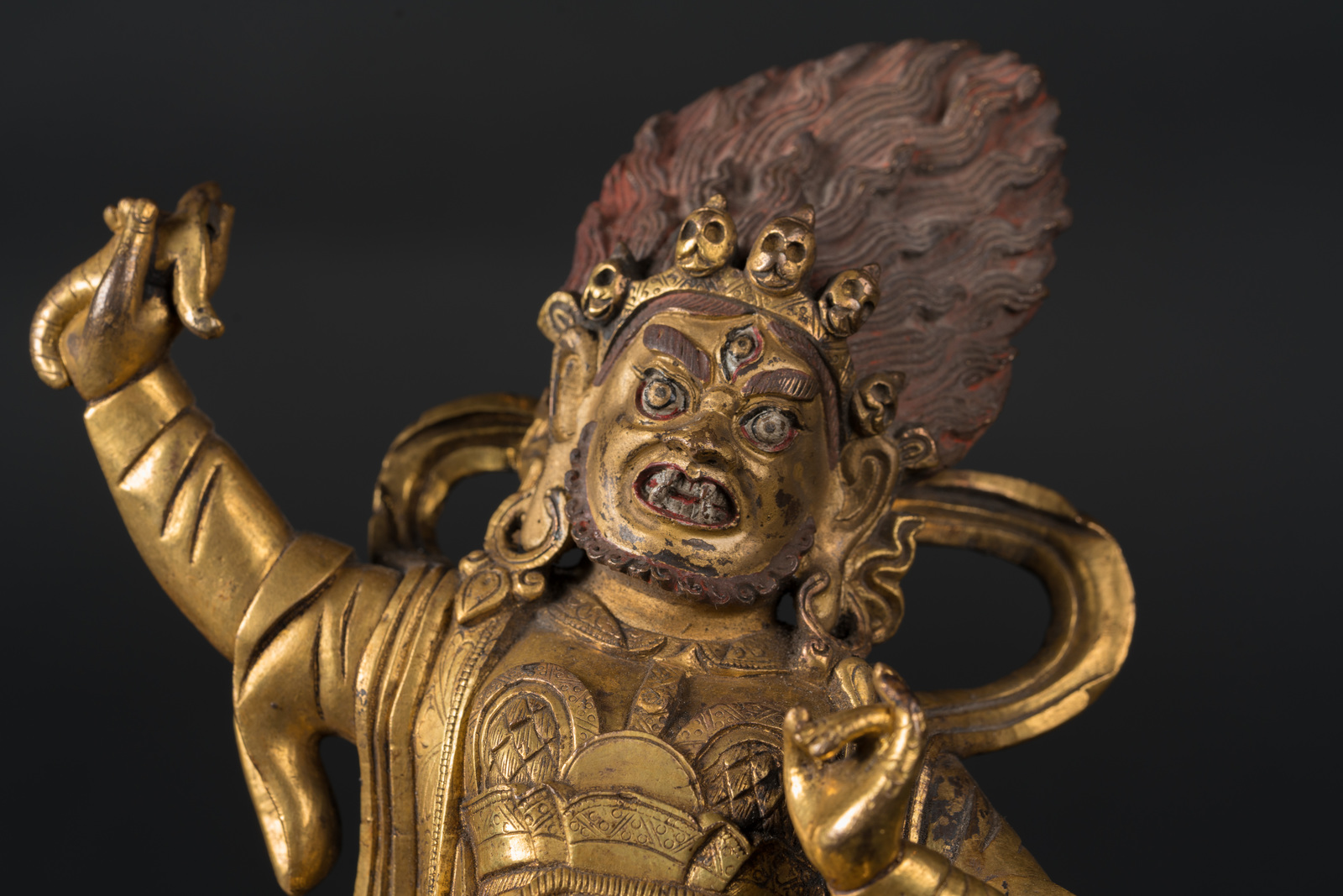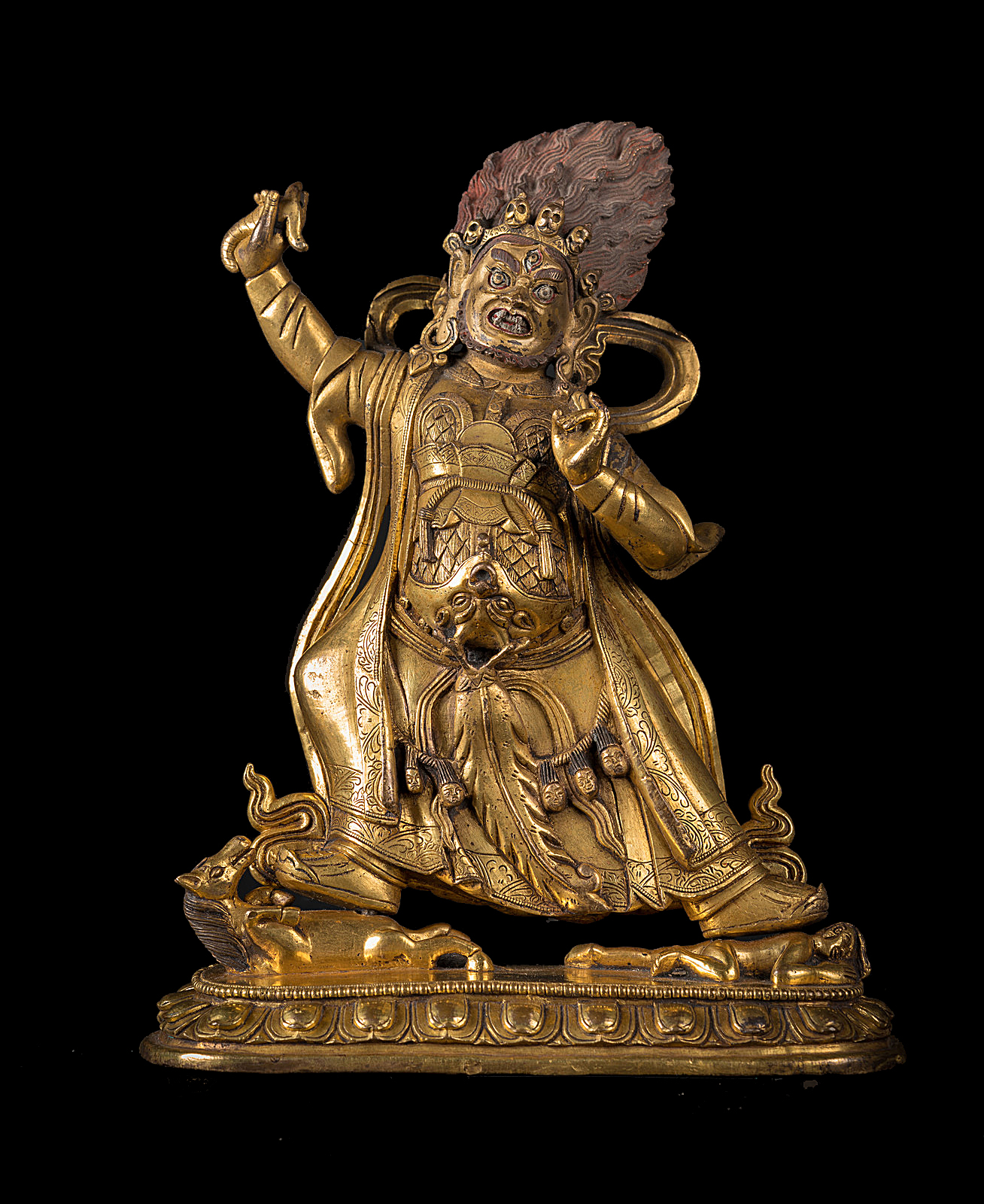 Arte Himalayana Figura in bronzo dorato raffigurante Achala Cina/Tibet, tardo XVIII secolo . -. Cm 18,50 x 23,00. Fusione in due parti: corpo e base a fiore di loto singolo, raffigurante la divinità irata Achala trionfante, nella sua posizione ad arco, su un cavallo ed un cadavere umano. La figura è caratterizzata da un'alta e fiammeggiante capigliatura ed un volto irato e barbuto, entrambi con tracce policrome. Presenta stola fluttuante, una tunica ornata a motivi fitomorfi, lunga collana con teste umane ed un'armatura sul cui ventre è ritratto un volto zoomorfo. Nella sua mano destra brandisce una spada la cui lama è andata perduta, mentre la sinistra avrebbe dovuto reggere il laccio phustaka.