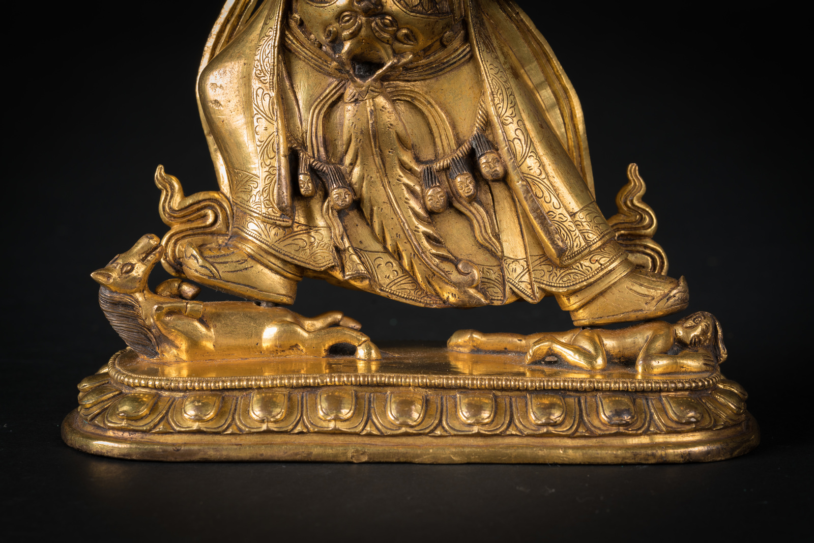 Himalayan Art A gilt bronze figure of Achala Sino/Tibet, late 18th century . . Cm 18,50 x 23,00. Two-pieces cast: base shaped as a single lotus flower and body, depicting the triumphant wrathful deity Achala in a kneeling posture standing on a horse and human body. The figure is characterized by a tall flaming hairstyle and a wrathful and bearded face, both presenting polychrome traces. The deity wears a flowing stole, a tunic ornate with phytomorfic motifs, a long necklace of human heads and an armor on which is depicted a zoomorphic face. In the right hands is a sword of which the blade was lost, while the left hand should have held the phustaka lace.