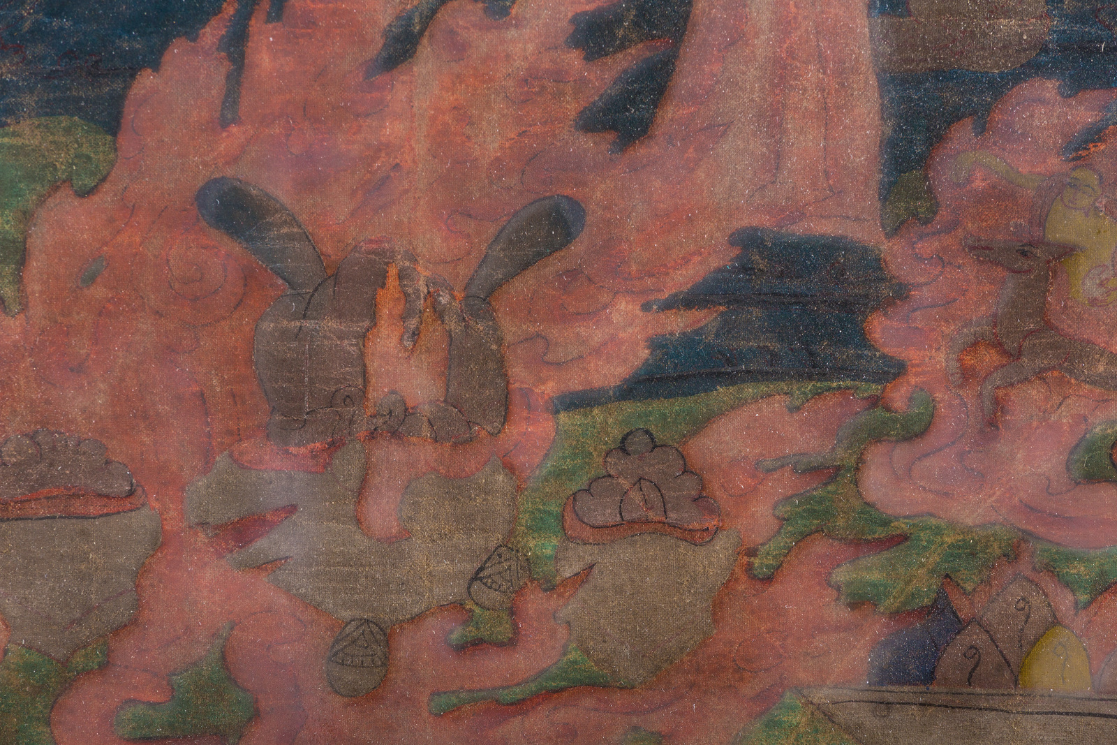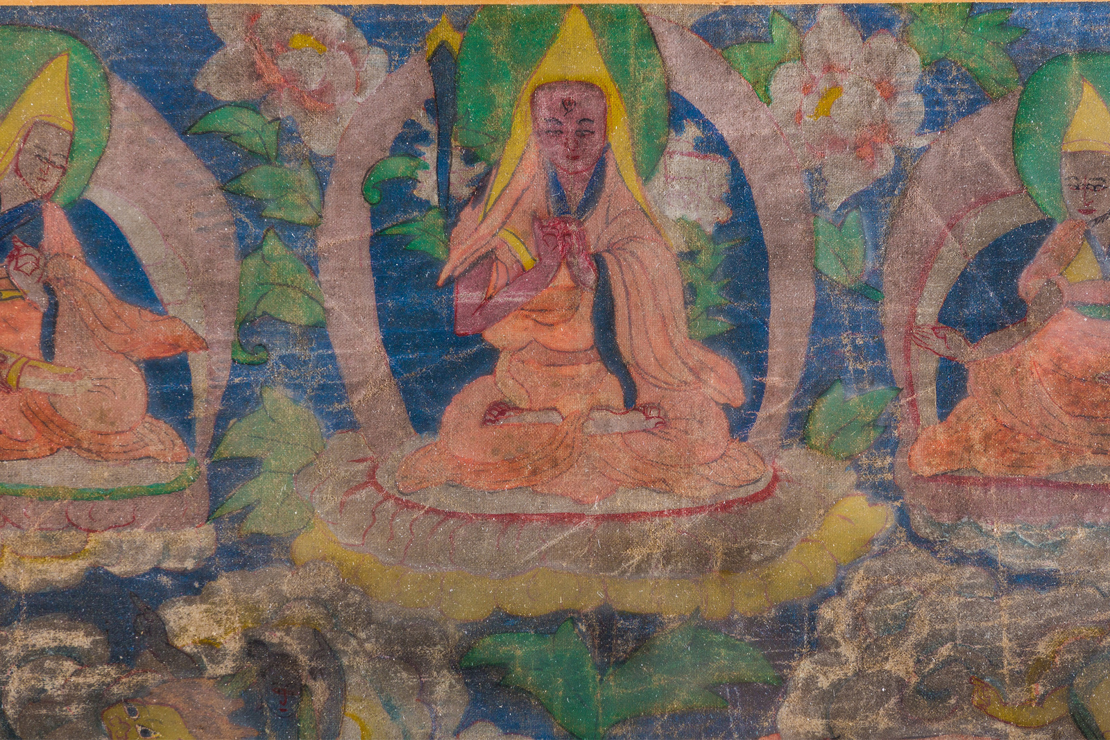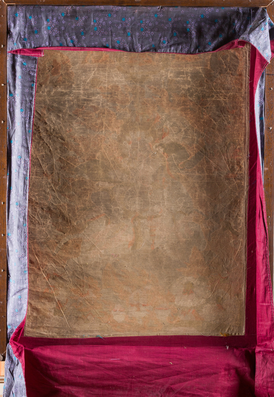 Nepal, fine XIX secolo . -. Cm 56,00 x 79,00. Thangka di natura popolare raffigurante, come soggetto principale, la dharmapala dal viso irato Palden Lamho a cavallo di un asino selvatico. Sono presenti figure secondarie, tra le quali spicca, all'apice della composizione, il maestro Tsong-khapa.