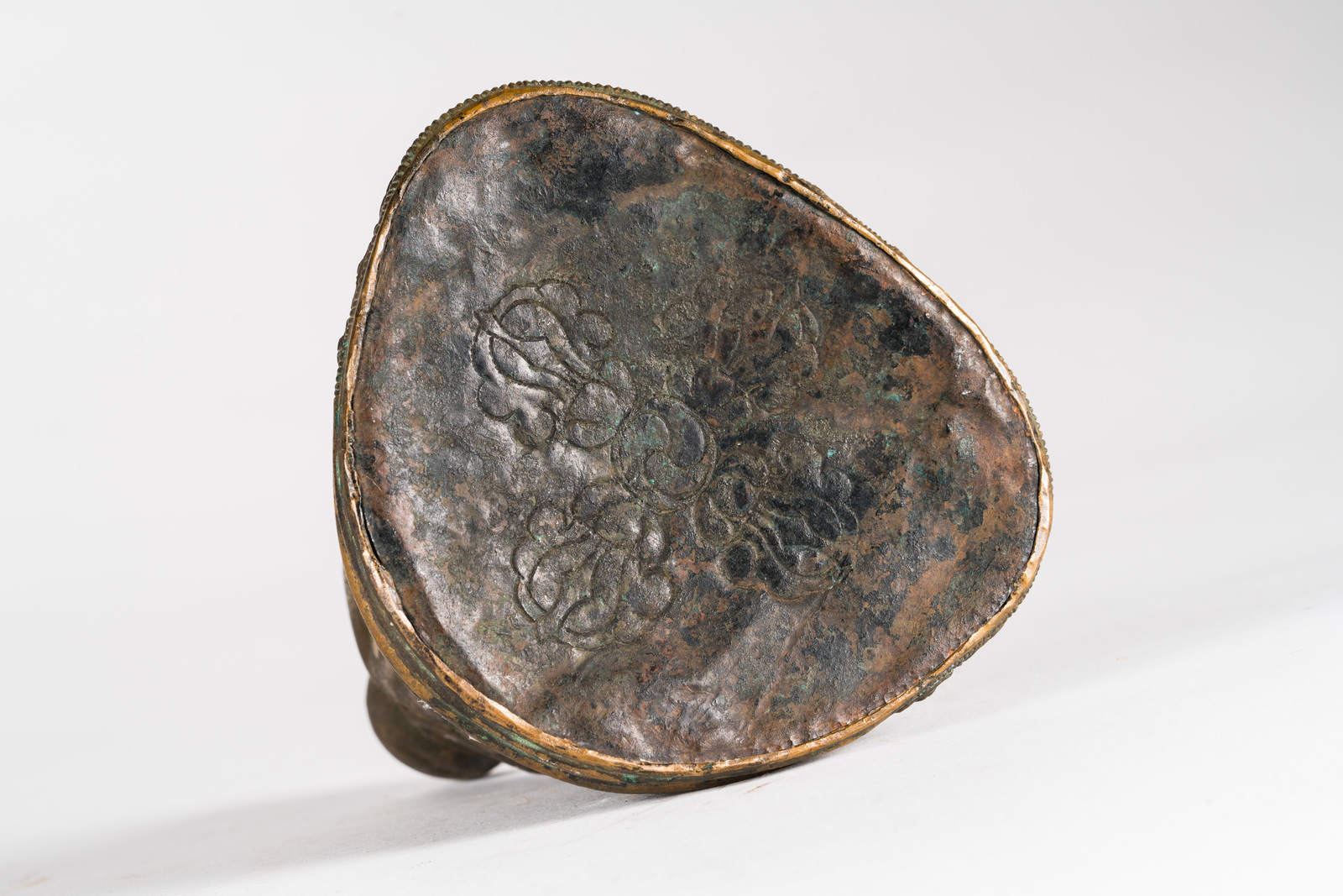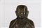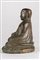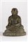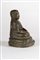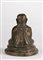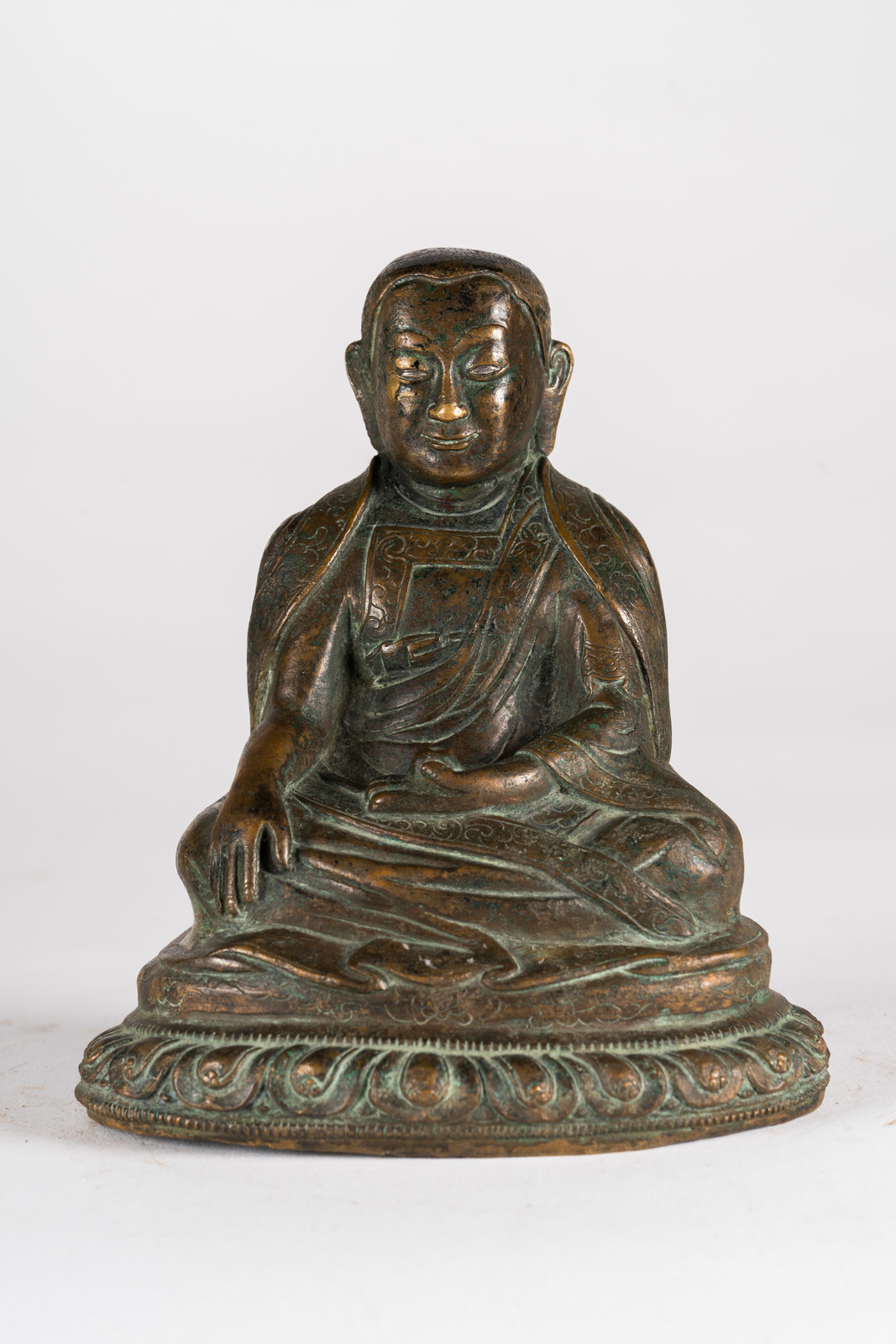 . . Cm 17,00. Fusione in lega di rame raffigurante maestro della scuola Kagyu seduto su una base a fiore di loto singolo, la sinistra adagiata in grembo reggendo la ciotola delle offerte, la destra appoggiata sul ginocchio è nel gesto bhumisparsamudra. Presenta veste con bordi decorati a motivi fitomorfi e riporti in argento sugli occhi.
