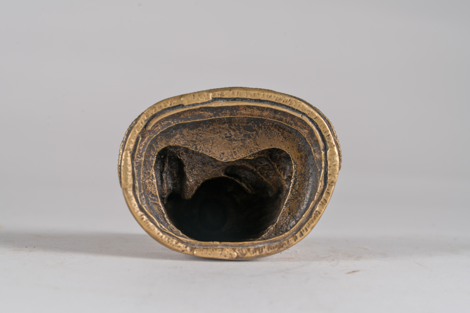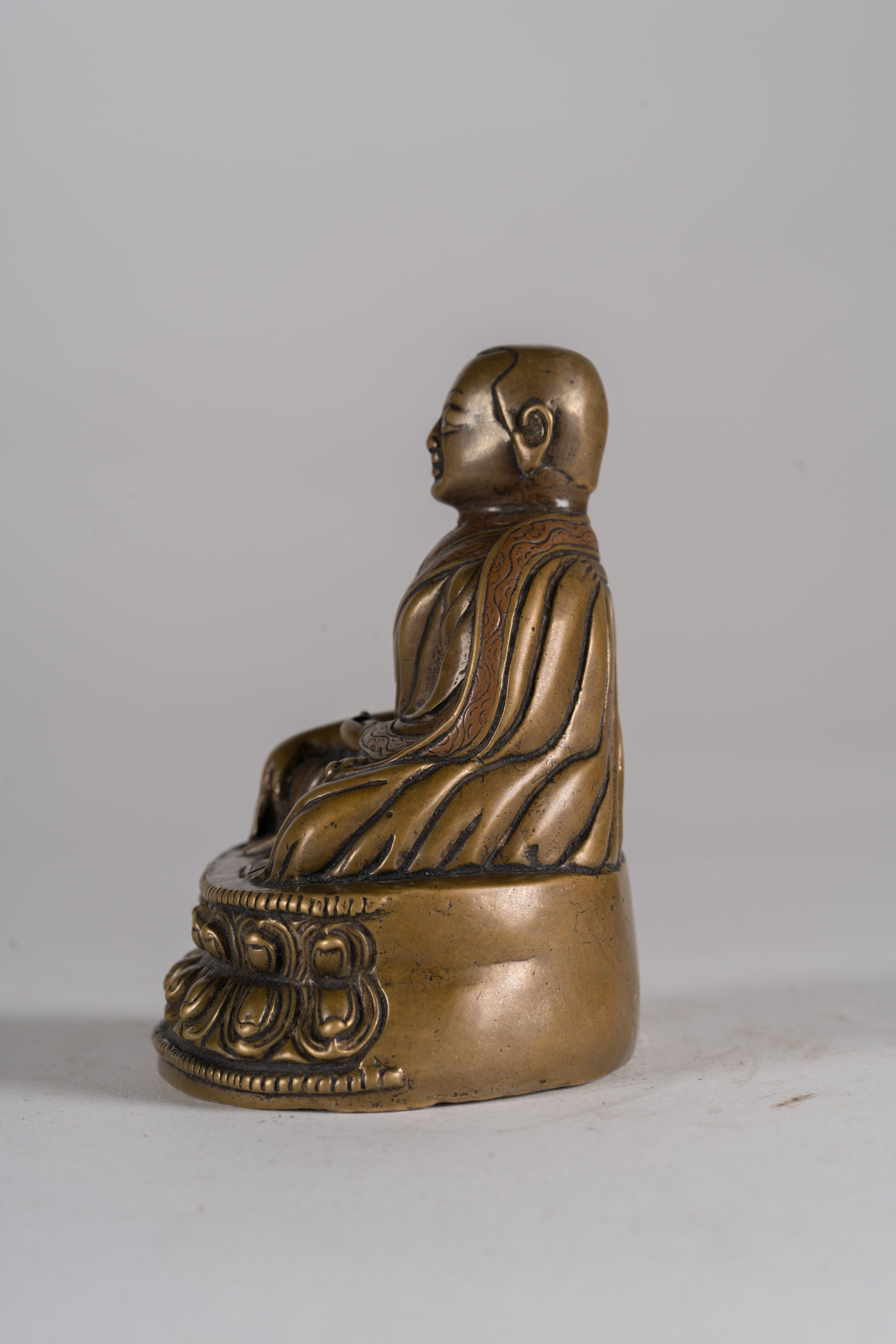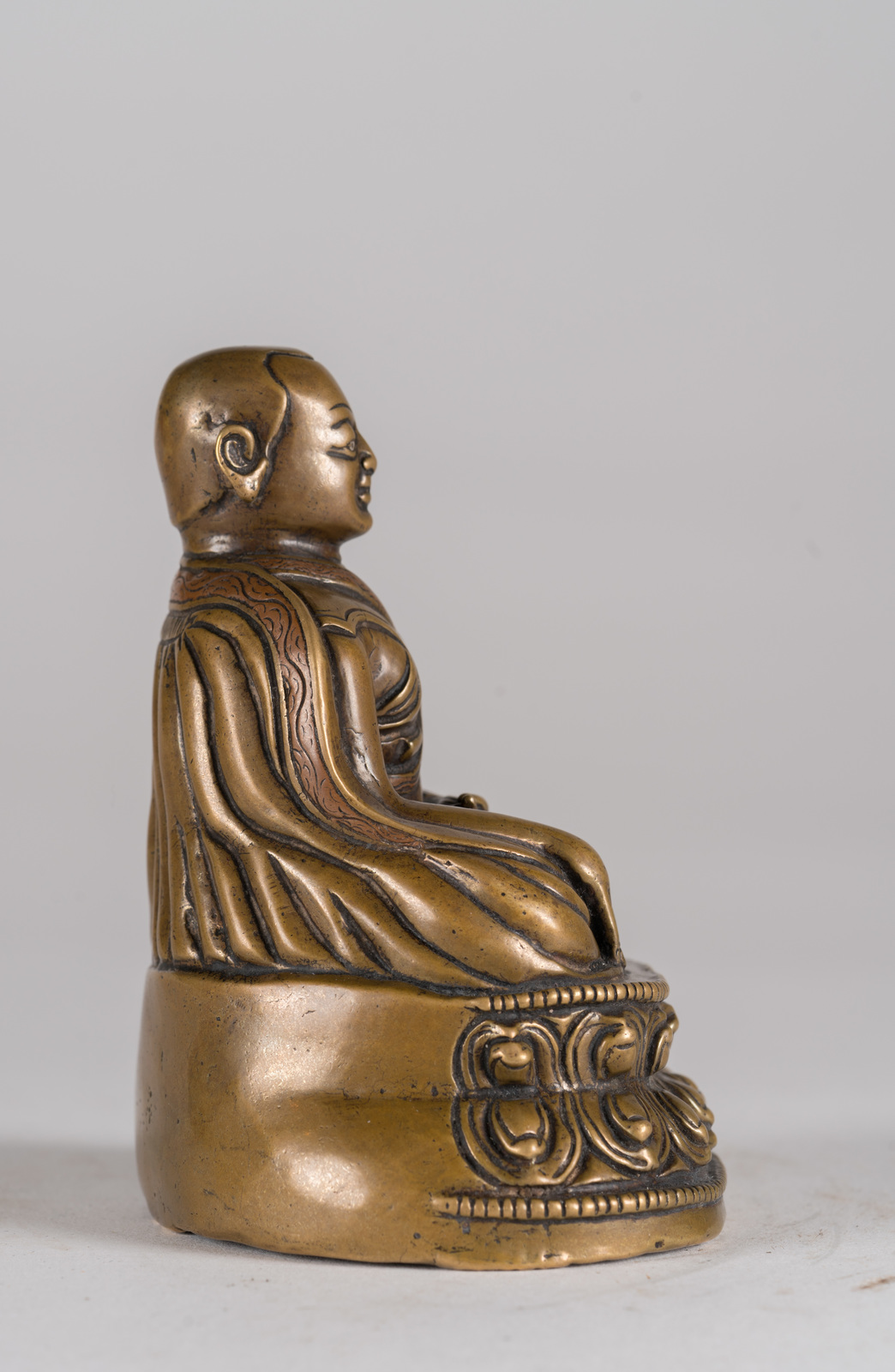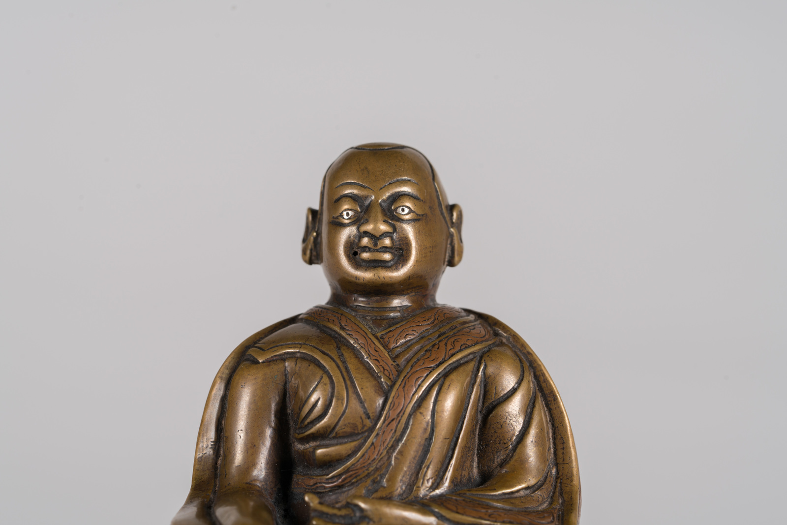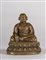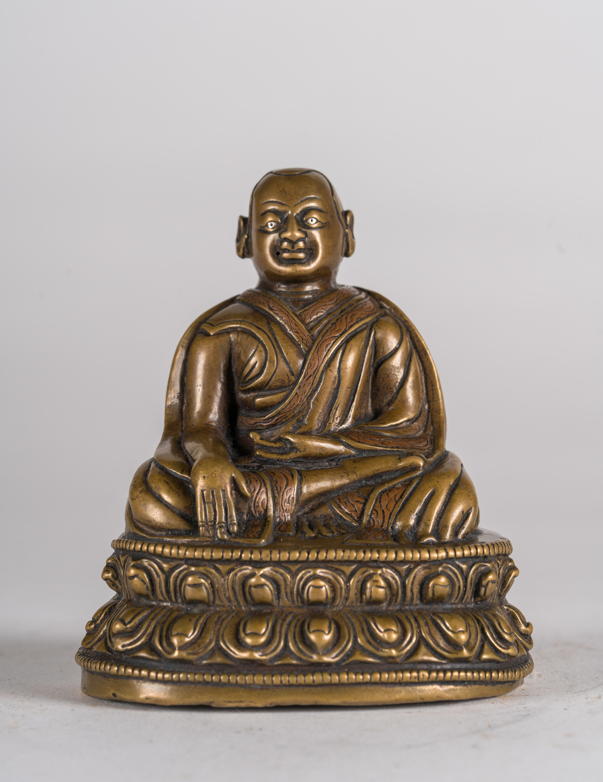 Tibet, XIV secolo . . Cm 8,00 x 9,30. Fusione in bronzo raffigurante maestro di scuola Kagyu, seduto in posizione padmasana su una base a doppio fiore di loto. La figura tiene la mano sinistra adagiata in grembo nel gesto avakasamudra e la destra in bhumisparsamudra. Presenta riporti in rame sui bordi della veste monacale ed in argento in corrispondenza delle pupille.
