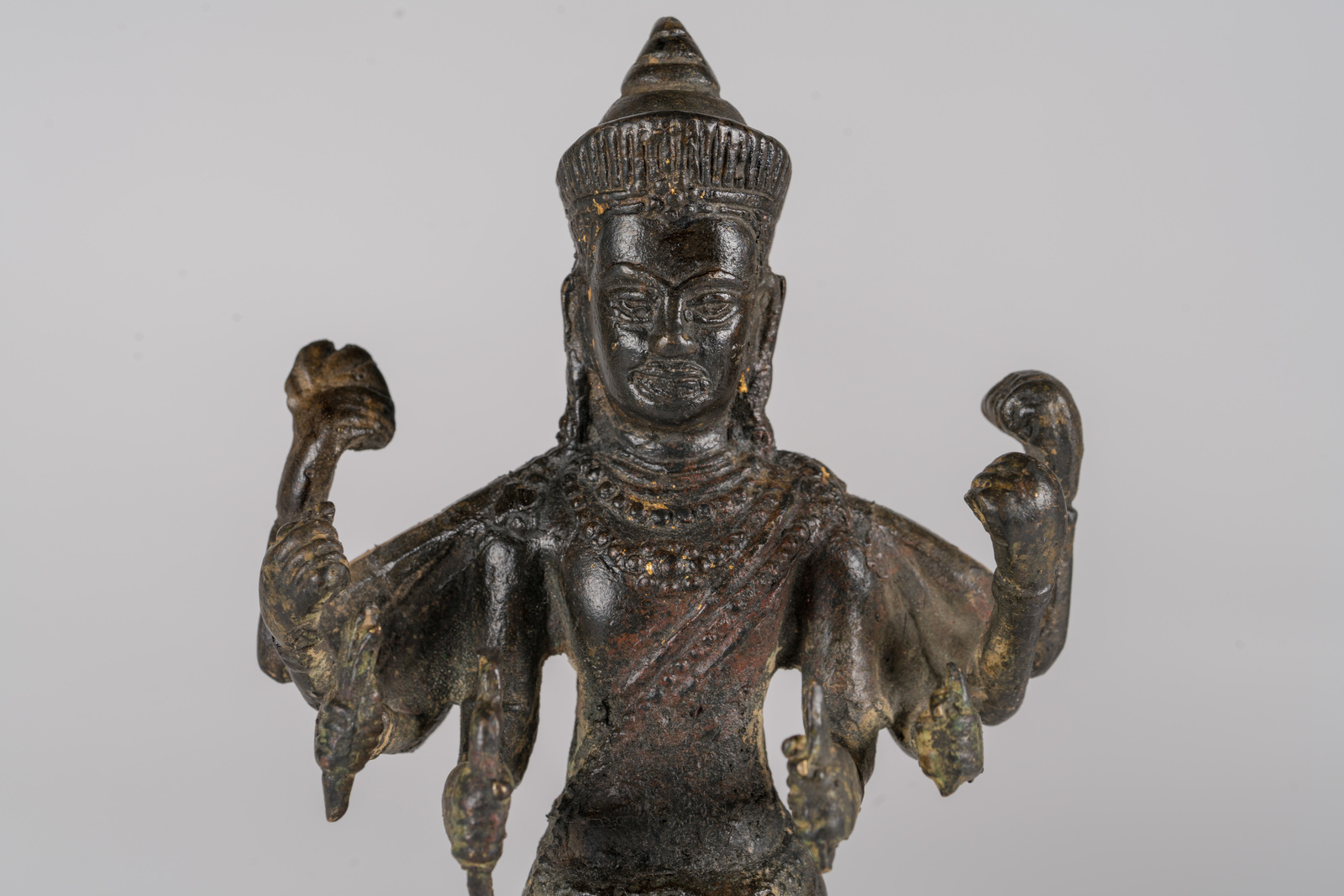 Vietnam, arte champa, area Dong-du'o'ng, XVII secolo. . Cm 9,00 x 21,00. Fusione a patina scura raffigurante un personaggio storico divinizzato in postura stante, caratterizzato da sei braccia, ognuna delle quali brandisce un attributo. Gli stilemi estetici sono riconducibili all'ultimo regno Po-Rome.