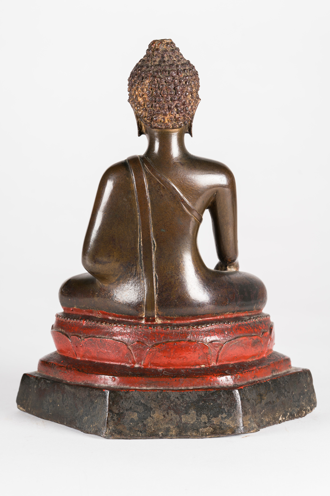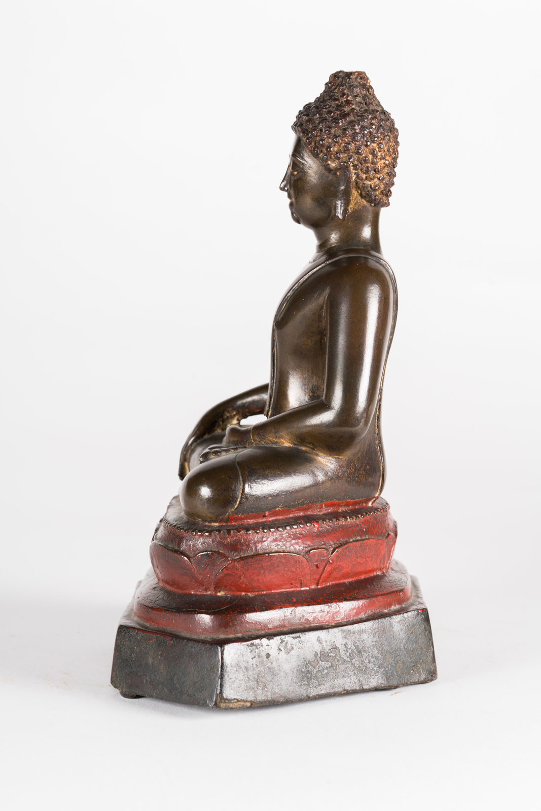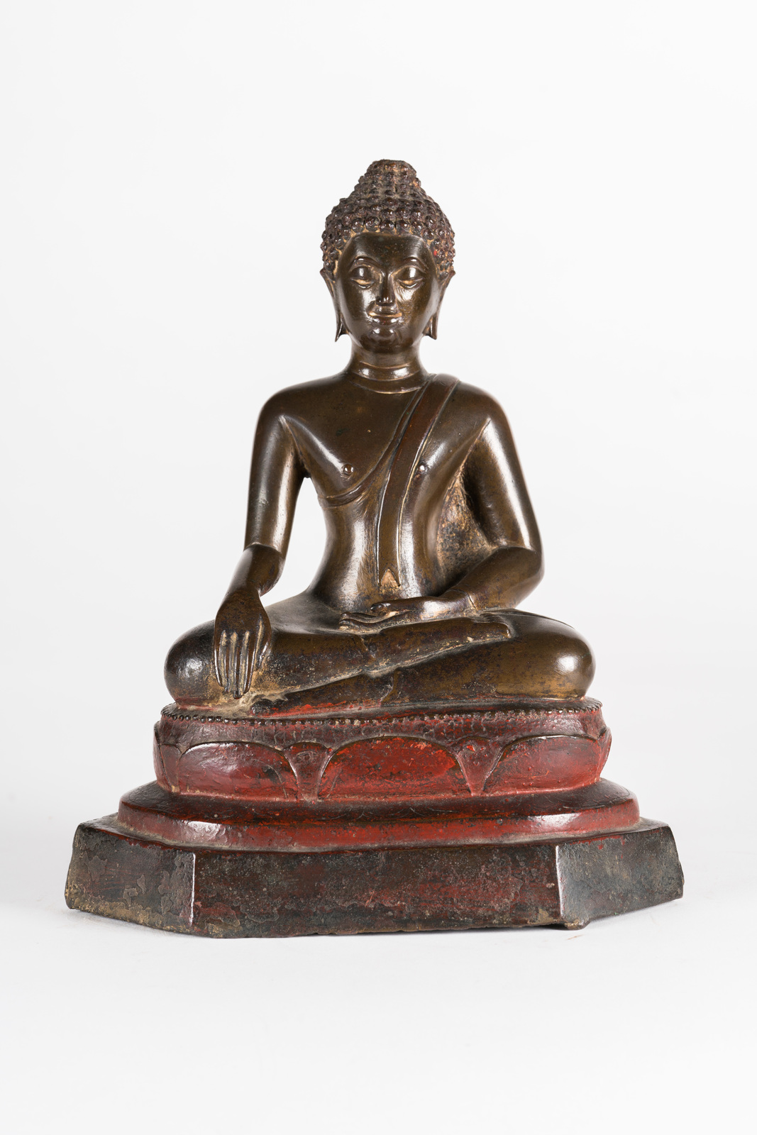 Thailandia settentrionale, provincia Chiang Mai, fine XV - inizio XVI secolo . . Cm 23,00 x 27,50. Fusione raffigurante il Buddha storico seduto in posizione padmasana su una base a fiore di loto singolo laccata di rosso. La mano sinistra adagiata in grembo nel gesto avakasamudra, la destra nel gesto di contatto con la terra bhumisparsamudra. La resa della veste e del volto, dai morbidi lineamenti, è riconducibile alla scuola del regno Lan'na.
