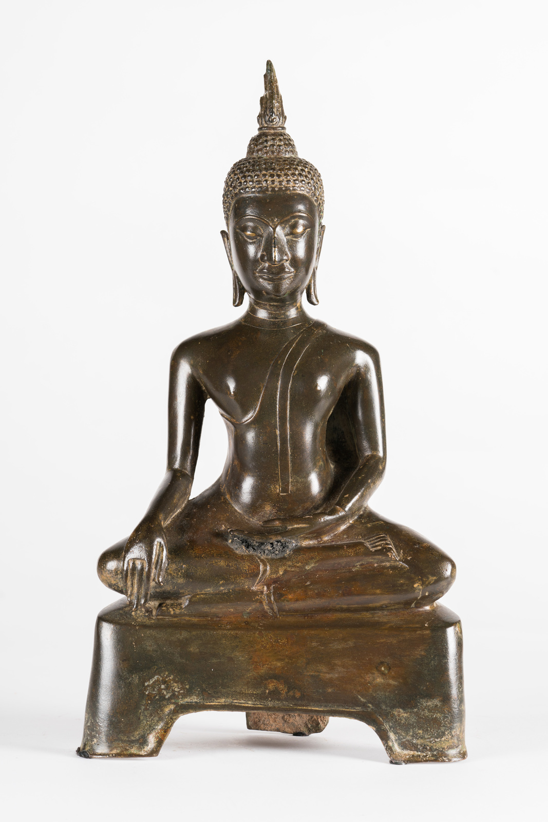 Thailandia, primo periodo Ayutthaya, XV - XVI secolo . . Cm 22,00 x 39,00. Fusione in bronzo raffigurante il Buddha storico seduto in posizione padmasana su una base tripode; la mano sinistra in avakasamudra e la destra in bhumisparsamudra.
