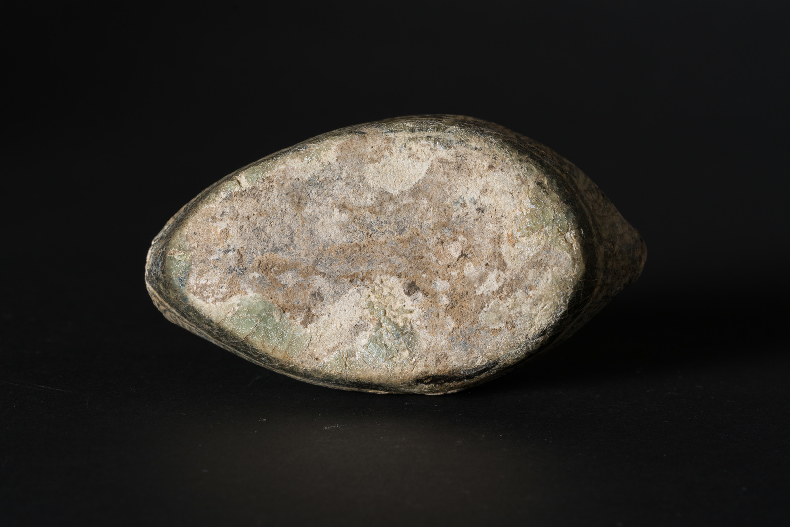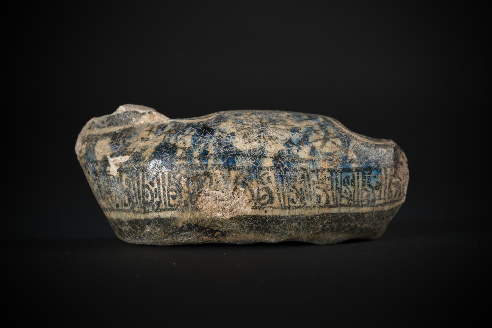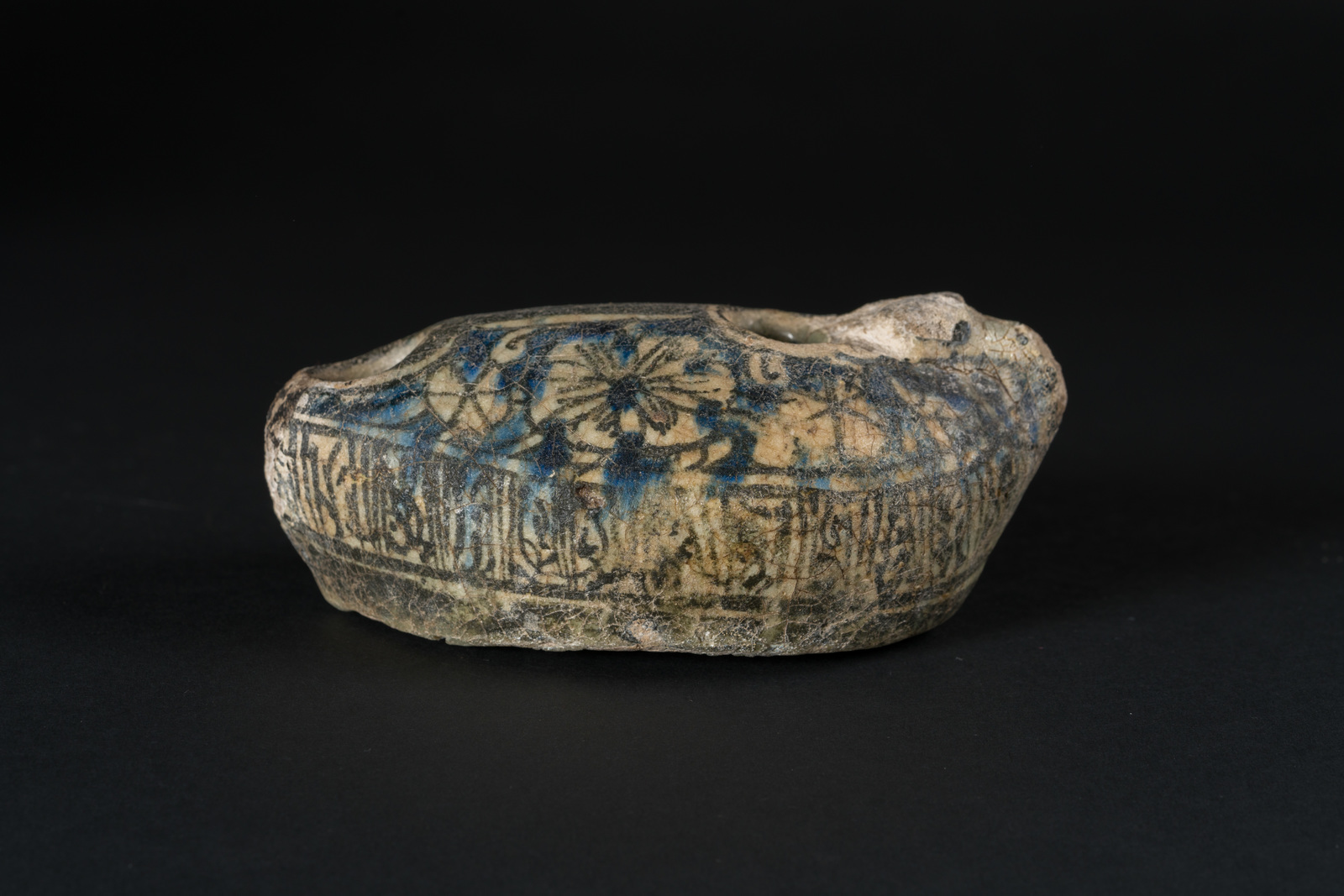 Vicino Oriente, XII - XIII secolo . . Cm 12,00 x 5,50. Dalla caratteristica forma a barca, mancante di impugnatura. La superficie dipinta con fiori stlizzati neri e pseudo calligrafie con tocchi di blu cobalto. Fine craquelé ed iridescenza.
