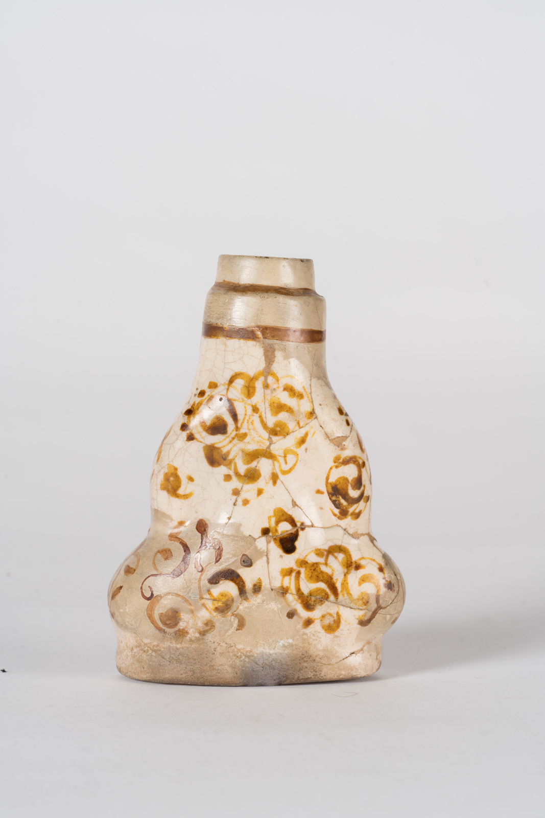 Iran Samanide, probabilmente Nishapur, X secolo . . Cm 25,00 x 8,00. dalla tradizionale forma troncoconica, poggiante su disco, le pareti ricoperte di ingobbio rosso e dipinte con piccoli motivi circolari in sequenza concentrica.