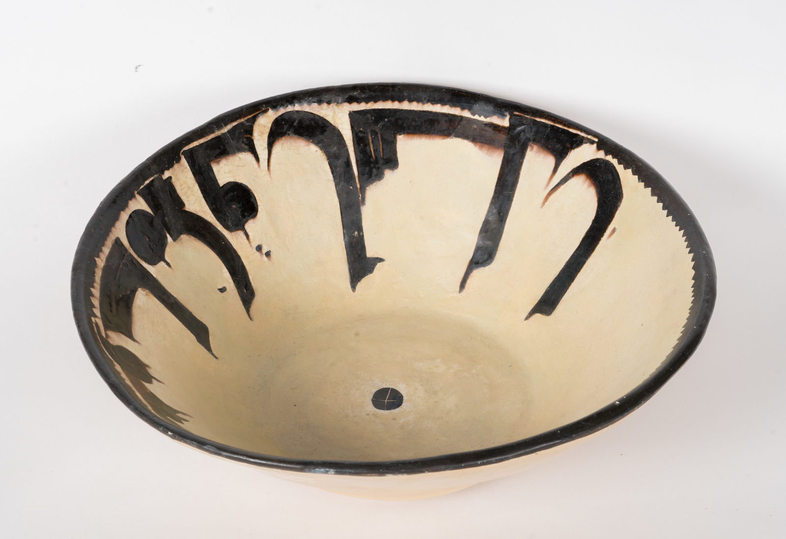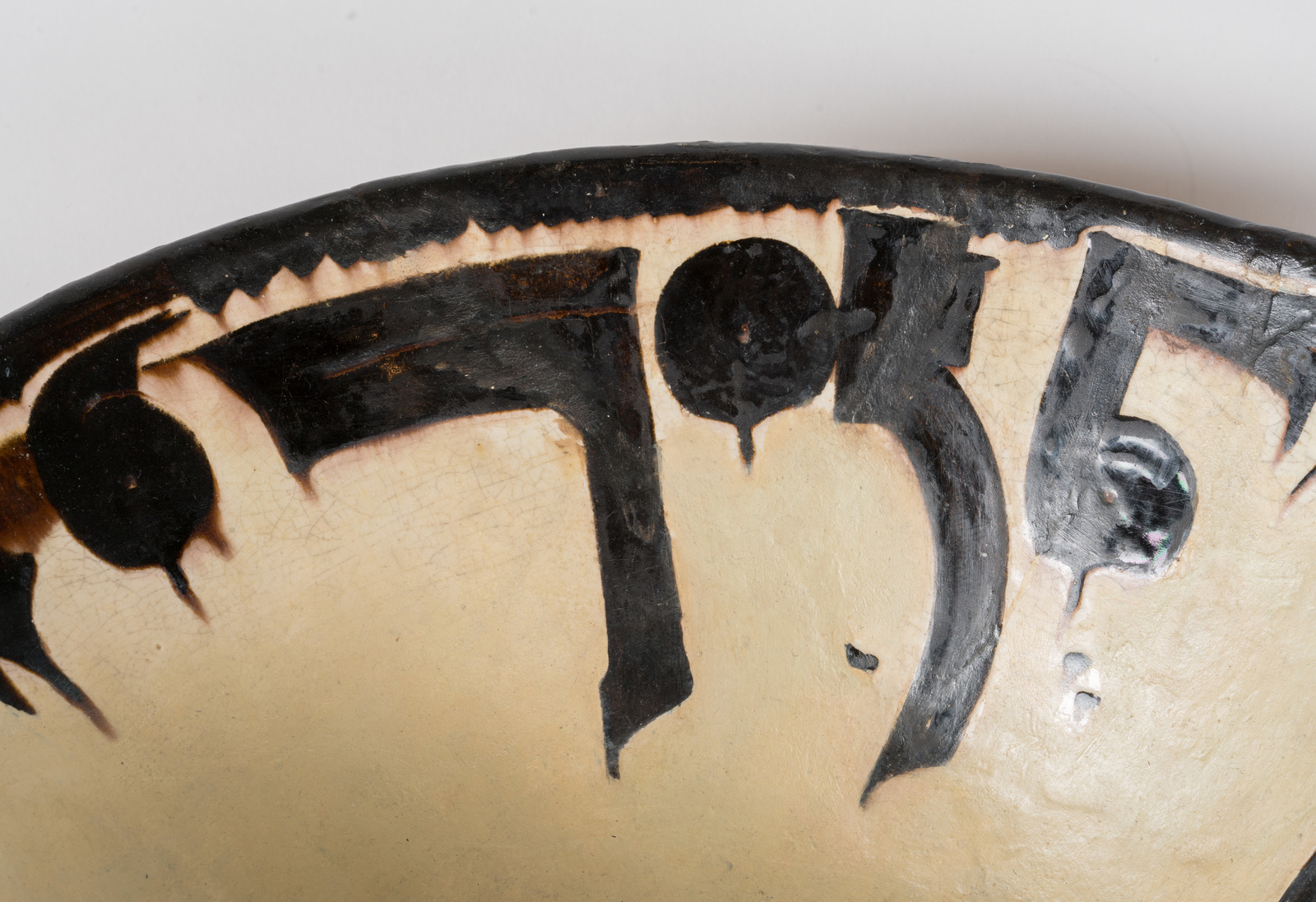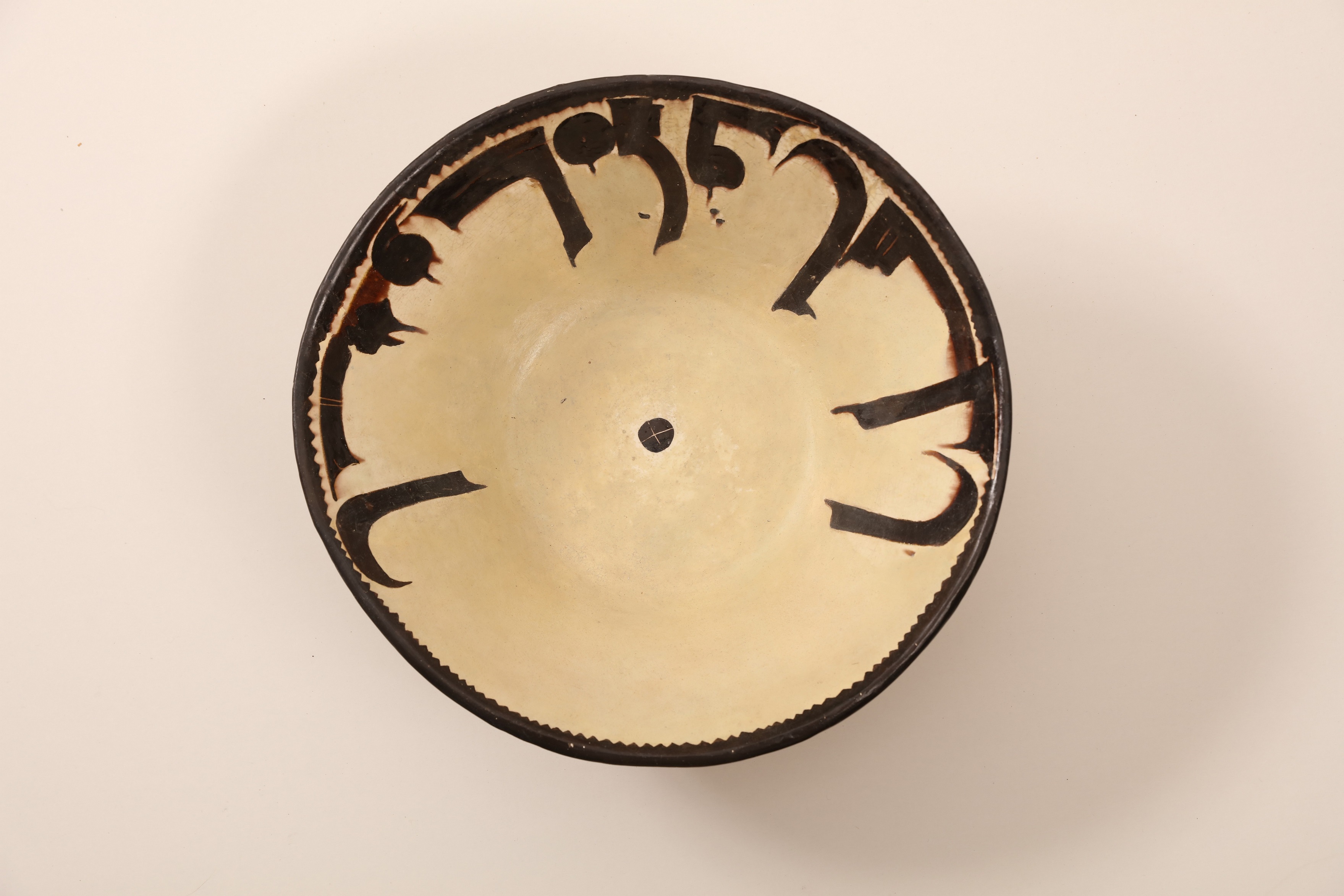 Islamic Art A large earthenware slip painted bowl with epigraphic decoration