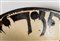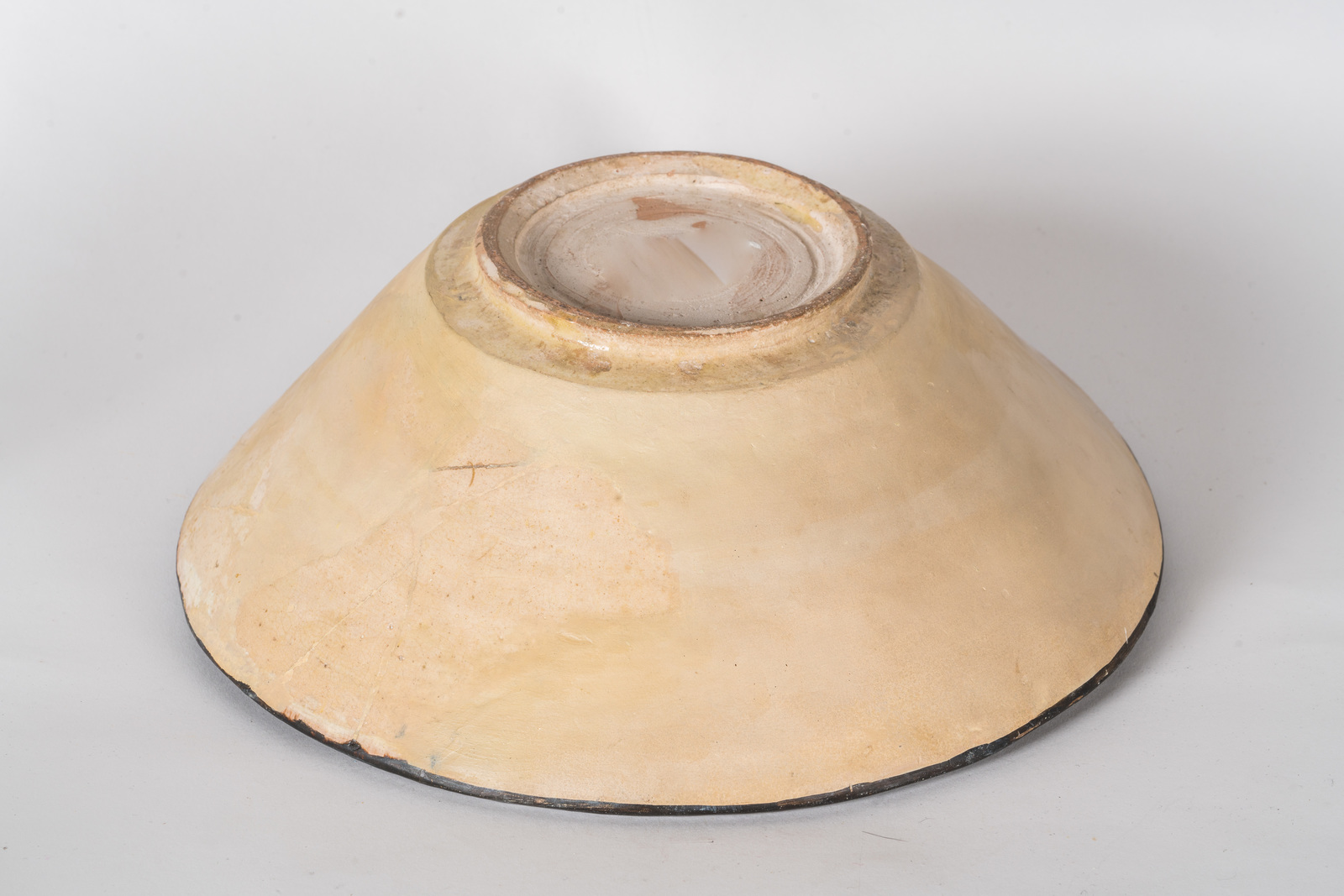 . . Cm 33,50. di forma troncoconica, il corpo ricoperto di ingobbio bianco e dipinto internamente con ampia calligrafia in manganese. Il bordo è ulteriormente decorato a smerlo ed il centro dell'oggetto è sottolineato da un punto. Ricoperto di vetrina trasparente.
