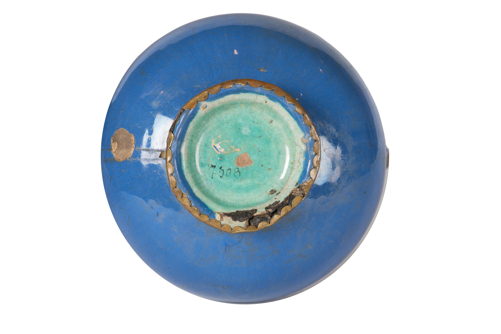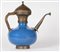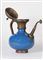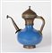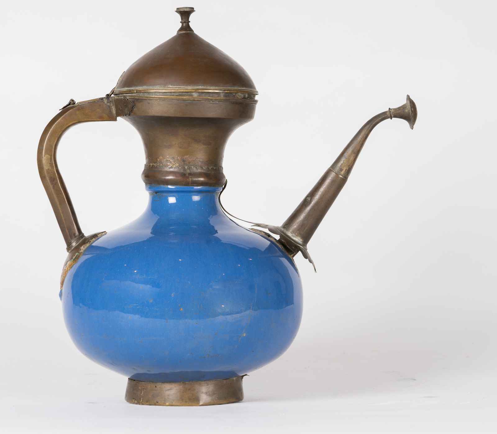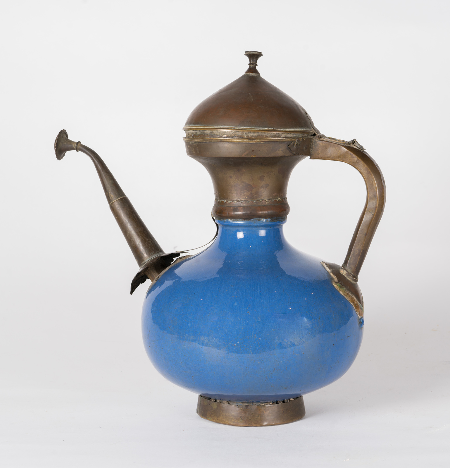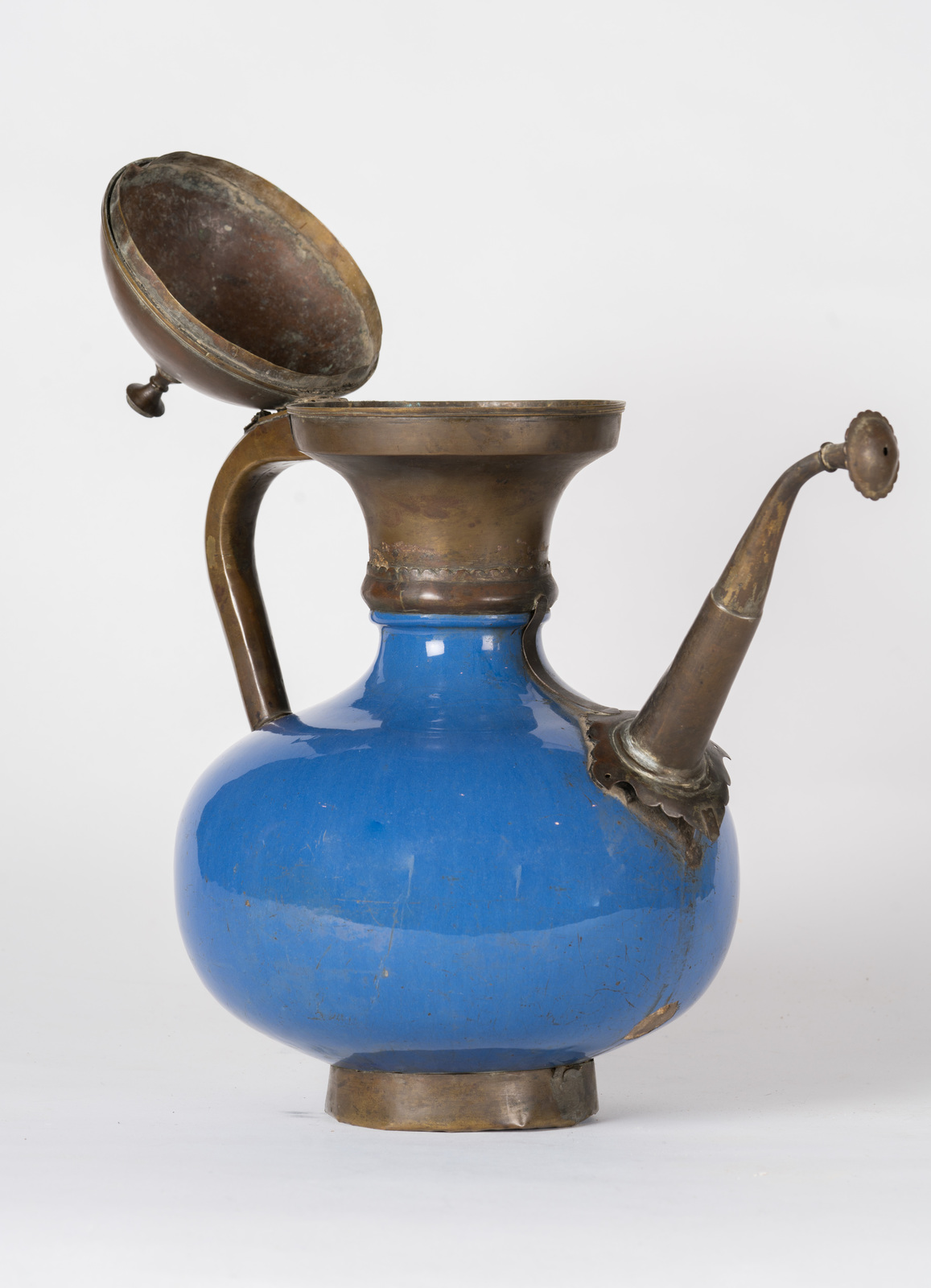 Iran, periodo Safavide, tardo XVII secolo . . Cm 37,00 x 39,00 x 23,00. Poggiante su disco, ampio corpo globulare interamente ricoperto di invetriatura blu lavanda. Il montaggio ottocentesco in ottone, comprendente piede, versatoio, manico e tappo a cupola ha trasformato il vaso in versatoio.