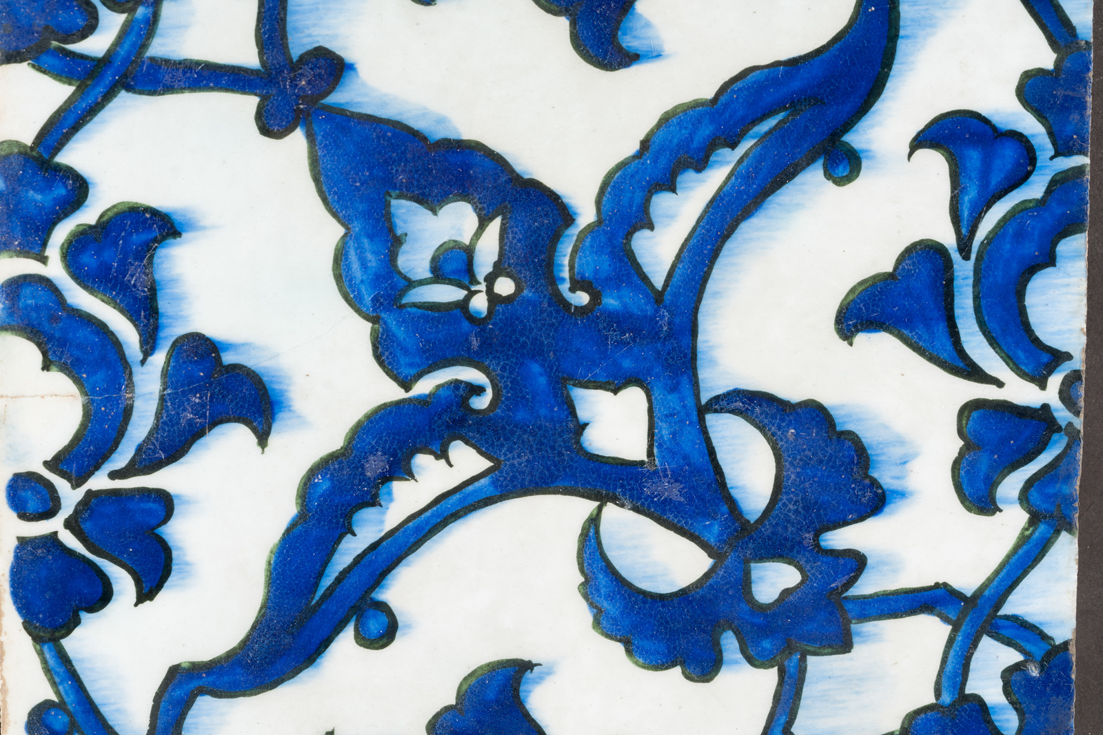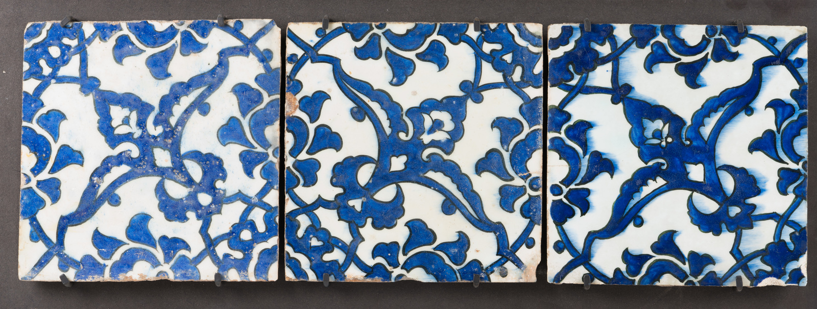 Arte Islamica Tre mattonelle Dome of the Rock in ceramica bianca e blu Impero Ottomano, Damasco, XV secolo . . Cm 19,50 x 19,50. montate su unico pannello, le tre mattonelle quadrate mostrano identica decorazione di palmette ed arabeschi dipinti in blu sotto vetrina trasparente nello stile denominato della Cupola della Roccia, il santuario di Gerusalemme che Solimano il Magnifico fece ristrutturare a metà del XVI secolo. Per un esemplare comparativo si veda quello conservato al Louvre (MAO2191).