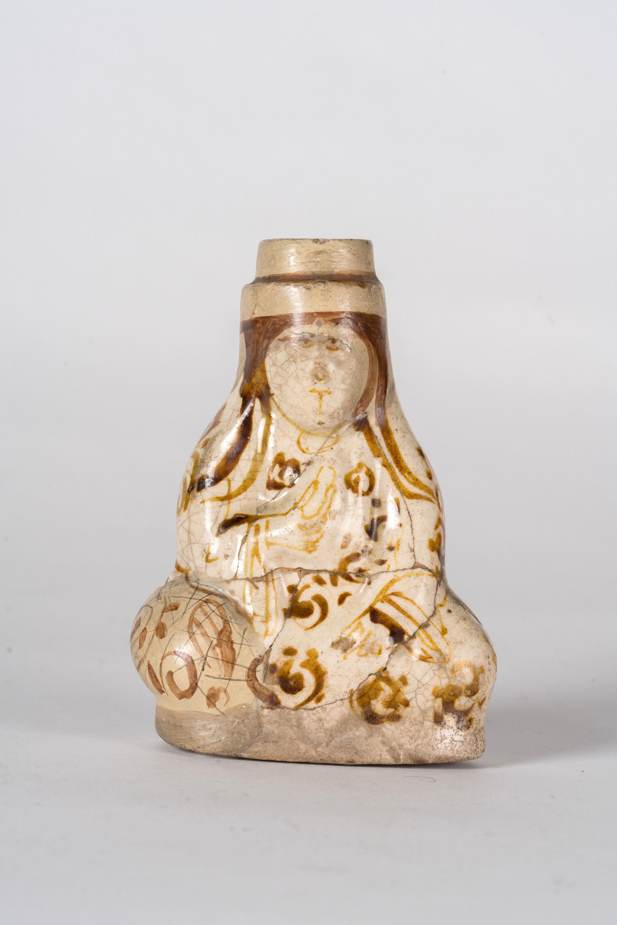 Islamic Art A moulded pottery bottle in the shape of a seated figure painted with lustre Seljuk Eastern Iran, 12th century . . Cm 12,00. Stopper missing. Provenance: formerly in the collection of Henry-René d'Allemagne.