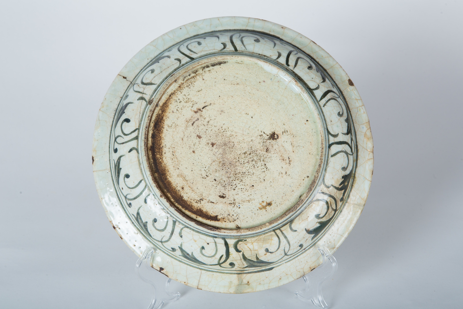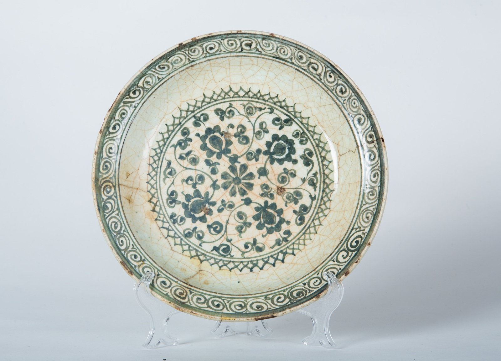 Arte Islamica Piatto timuride in ceramica Persia, dinastia timuride, XV secolo . . Cm 28,00. Poggiante su disco, le pareti arrotondate e breve tesa piatta dipinta con motivo a onde. Il tondo centrale decorato con cinque fiori tra tralci dipinti in blu cobalto sotto invetriatura trasparente.