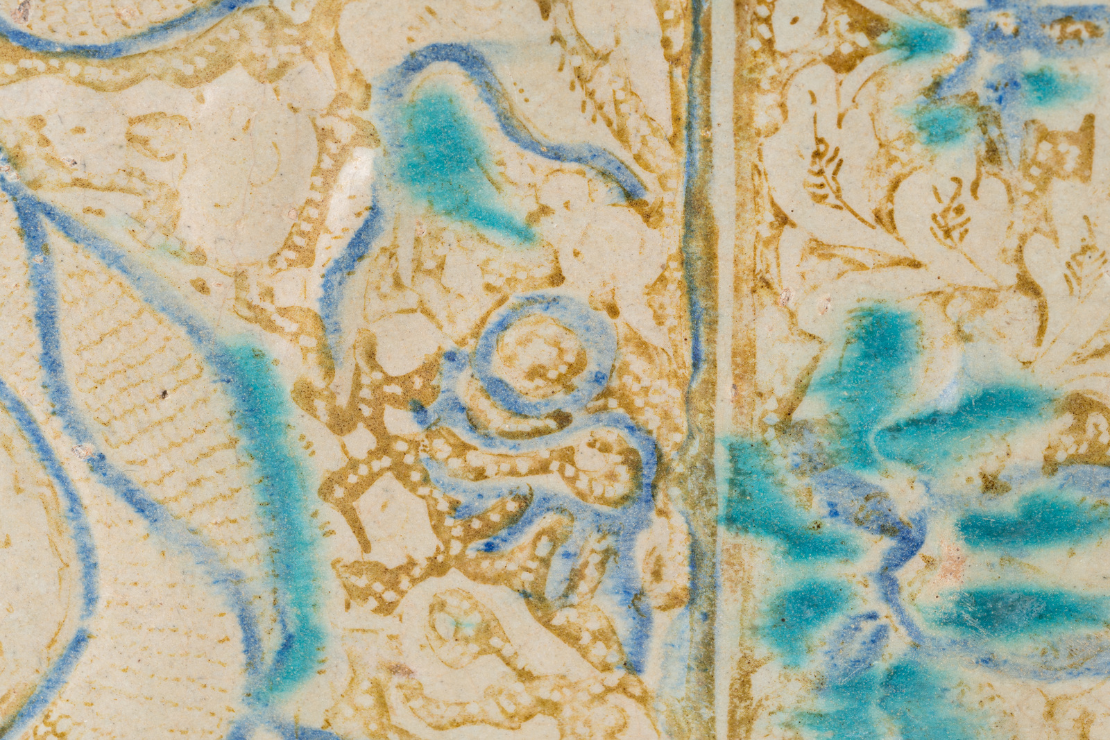 Iran, Kashan, tardo XIII secolo . . Cm 34,00 x 34,00. Corpo in pasta silicea, forma quadrata, caratterizzata dalla decorazione stampata a rilievo e dipinta con arabeschi e volute vegetali in riserva su lustro. Tocchi di blu e turchese sottocoperta, una linea blu cobalto disegna anche il profilo di un drago che anima il registro principale dell'oggetto.